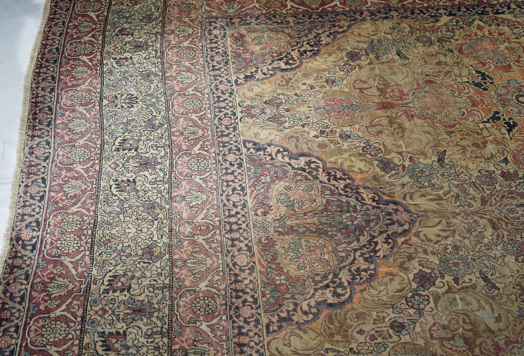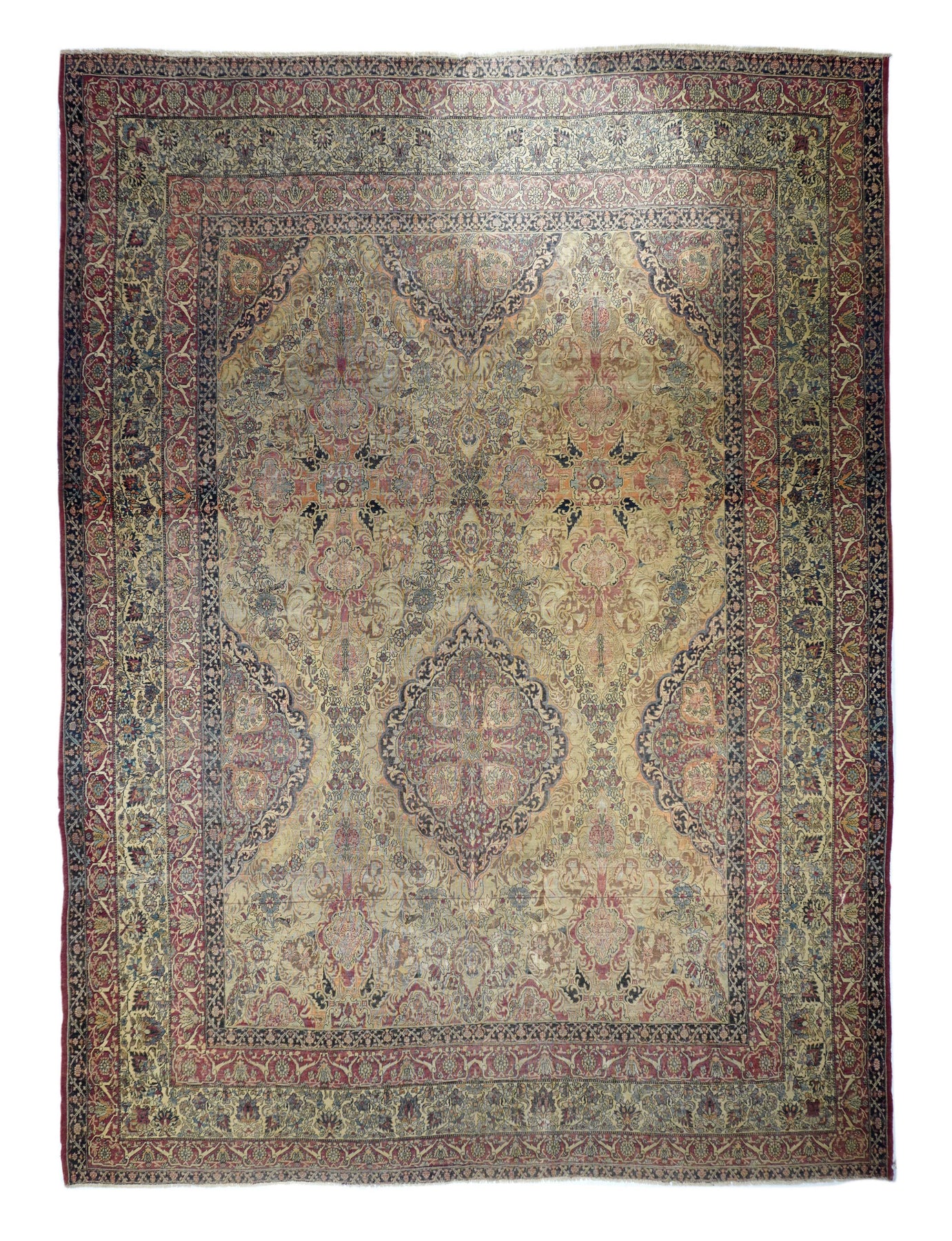 A trade term applied to better quality pre-WWI Kermans. ‘Laver’ is corruption of ‘Ravar’, a town near Kerman city, reputed to have woven some of the finest and best Revival Period Kermans. Scatter to mansion sizes. Cotton foundations, Fine to very fine. Natural dyes only. Expensive to really expensive.