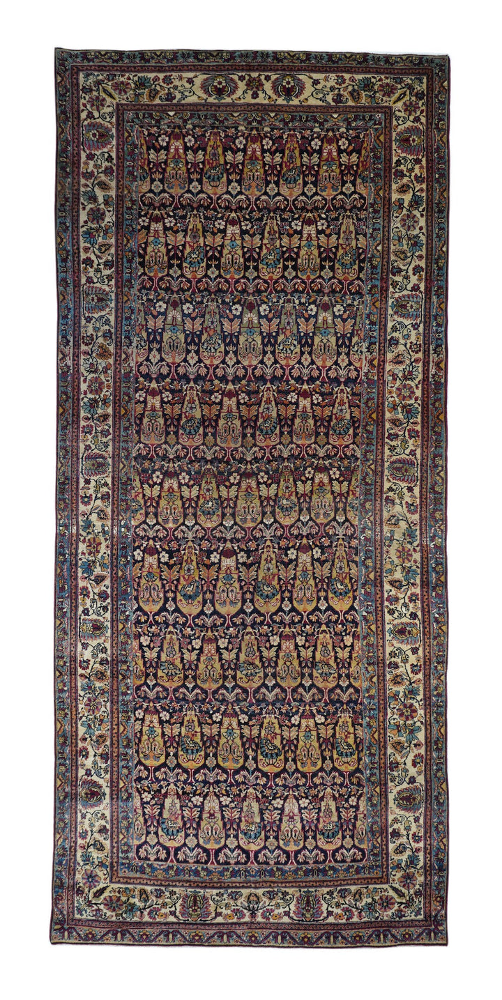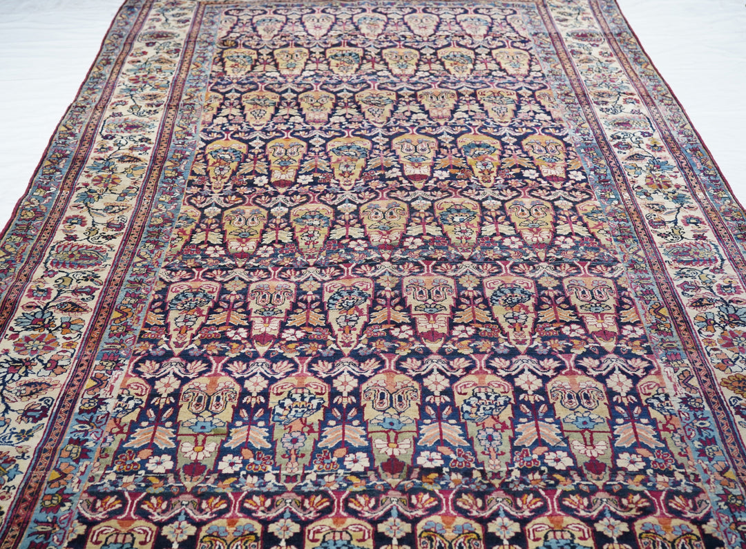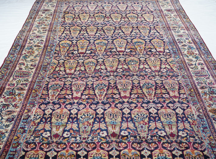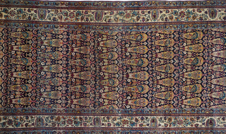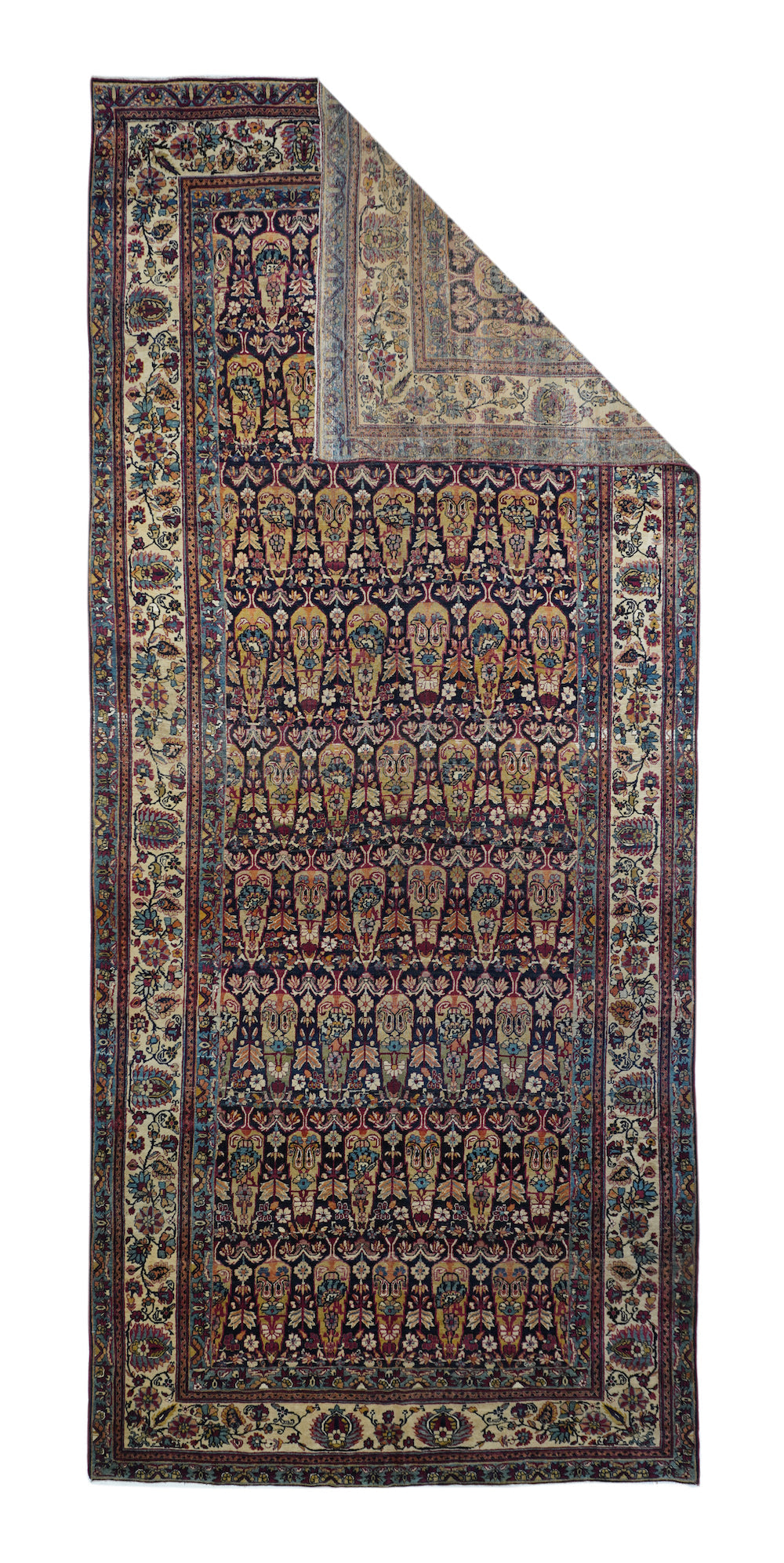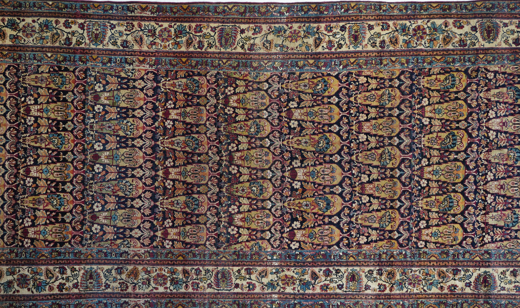 Nine offset rows of cypress trees are separated by leaves and flowers on the deep navy indigo ground of this. Paired botehs alternate with petaled fan flowers on the yellow-green cypresses. Ecru border of multi-petal “beehive” palmettes separated by long floral tendrils elaborated with tiny botehs. Cotton foundation.