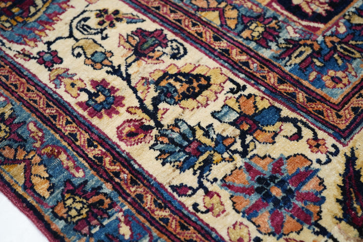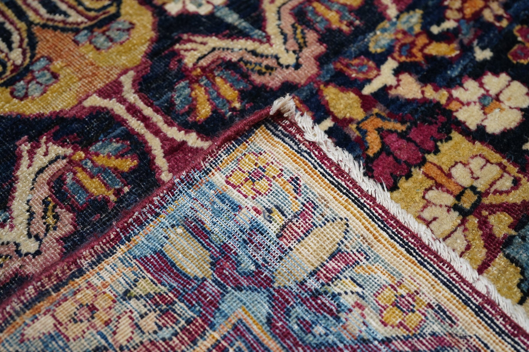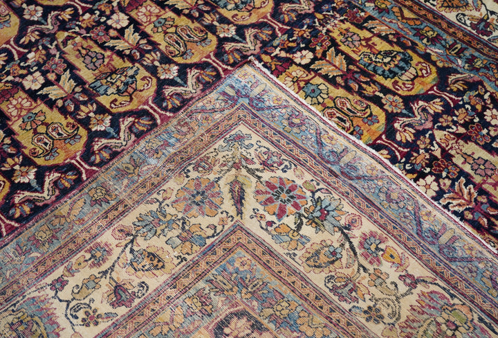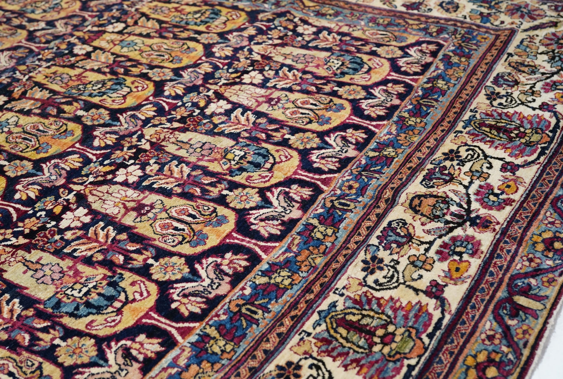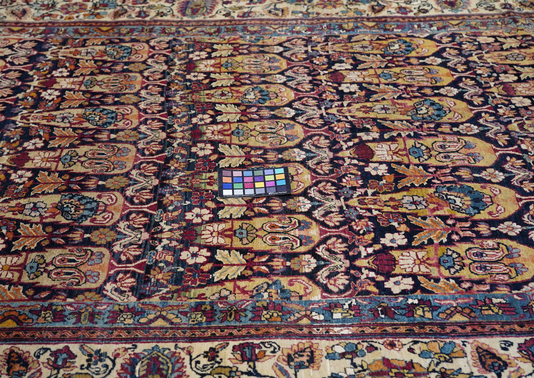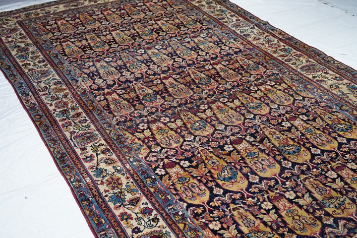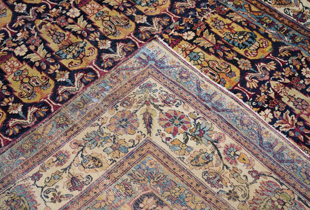 Nine offset rows of cypress trees are separated by leaves and flowers on the deep navy indigo ground of this. Paired botehs alternate with petaled fan flowers on the yellow-green cypresses. Ecru border of multi-petal “beehive” palmettes separated by long floral tendrils elaborated with tiny botehs. Cotton foundation.