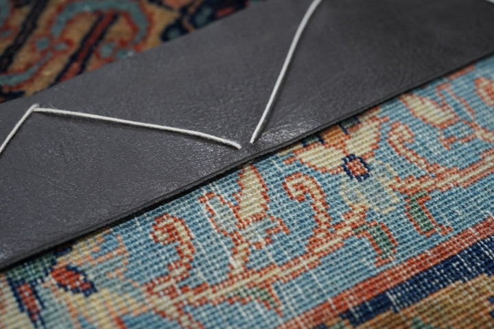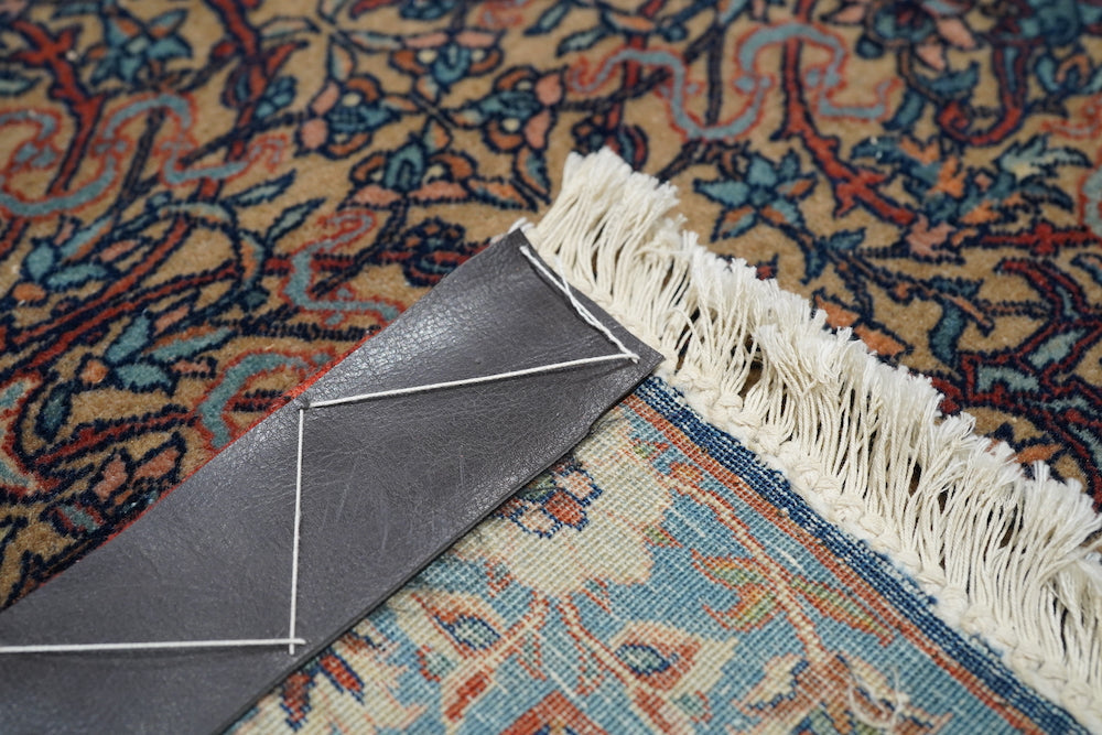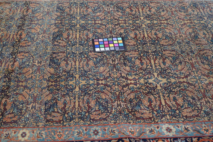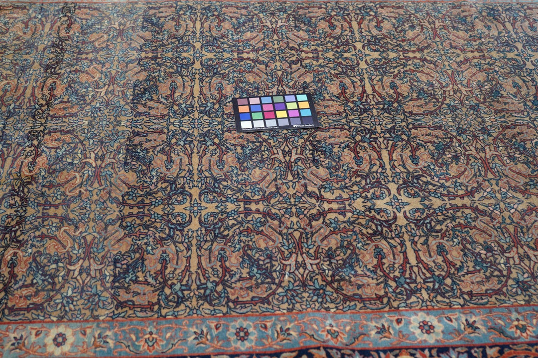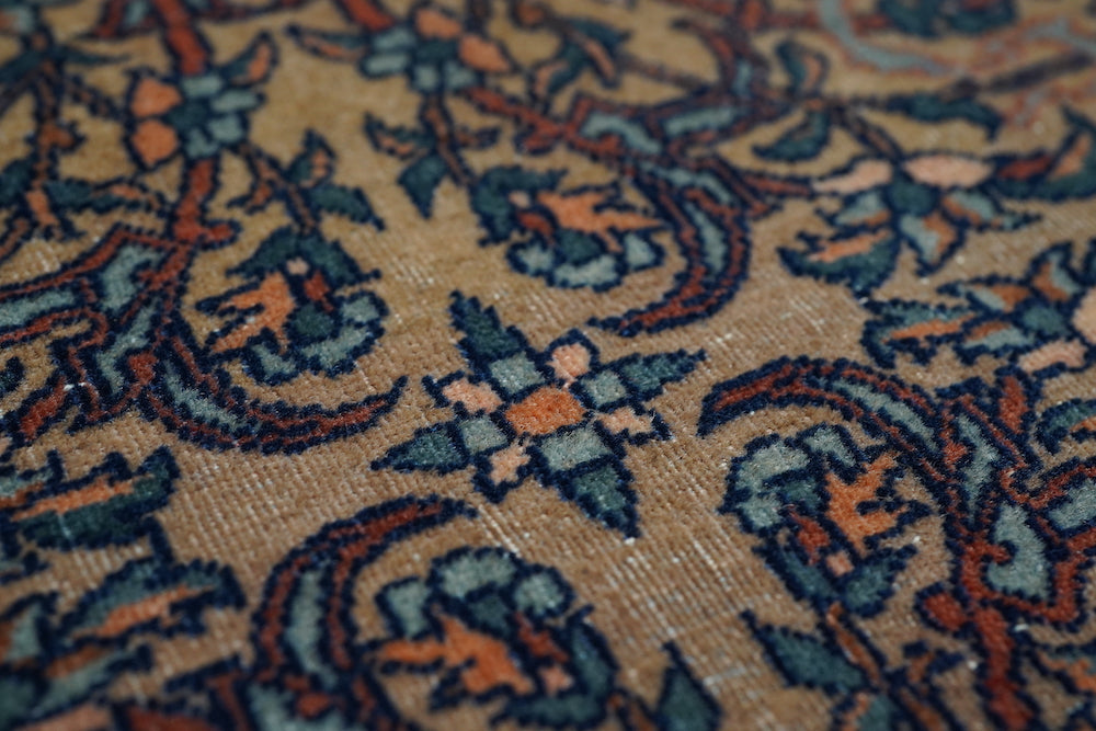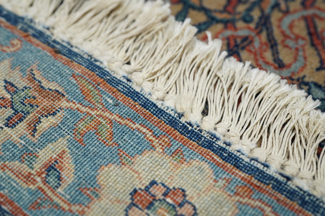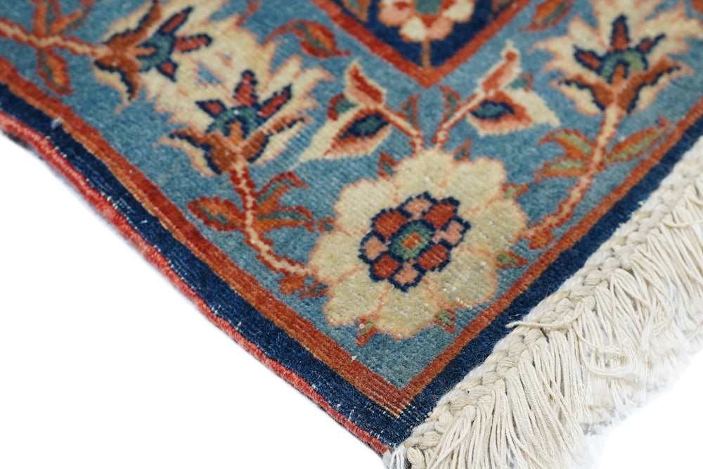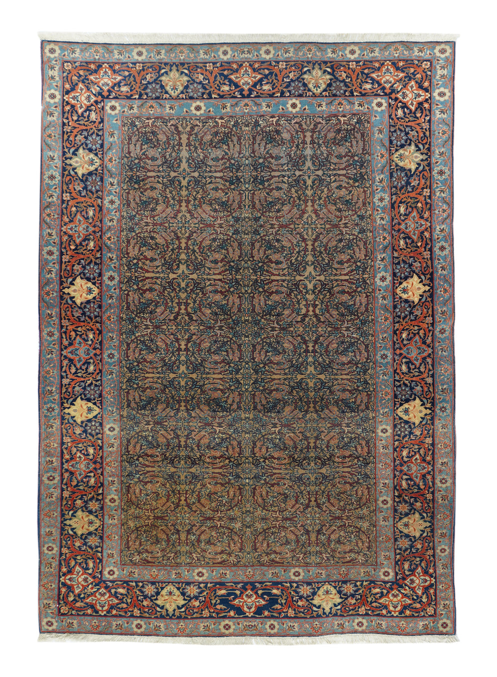 This unusual early 20th century central Persian town scatter shows a rusty salmon field very closely covered with a four by nine array of tightly coiled spiral arabesques, accented by cloud bands, palmettes and florets. Navy border with escutcheon palmettes an forked, scrolling arabesques. Pale blue minors with rosettes, palmettes and a vinery meander. Finely woven on cotton, good condition, velvety pile texture.