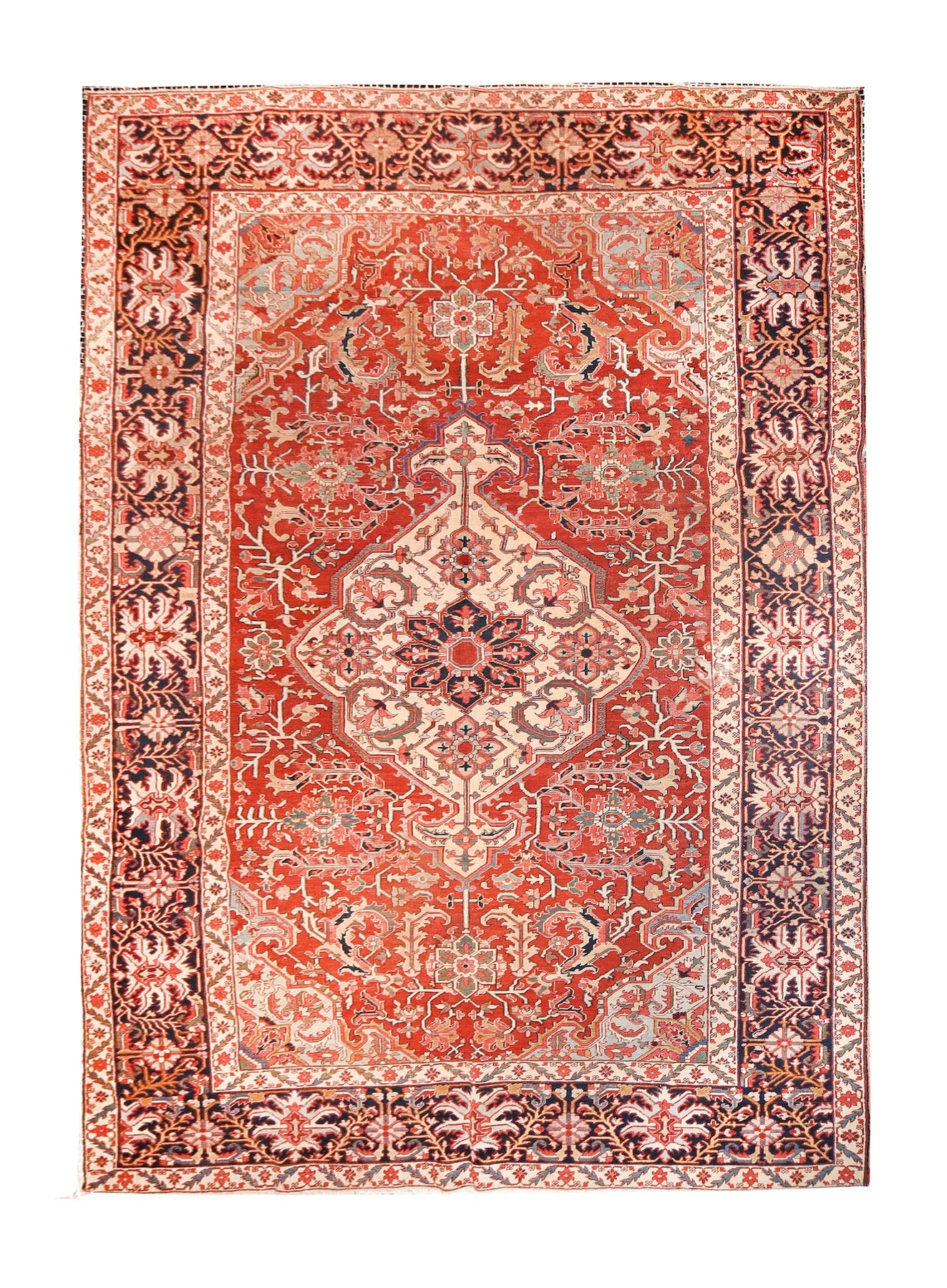 A higher grade of Heriz carpets, usually in medallion designs, with crisp natural dyes, and primarily woven between 1900 and 1930. Red field, navy border is the most popular combination. Semi-geometric. No town of ‘Serapi’. Robustly woven on cotton, with Turkish knots. Moderate weave. Expensive.