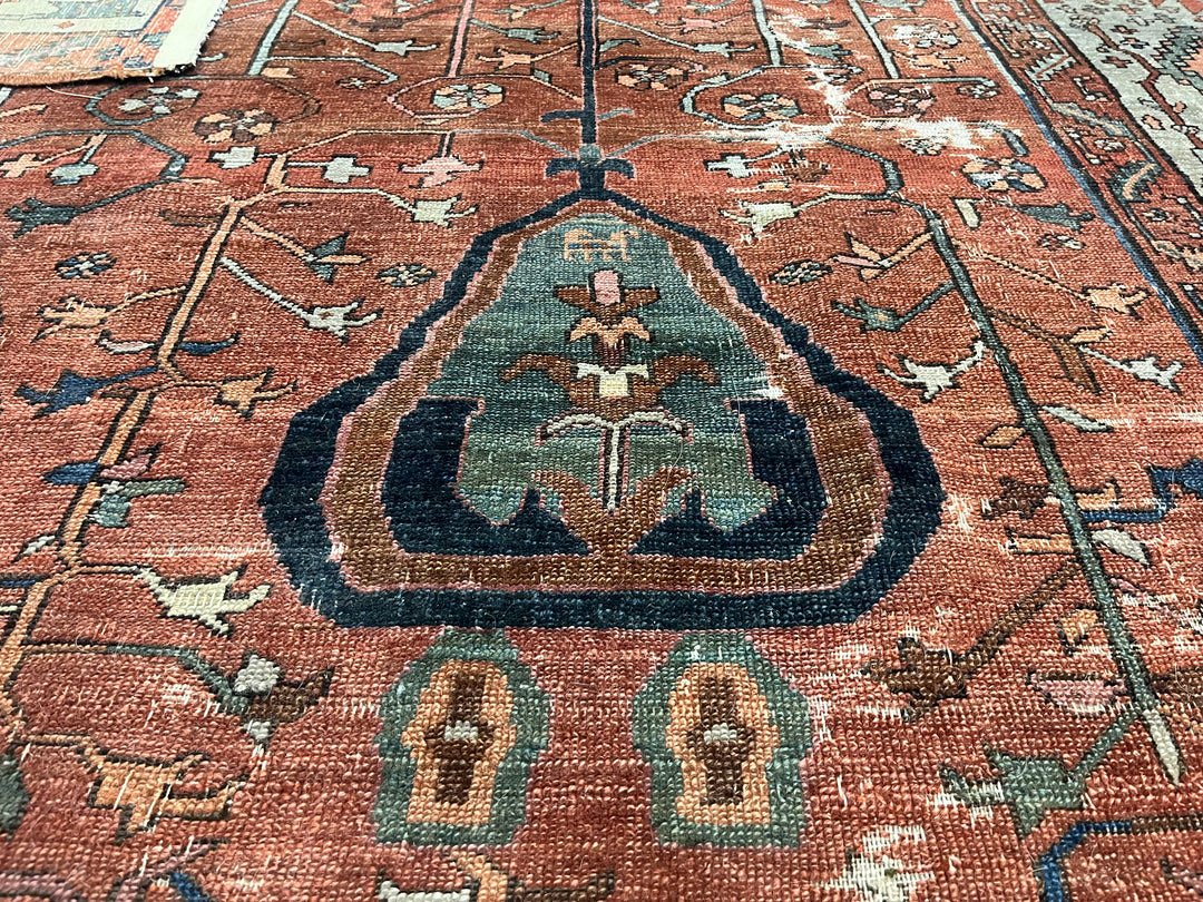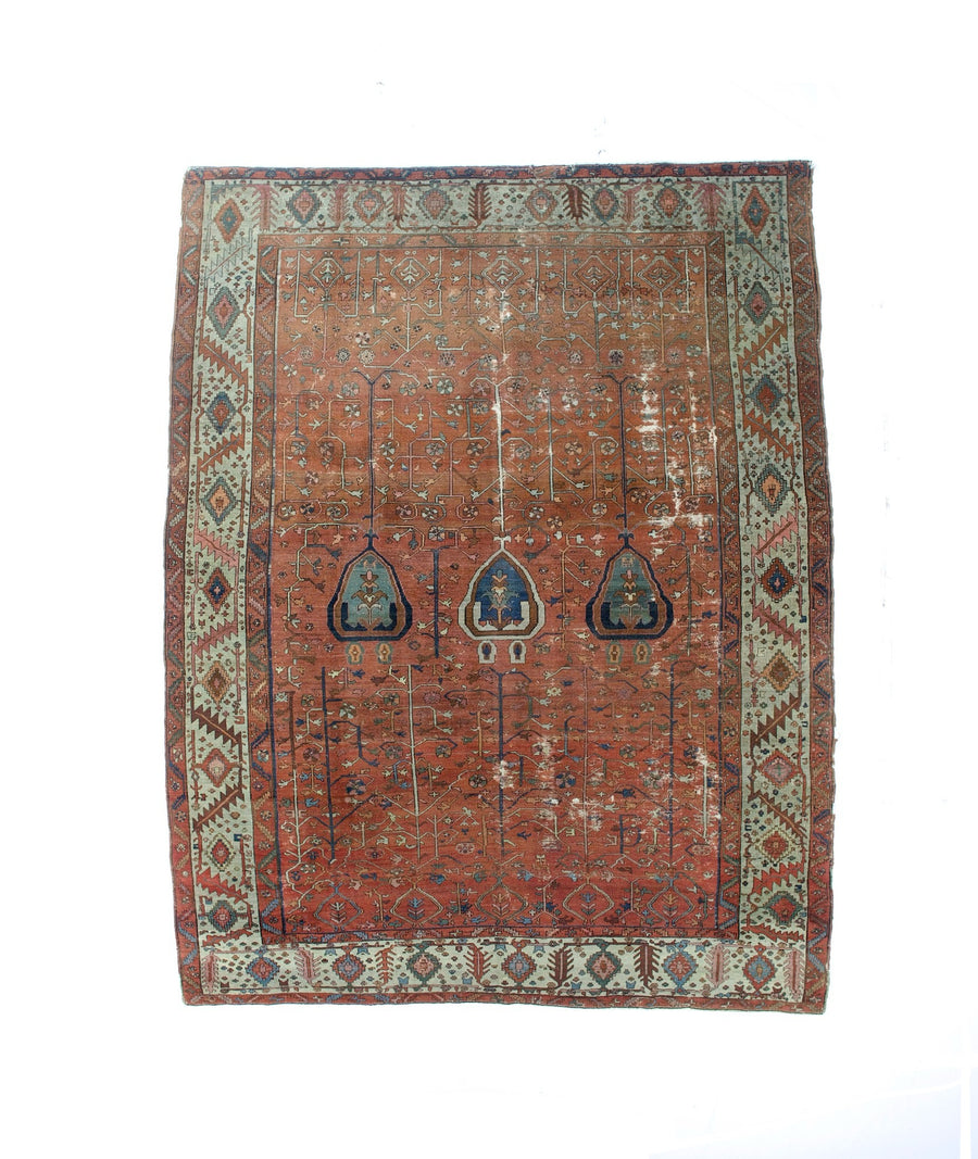 Generally in squarish sizes, allover patterns and coarse to moderate weaves, wool or mixed constructions; woven before 1900. Term is often extended to early medallion, later 19th century. Earlier pieces often have slightly more muted palettes employing rust, straw and lighter blues. Generally in carpet sizes, some scatters.