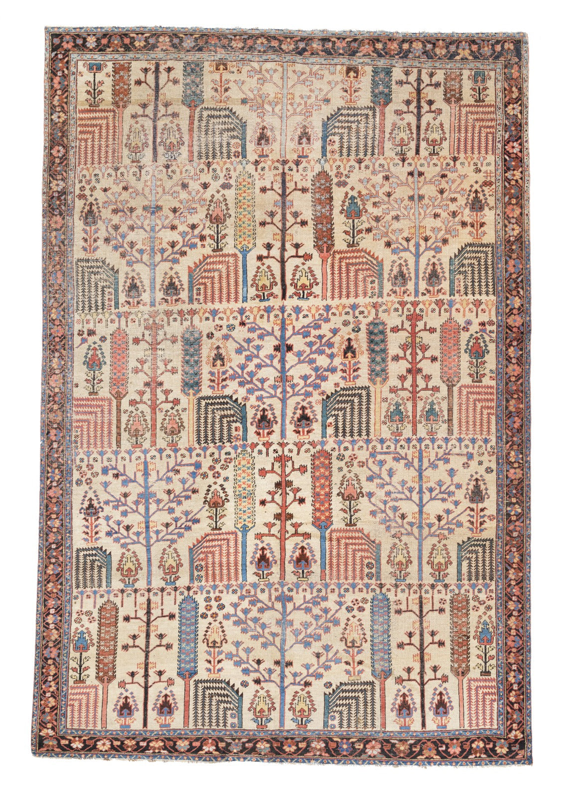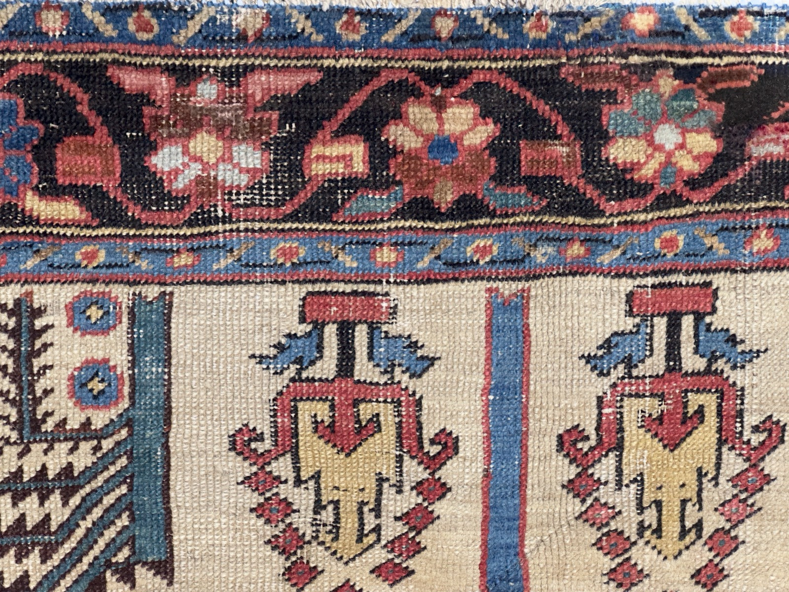 Generally in squarish sizes, allover patterns and coarse to moderate weaves, wool or mixed constructions; woven before 1900. Term is often extended to early medallion, later 19th century. Earlier pieces often have slightly more muted palettes employing rust, straw and lighter blues. Generally in carpet sizes, some scatters. Expensive