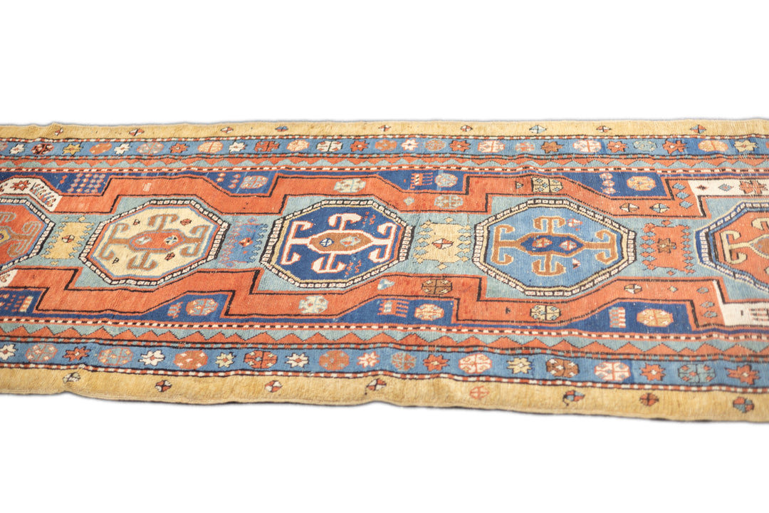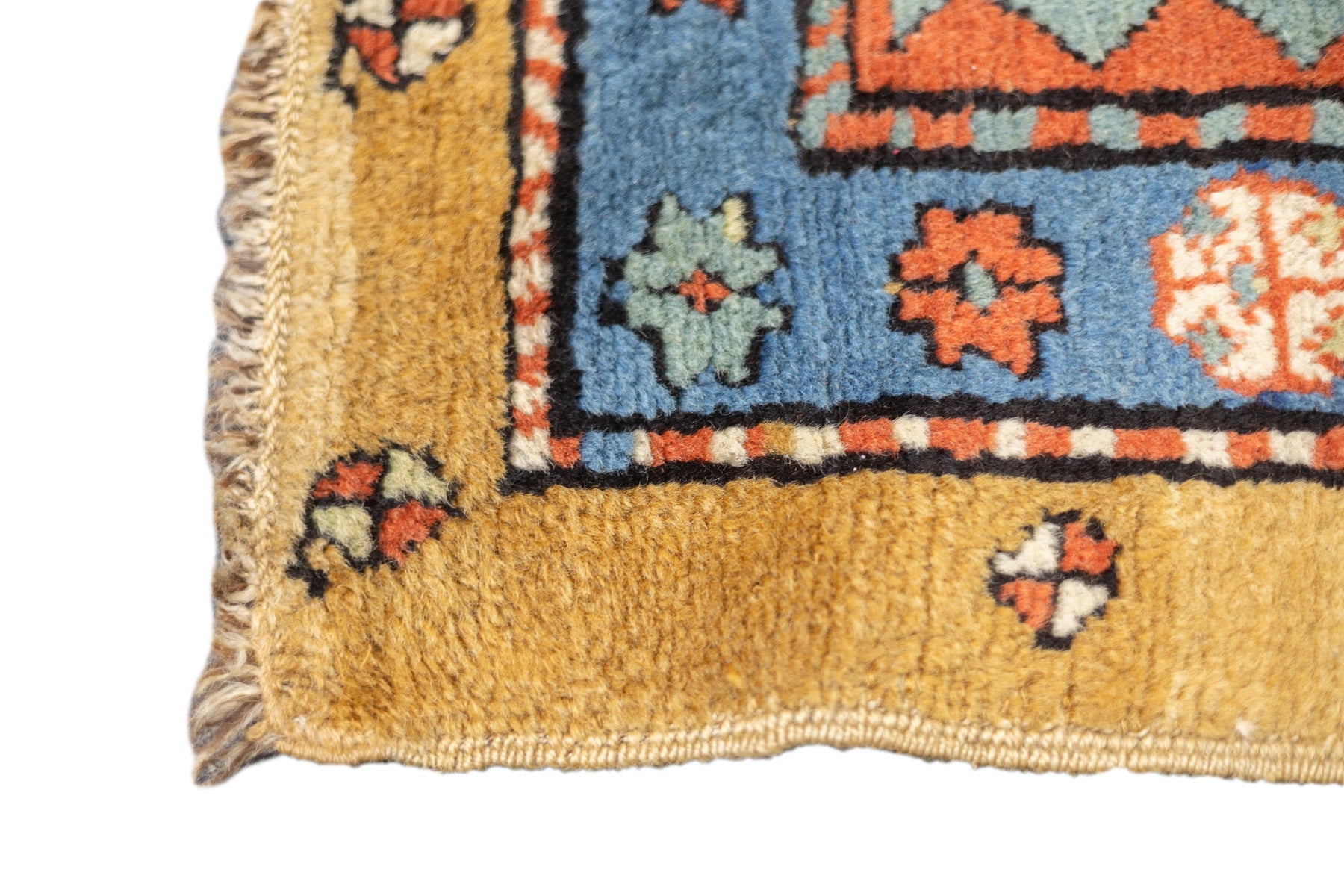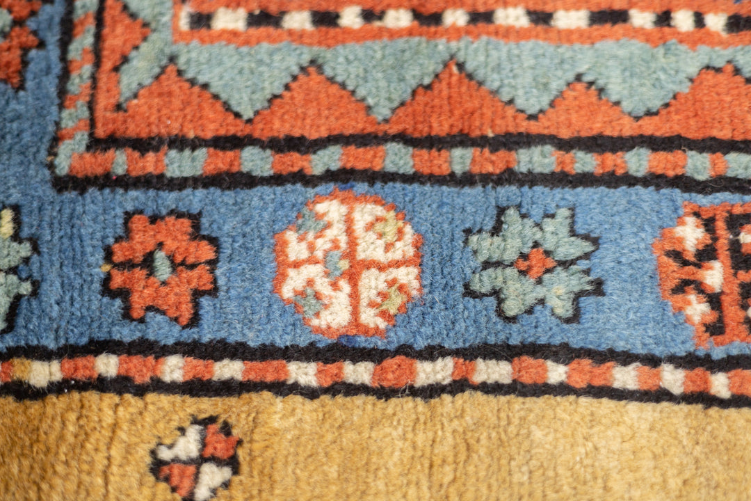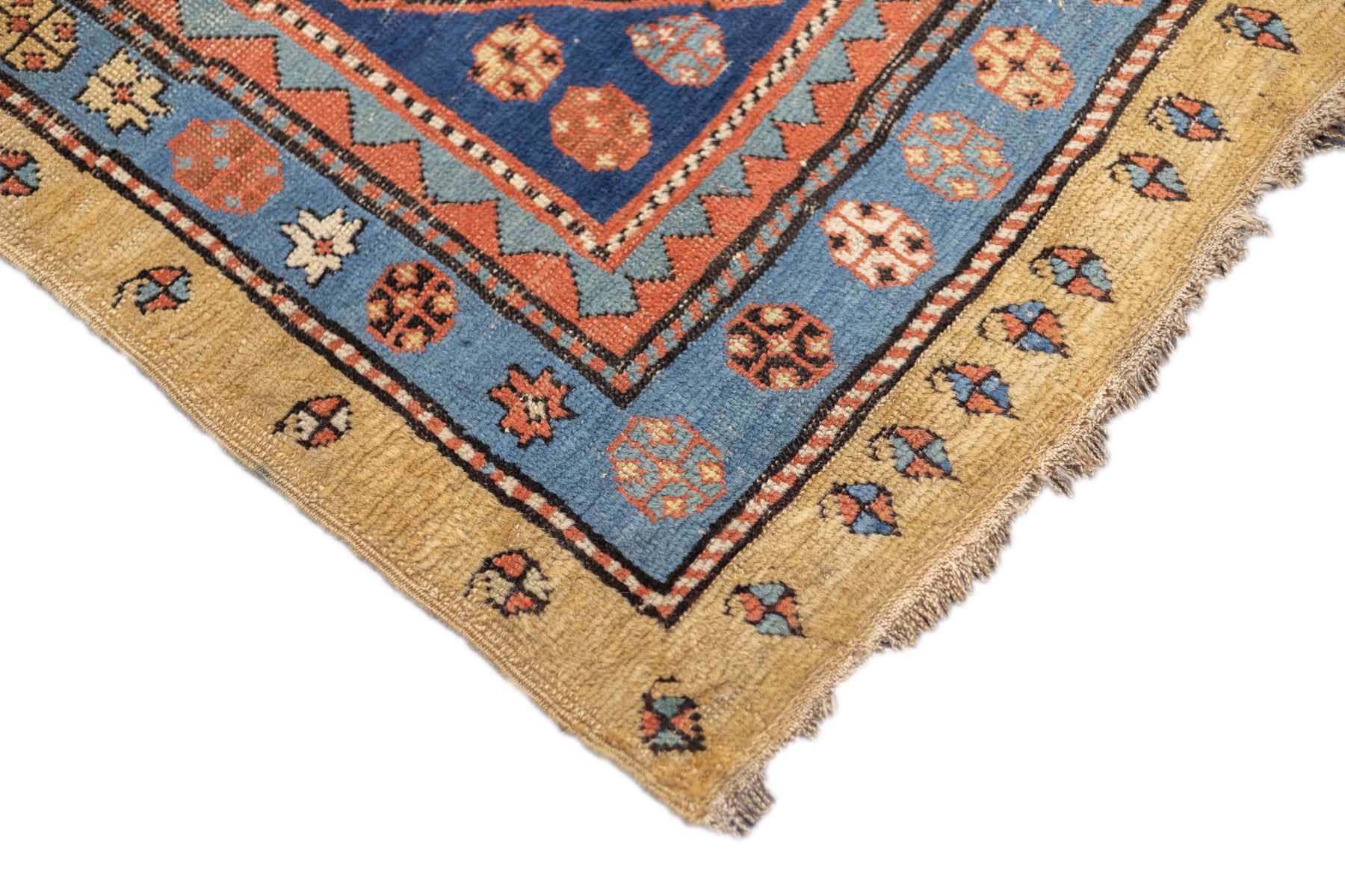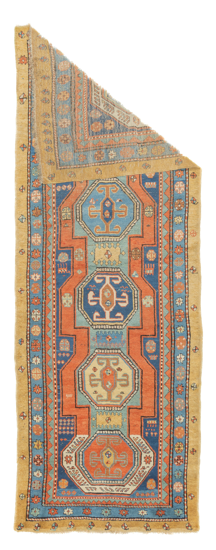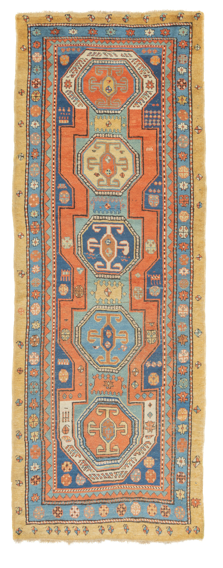 Generally in squarish sizes, allover patterns, and coarse to moderate weaves, wool, or mixed constructions; woven before 1900. The term is often extended to the early medallion, later 19th-century. Earlier pieces often have slightly more muted palettes employing rust, straw, and lighter blues. Generally in carpet sizes, some scatters.