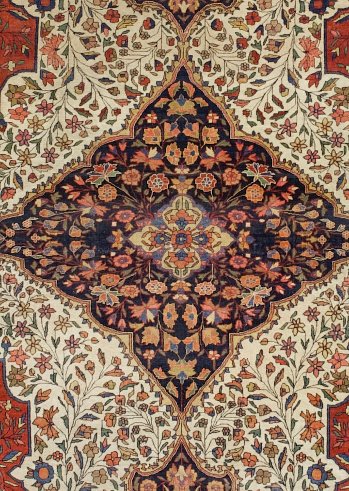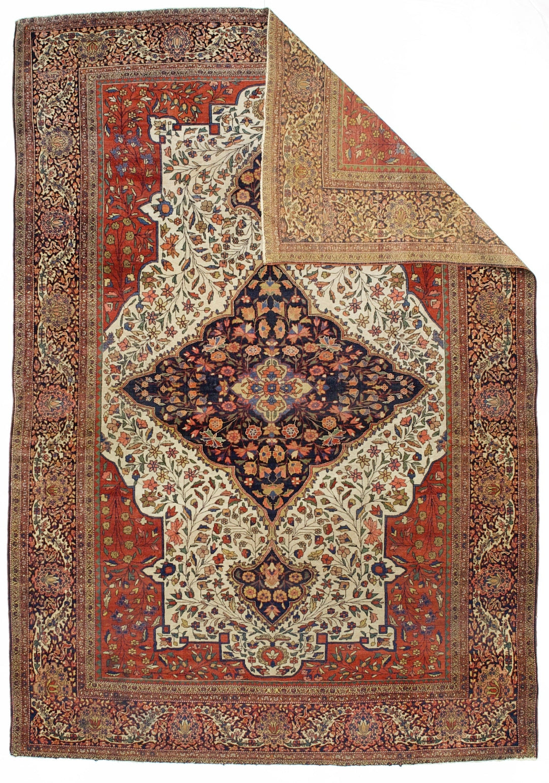The scatter and room size pieces made in the Arak/Sultanabad area, between 1880 and 1910, with firm and leathery well-woven textures, and strong in red, navy and ecru tones, usually in medallion formats. A transition group between the earlier 19th century Farahans and the post-WWI Sarouks. Drawing is between curvilinear and angular.
