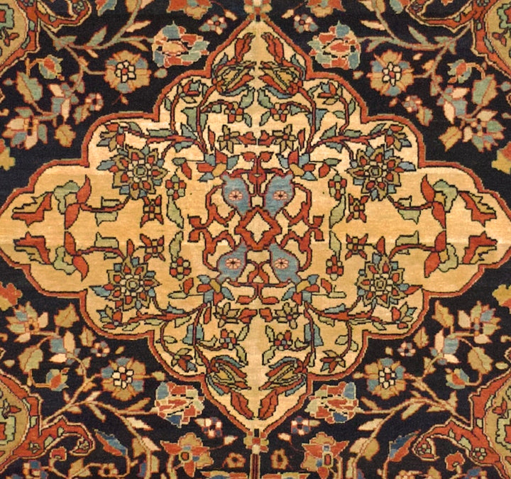 The scatter and room size pieces made in the Arak/Sultanabad area, between 1880 and 1910, with firm and leathery well-woven textures, and strong in red, navy and ecru tones, usually in medallion formats. A transition group between the earlier 19th century Farahans and the post-WWI Sarouks. Drawing is between curvilinear and angular.