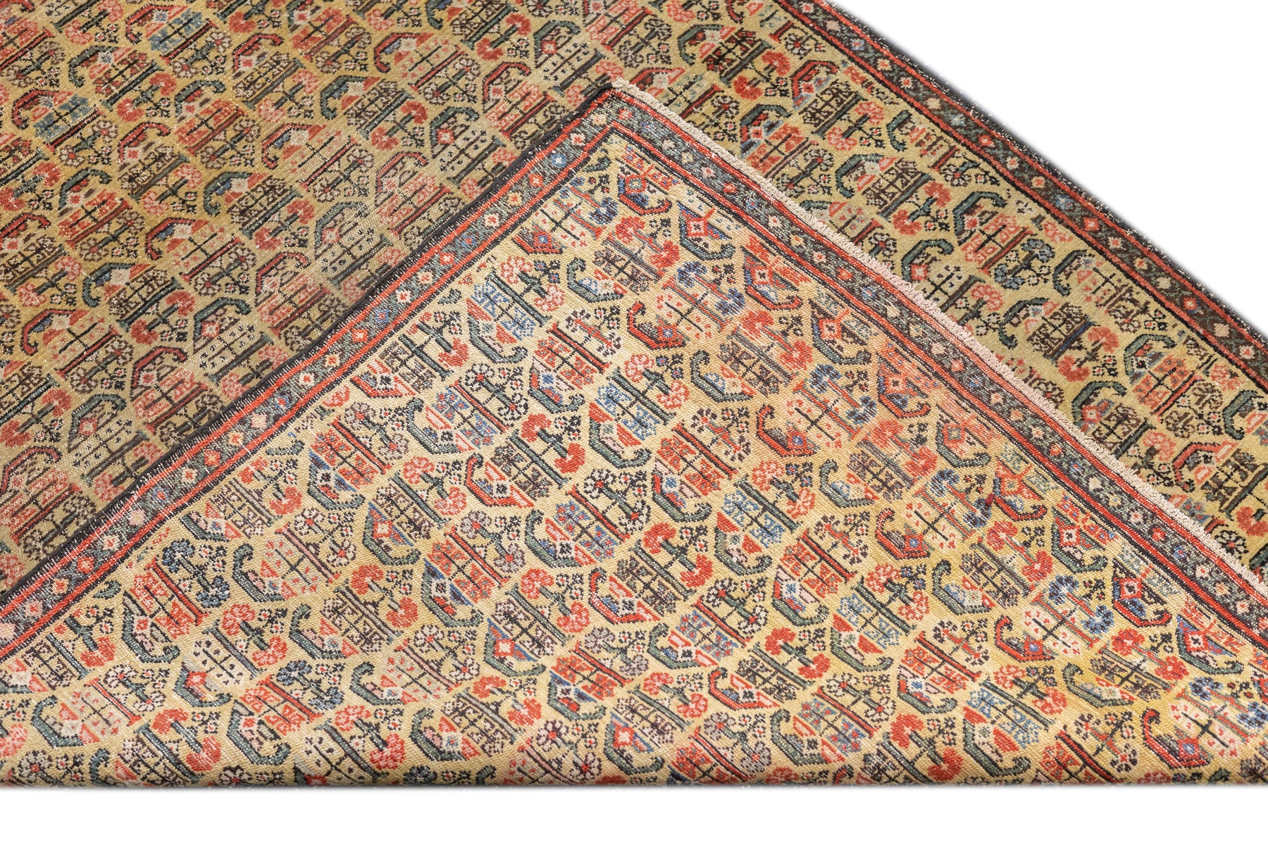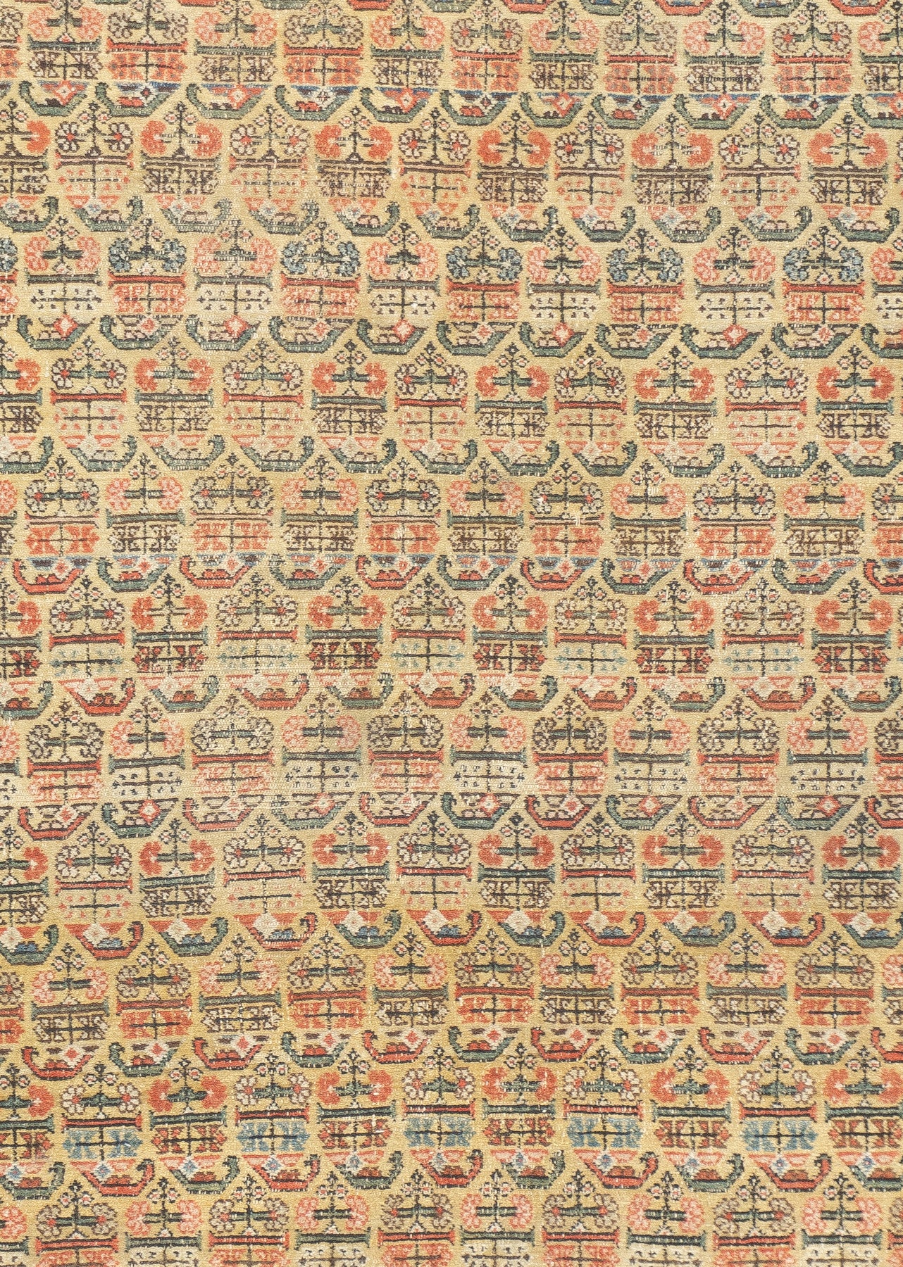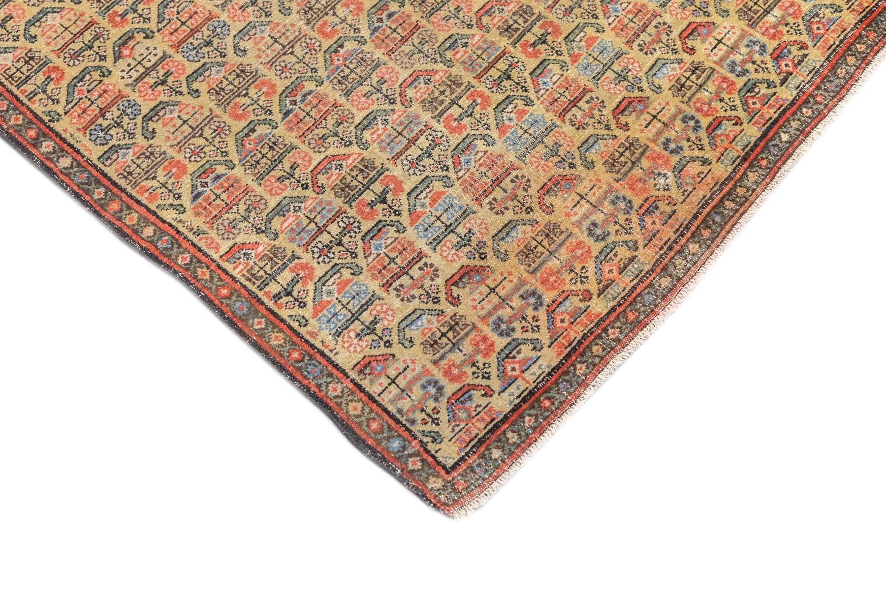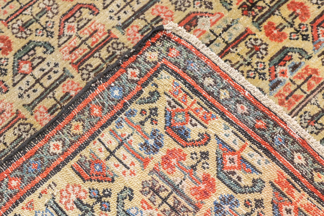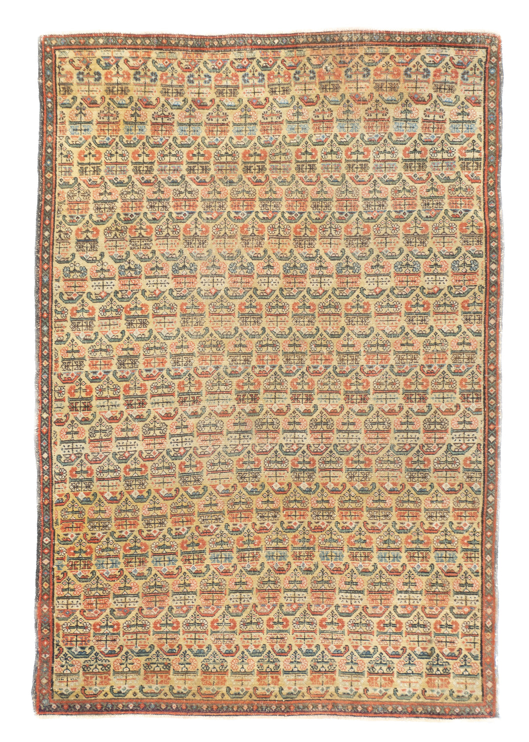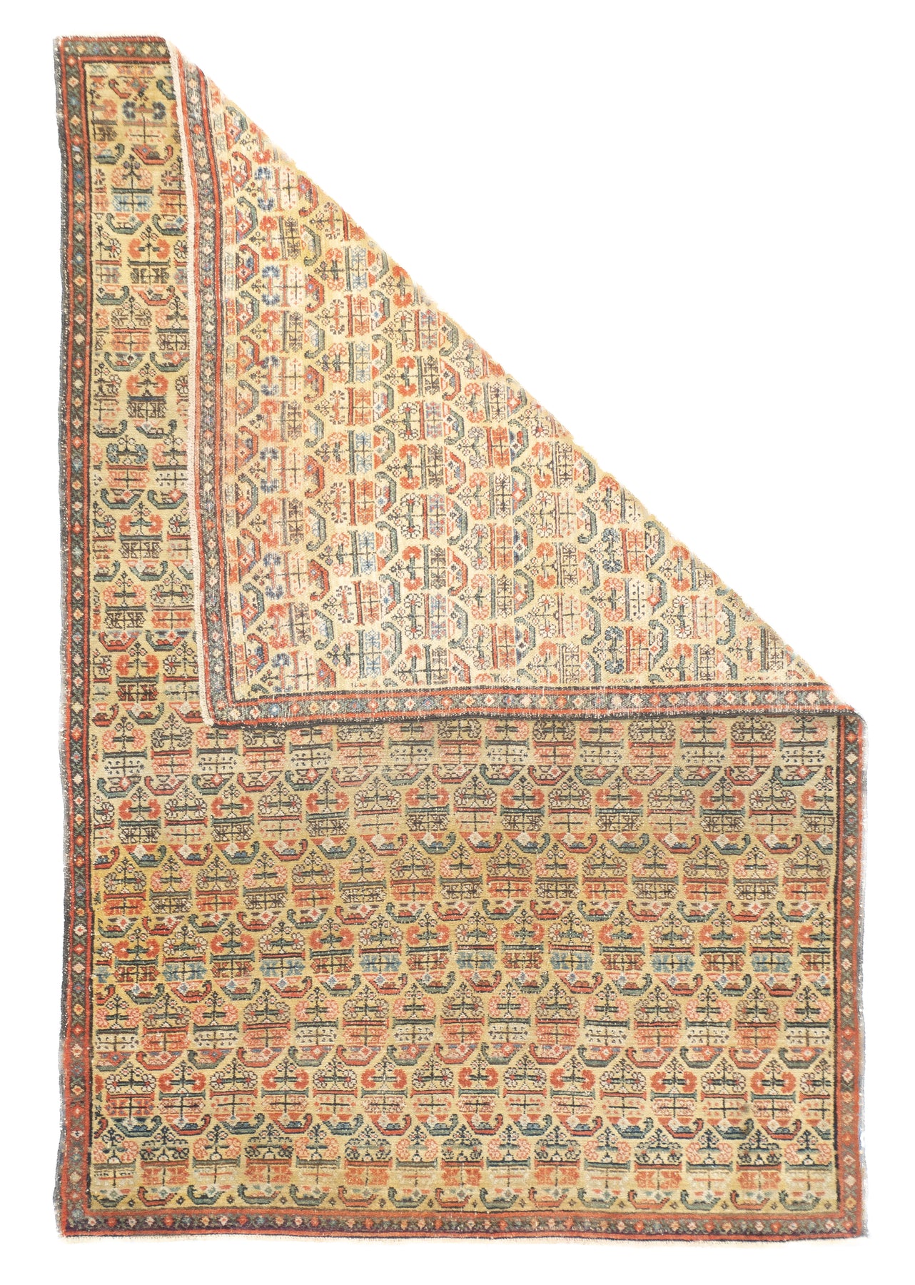 This west Persian Farahan village scatter shows a sandy straw field with closely set reversing rows of floriated botehs in half-drop array. Clearly this is a textile originated design. Very slender main border of diamonds and X’s. Fine weave, cotton foundation, good condition.