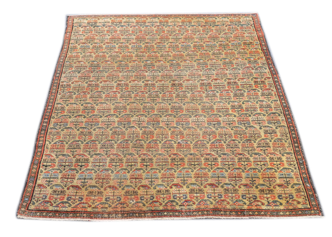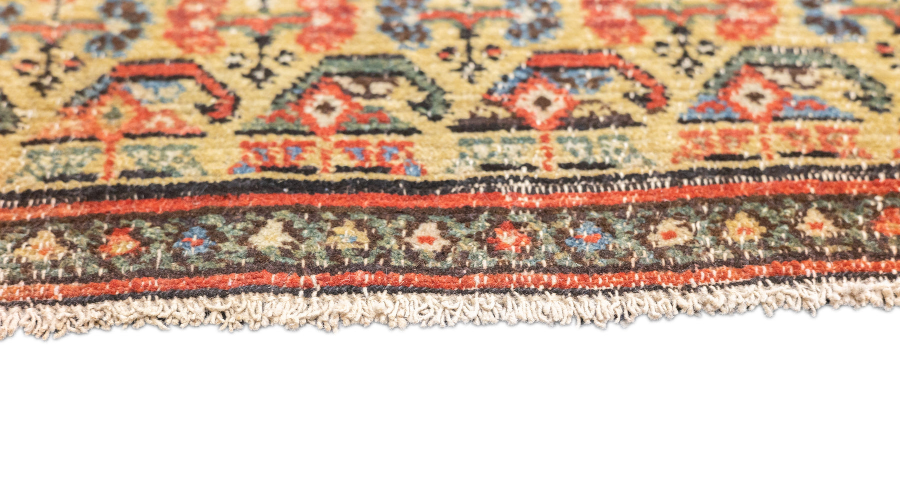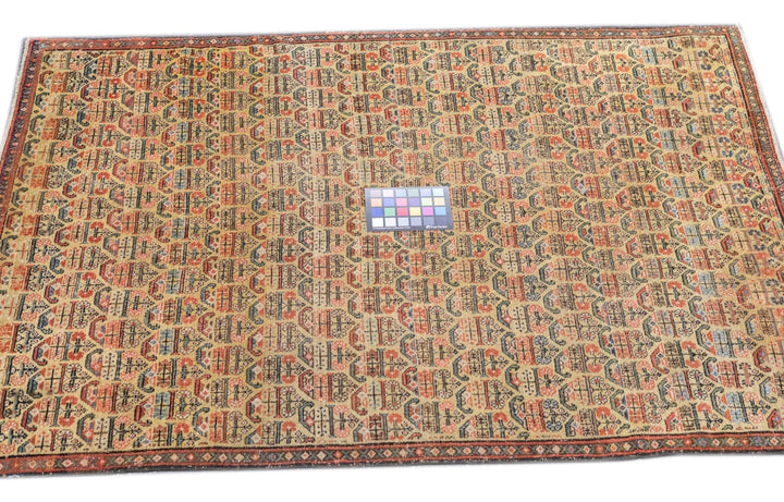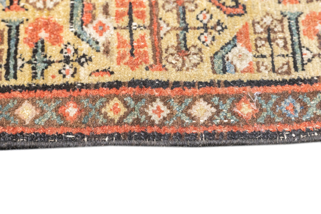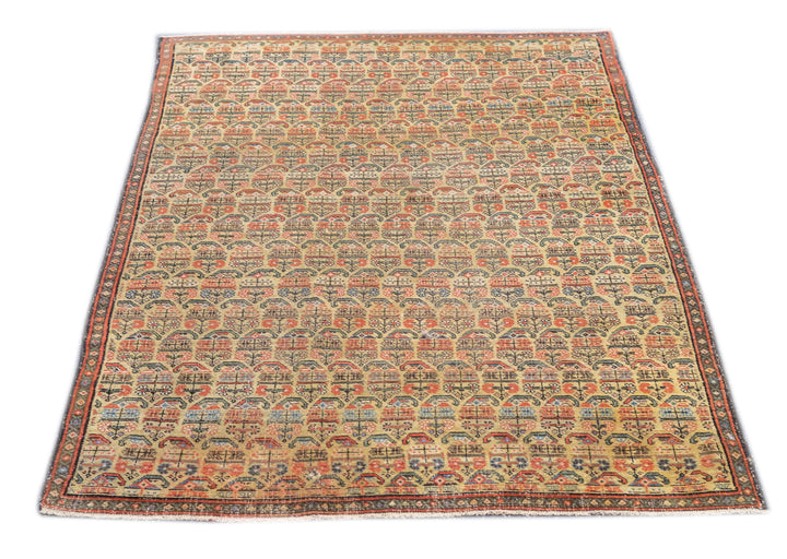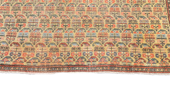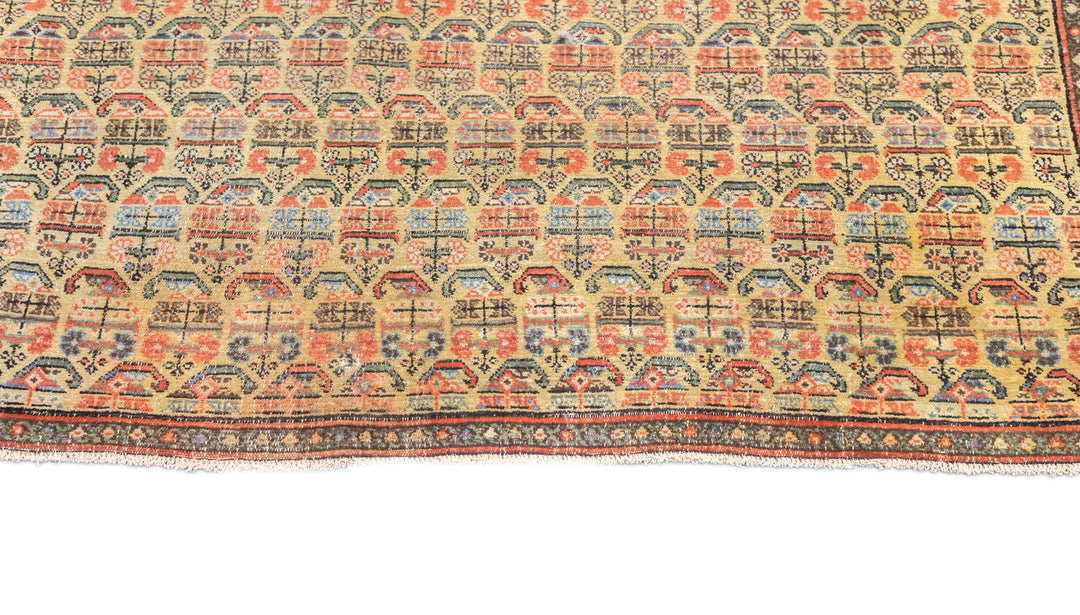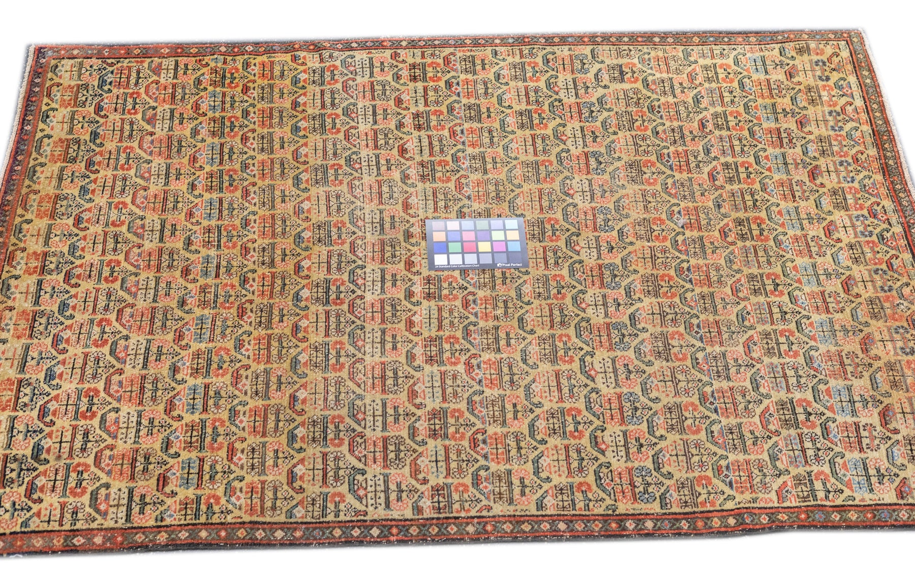 This west Persian Farahan village scatter shows a sandy straw field with closely set reversing rows of floriated botehs in half-drop array. Clearly this is a textile originated design. Very slender main border of diamonds and X’s. Fine weave, cotton foundation, good condition.
