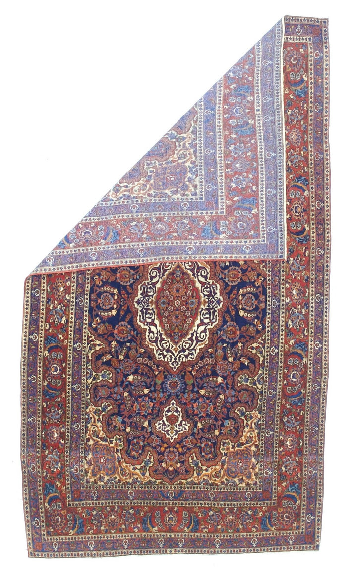 Central Persian city known for finely woven. room size and scatter rugs, with dominant reds and navy, and medallion patterns and swirling palmettes.Active since the 16th century, but with breaks, Revival began with Mohtasham (see below) in the 1880’s. Generally medium-high prices.