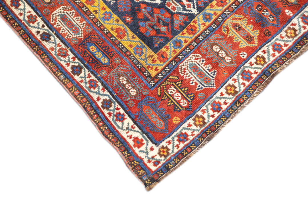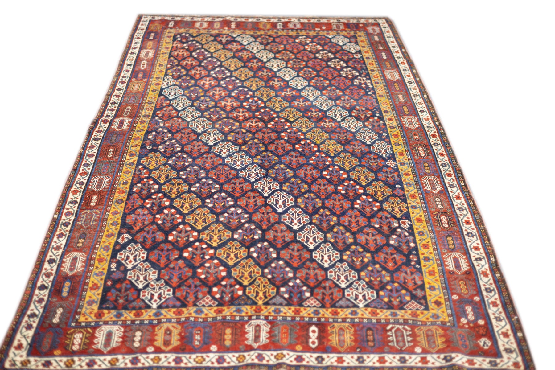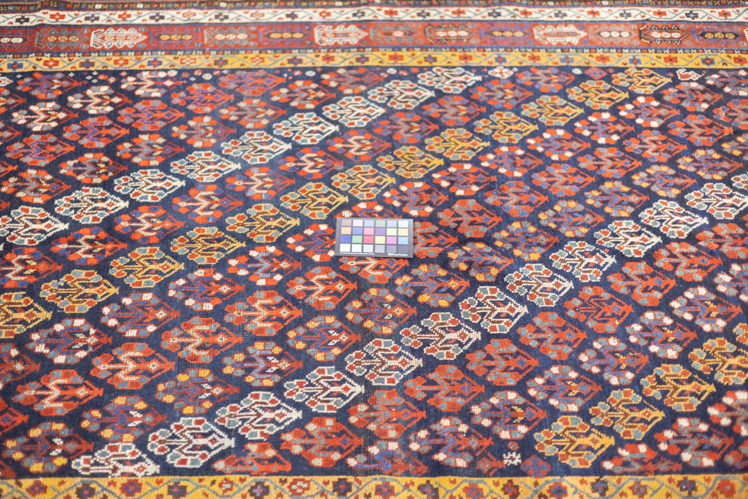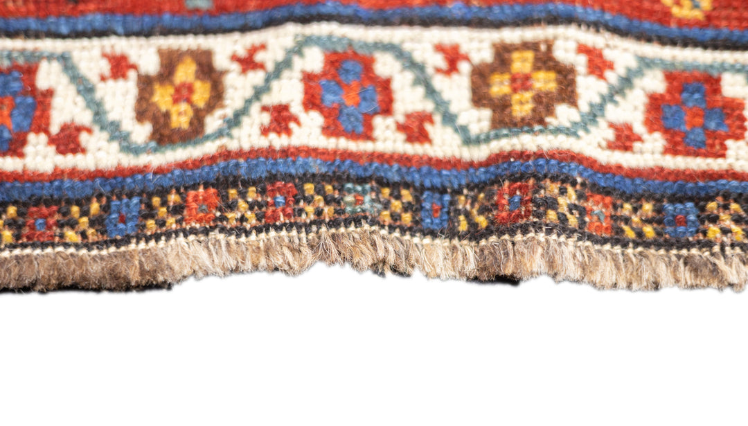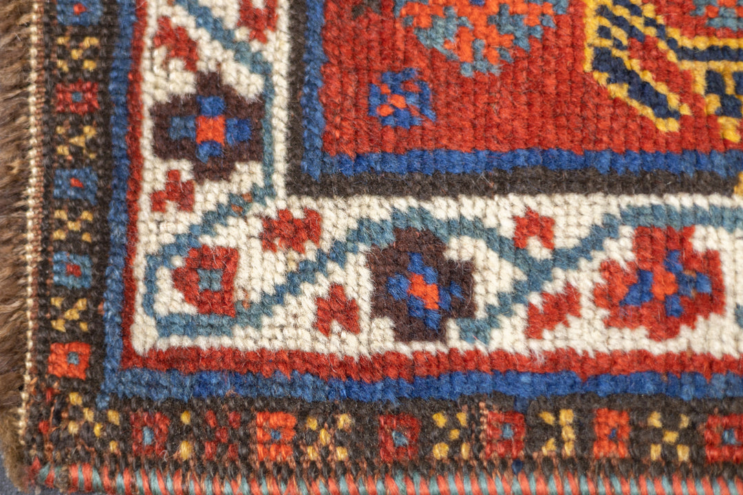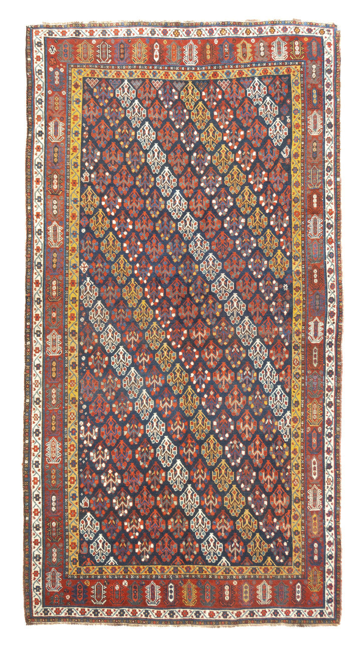 The non-Qashghai tribes in SW Persia weaving a wide variety of geometric and abstract scatters and bagfaces. The best weavers are the Baharlu of Turkic descent, Both symmetric and asymmetric knots; wool foundations predominate. Chickens are a popular secondary motif. Also called ‘Shiraz’. Moderate to medium weave. Bright palettes.