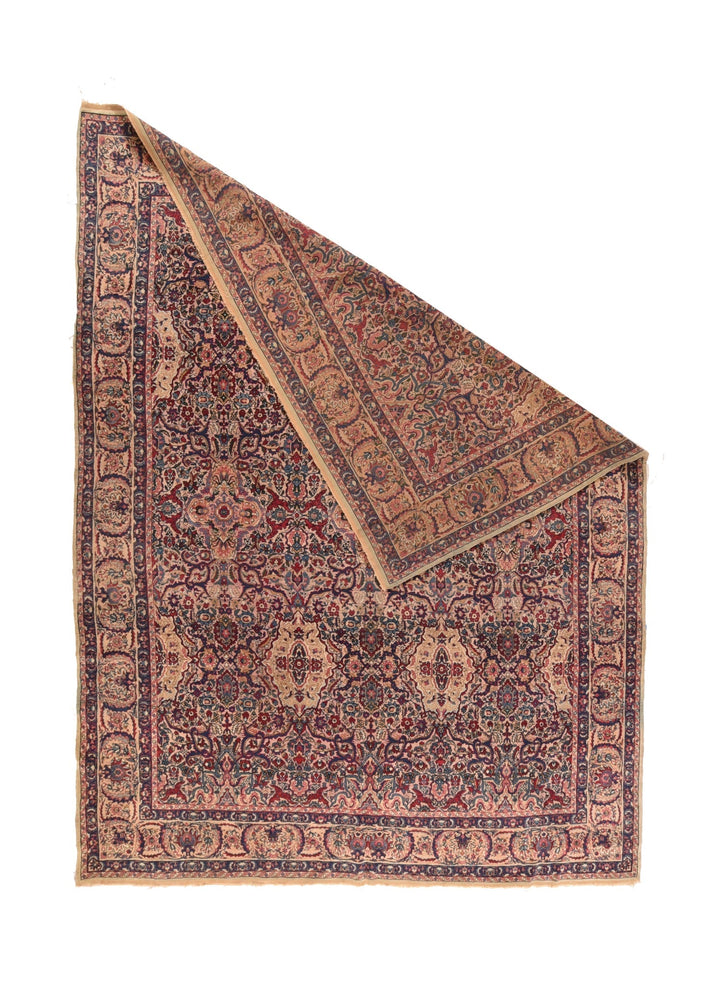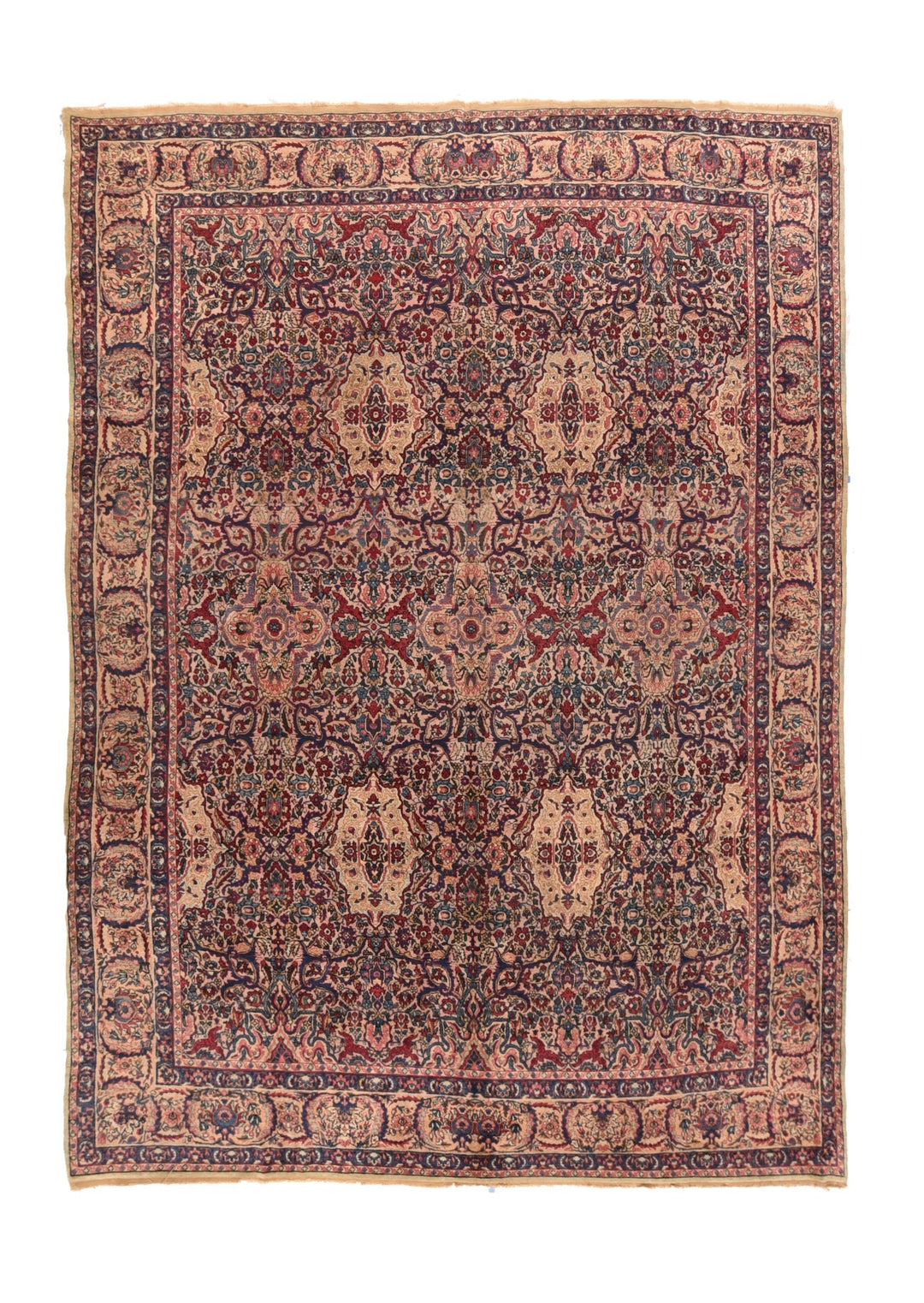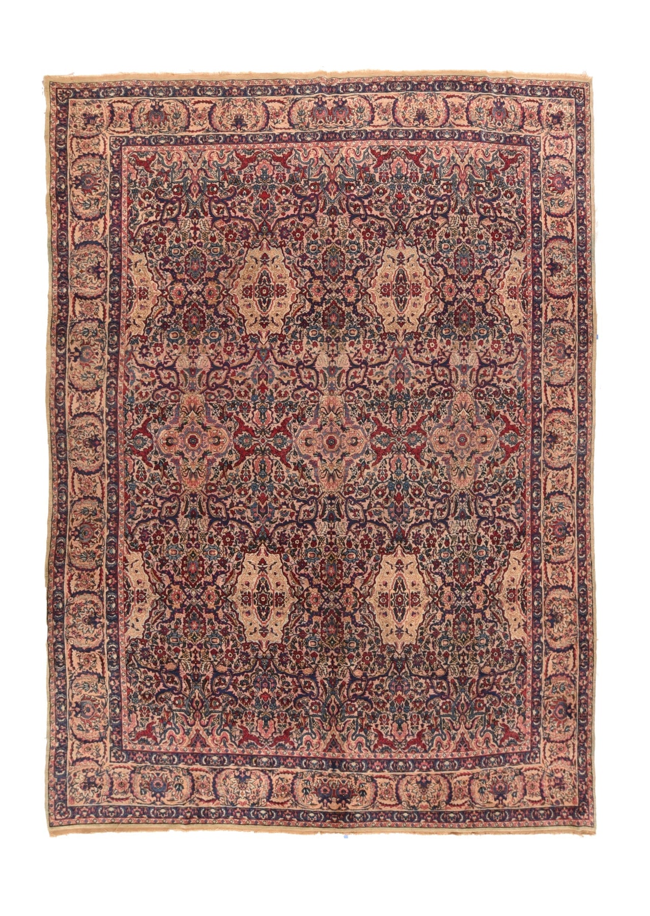 The sand field shows a closely packed allover design with two rows of widely space sandy-straw cartouches, and red and navy forked arabesques, teal palmettes and colorful small flowers. Sand border with curved, barbed leaves framing palmettes Tilted corner palmettes and doubled palmettes at the centers of the end borders. Well-woven urban construction, cotton foundation. Very unusual pattern. Good condition.