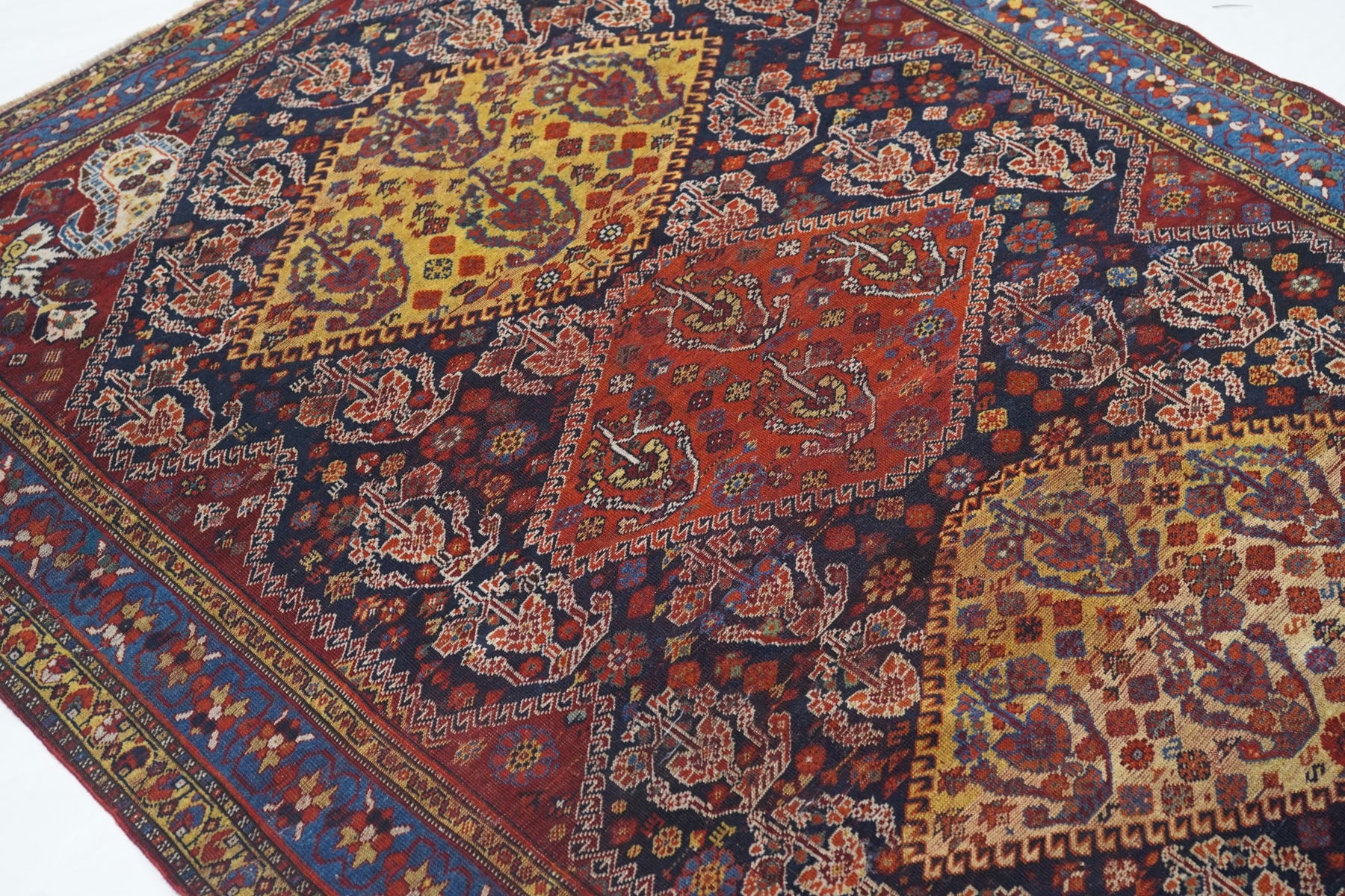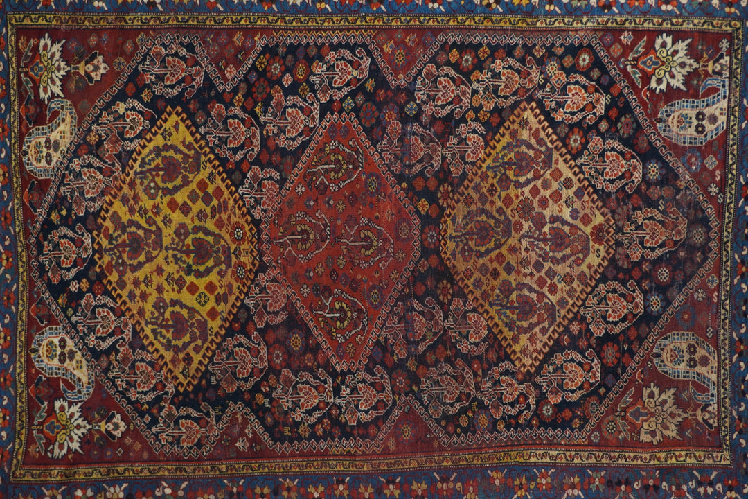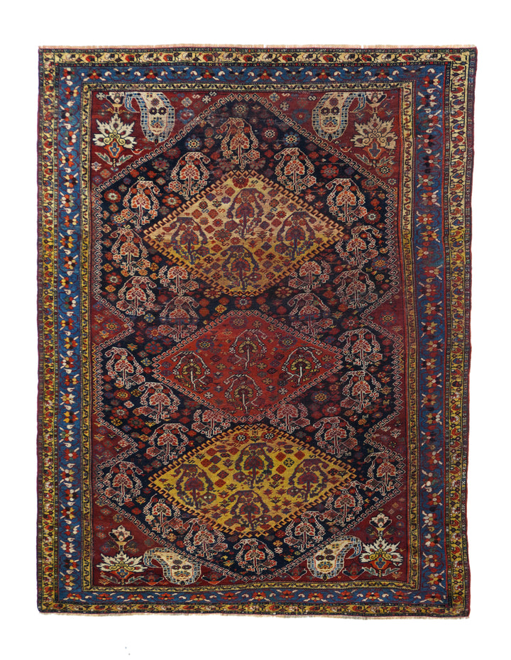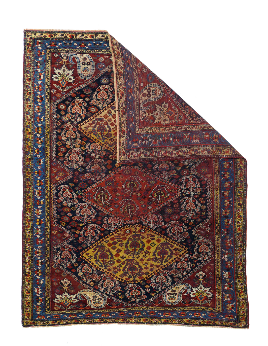 The best SW Persian, Fars Province nomadic rugs, mostly in scatter formats. Geometric Gabbehs, lion rugs, adapted Persian curvilinear styles. Some well-woven prayer rugs. All-wool constructions. Pictorial rugs. Weaving goes back to at least the mid-19th century. Excellent wool quality.