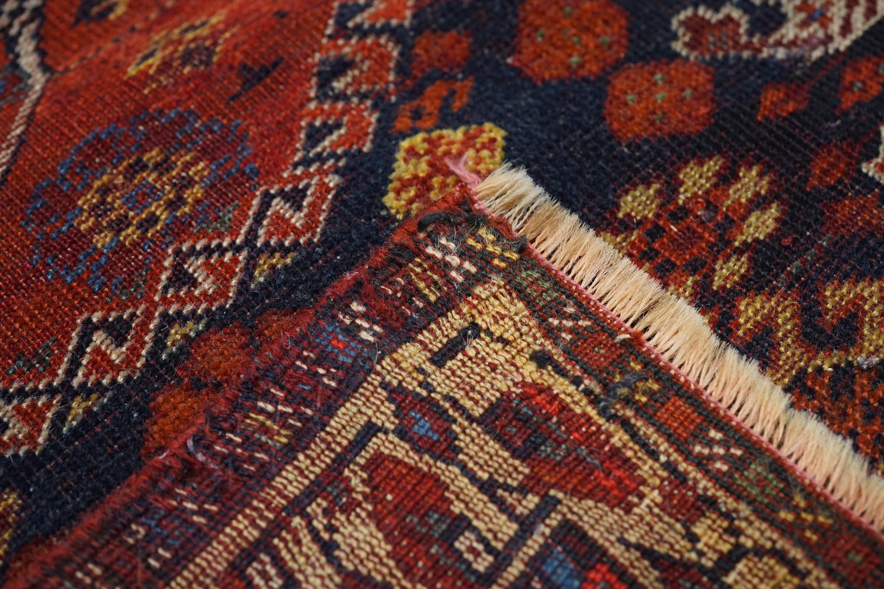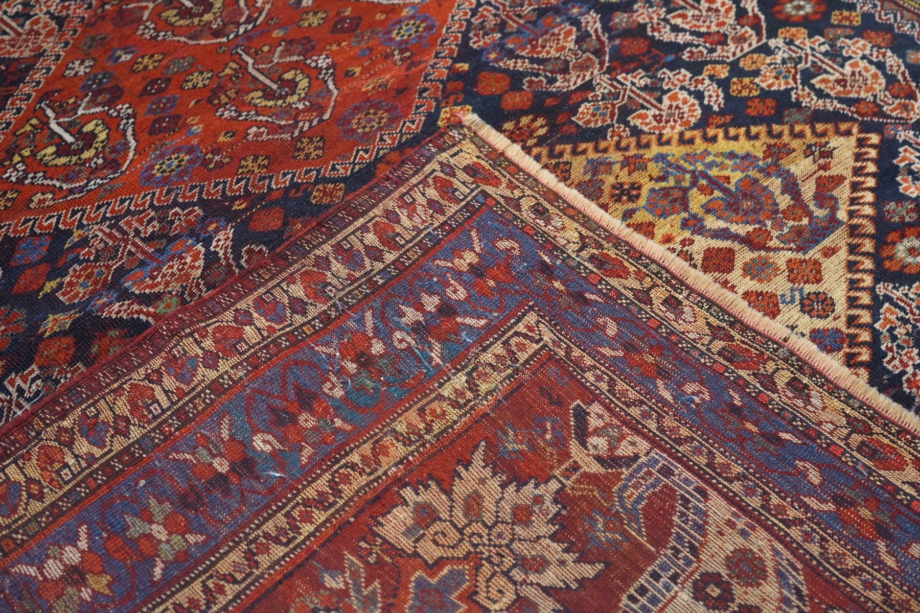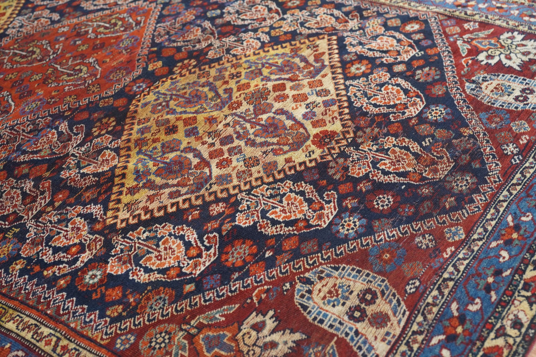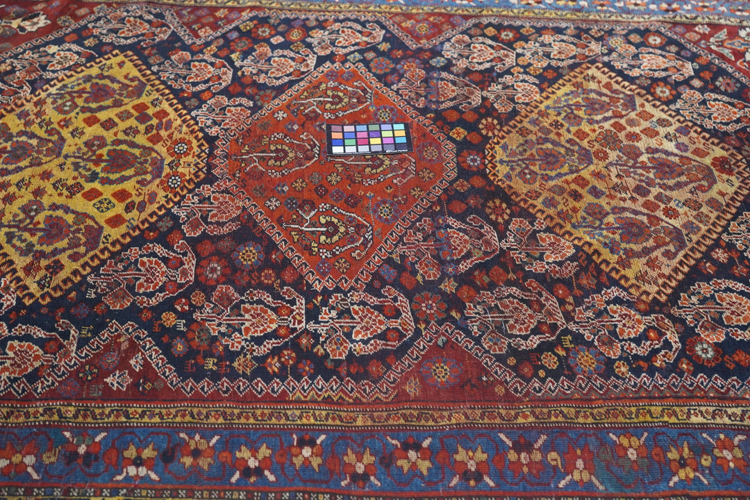 The best SW Persian, Fars Province nomadic rugs, mostly in scatter formats. Geometric Gabbehs, lion rugs, adapted Persian curvilinear styles. Some well-woven prayer rugs. All-wool constructions. Pictorial rugs. Weaving goes back to at least the mid-19th century. Excellent wool quality.