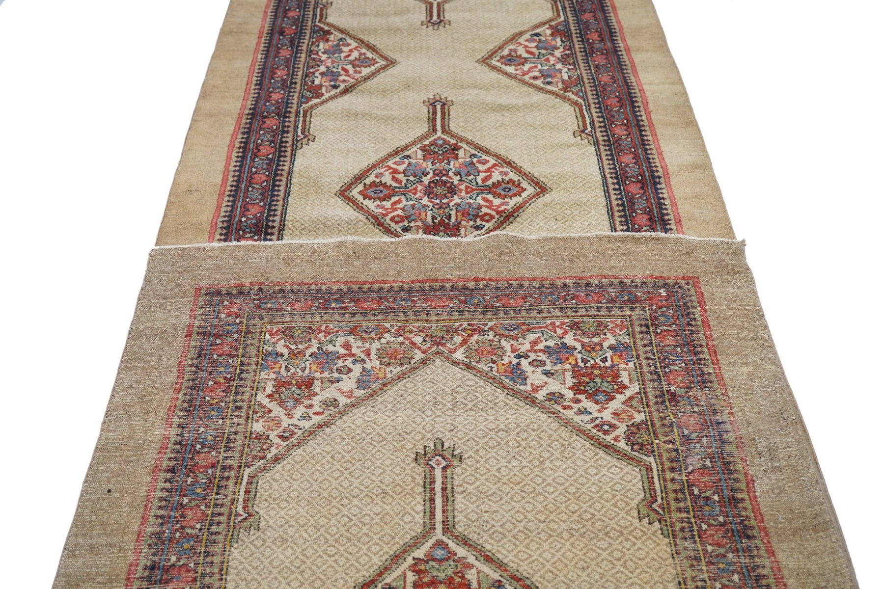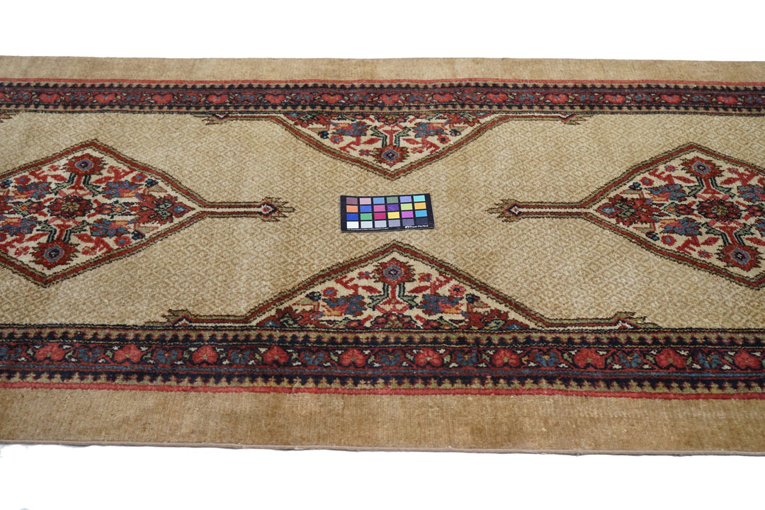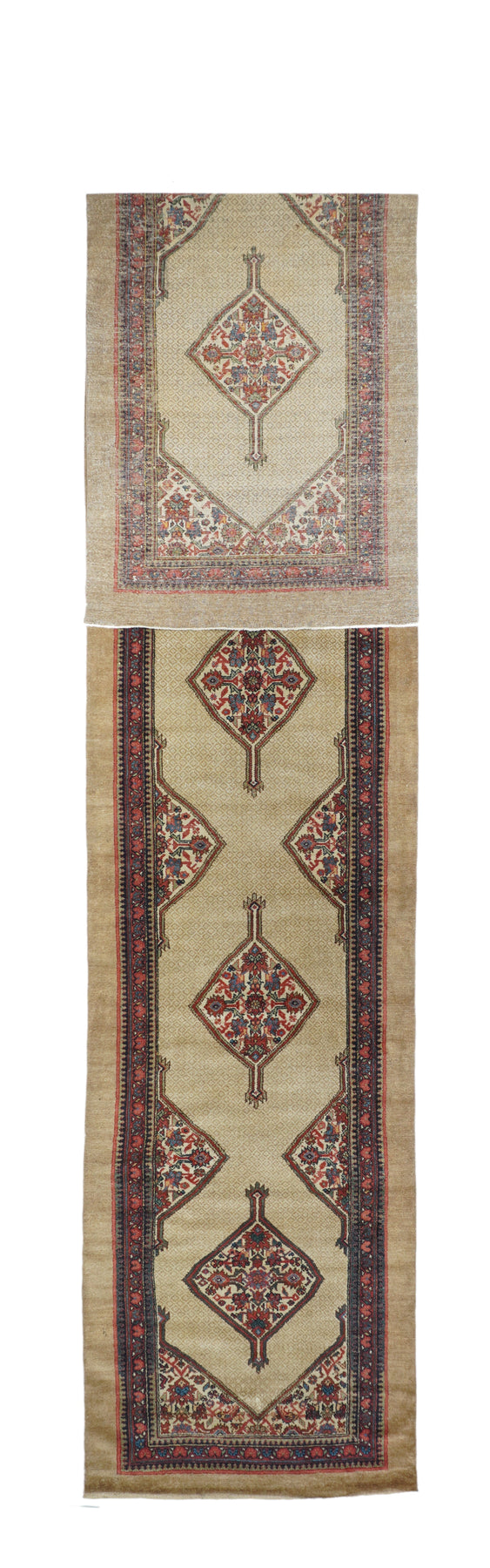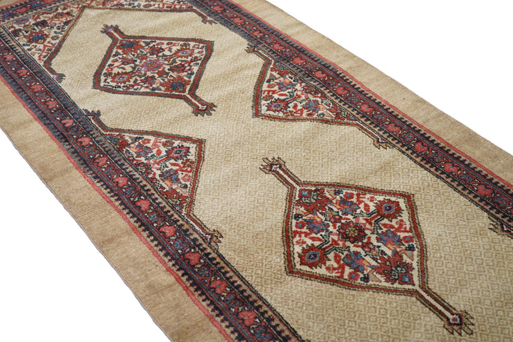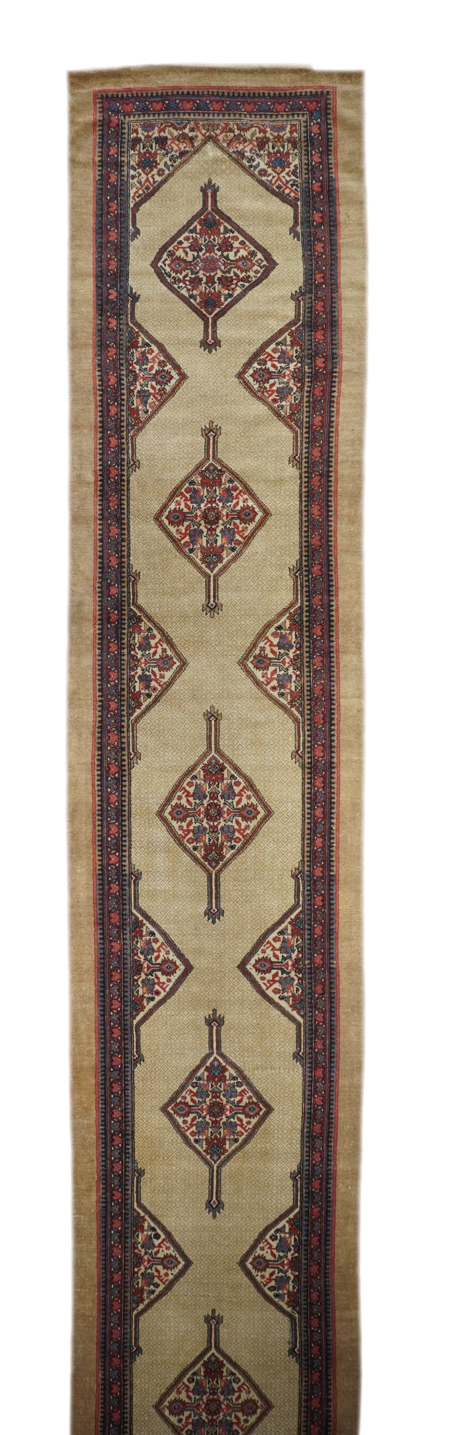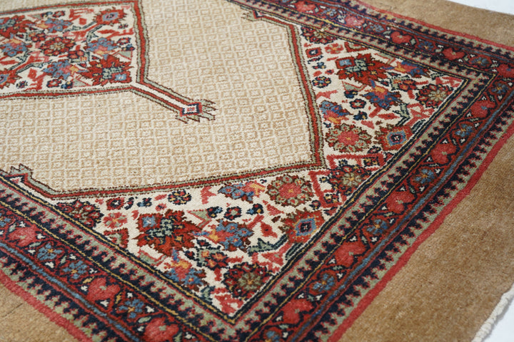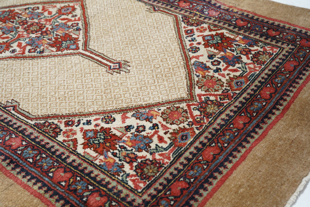 The milky camel-tone open small-patterned field displays five full ecru lozenge Herati medallions with en suite half and quarter side and corner fillers. Inner red reversing fan palmette border and outer plain camel tone slightly darker band. West Persian/Hamadan. Classi Circa Medium rustic weave. Good condition.