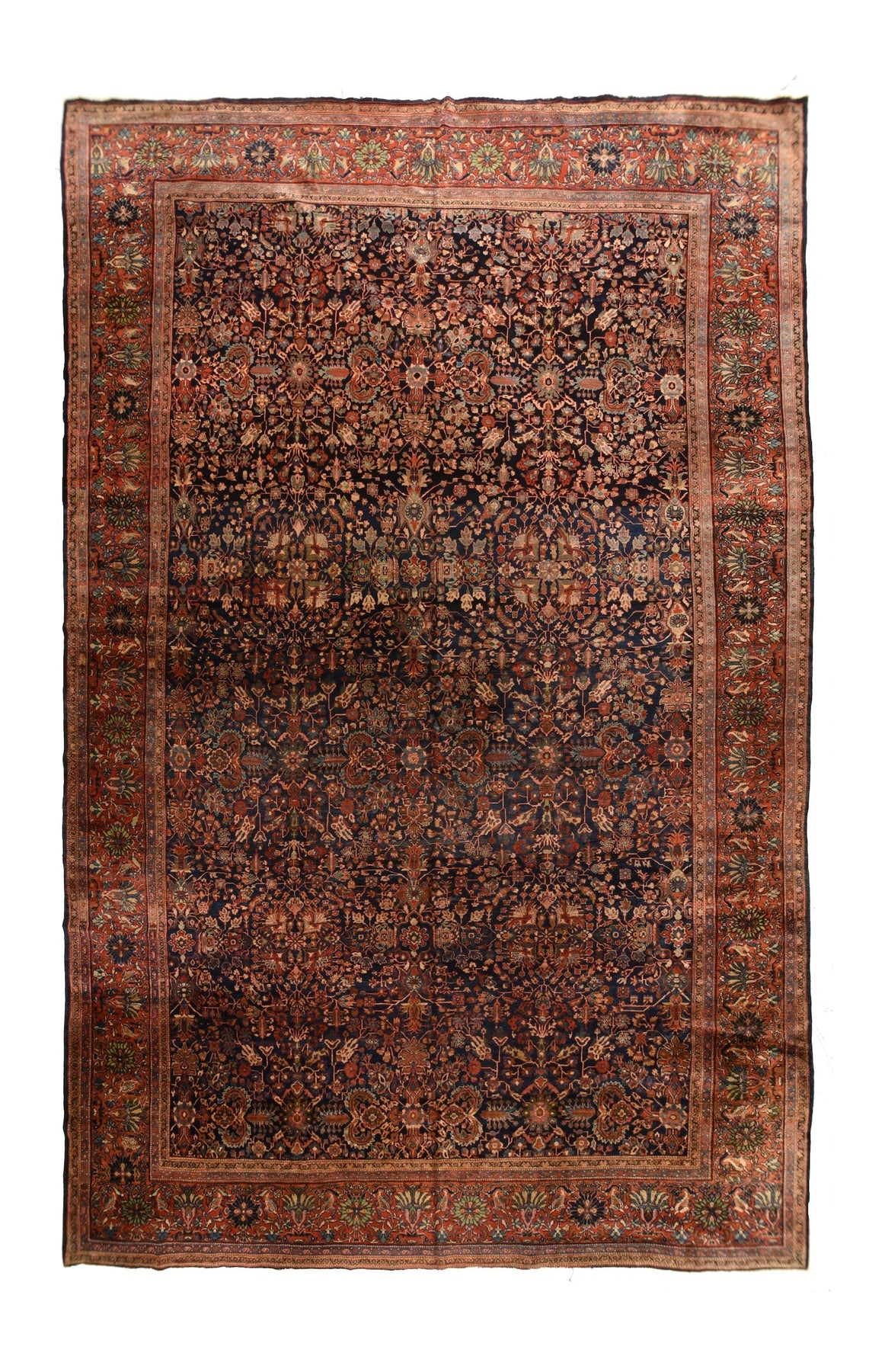 This well-woven, cotton foundation Central Persian city carpet presents a deep navy indigo field with a dense cover of rosettes, palmettes, flowering stems, angular branches and sharply curved barbed bitonal leaves. Saturated red border with flowering vases and octagonal semi-rosettes. Short, velvety pile. Laterally balanced pattern, but asymmetric vertically. Good condition.