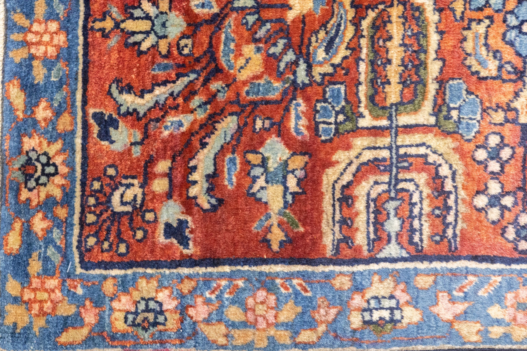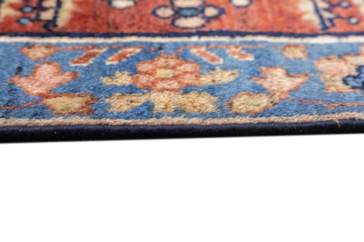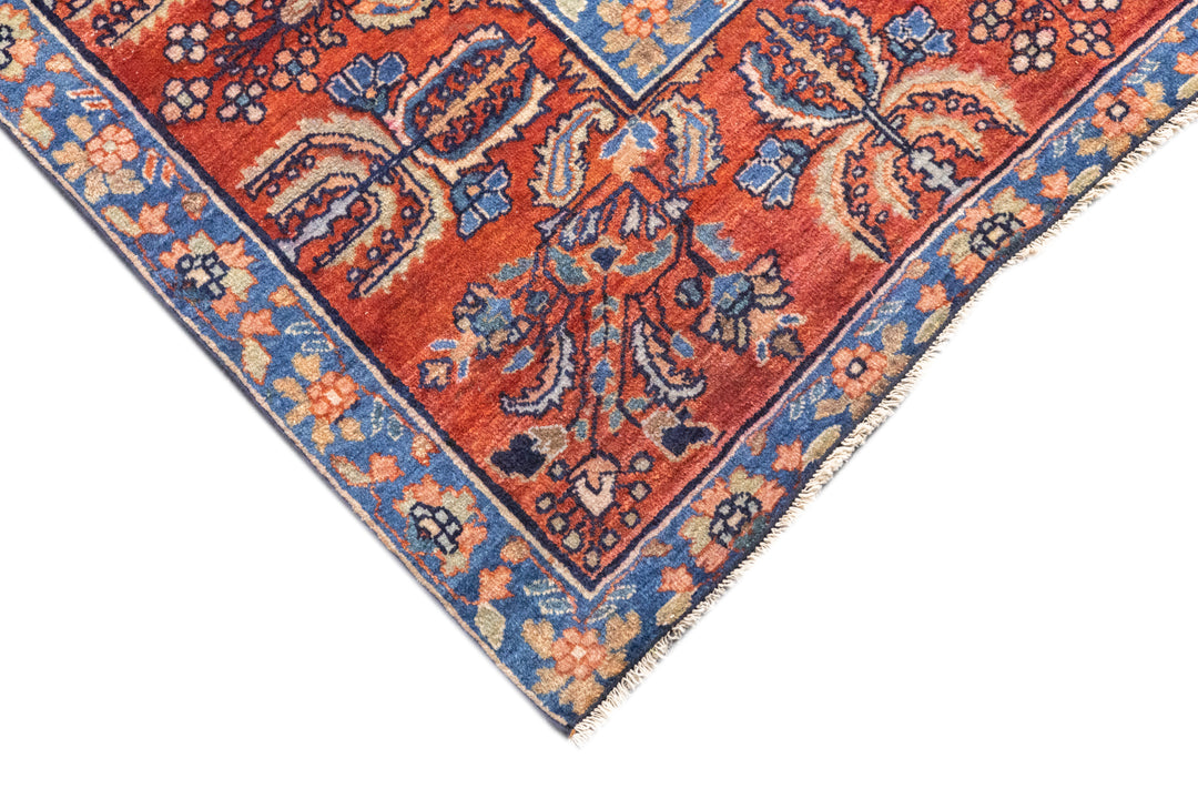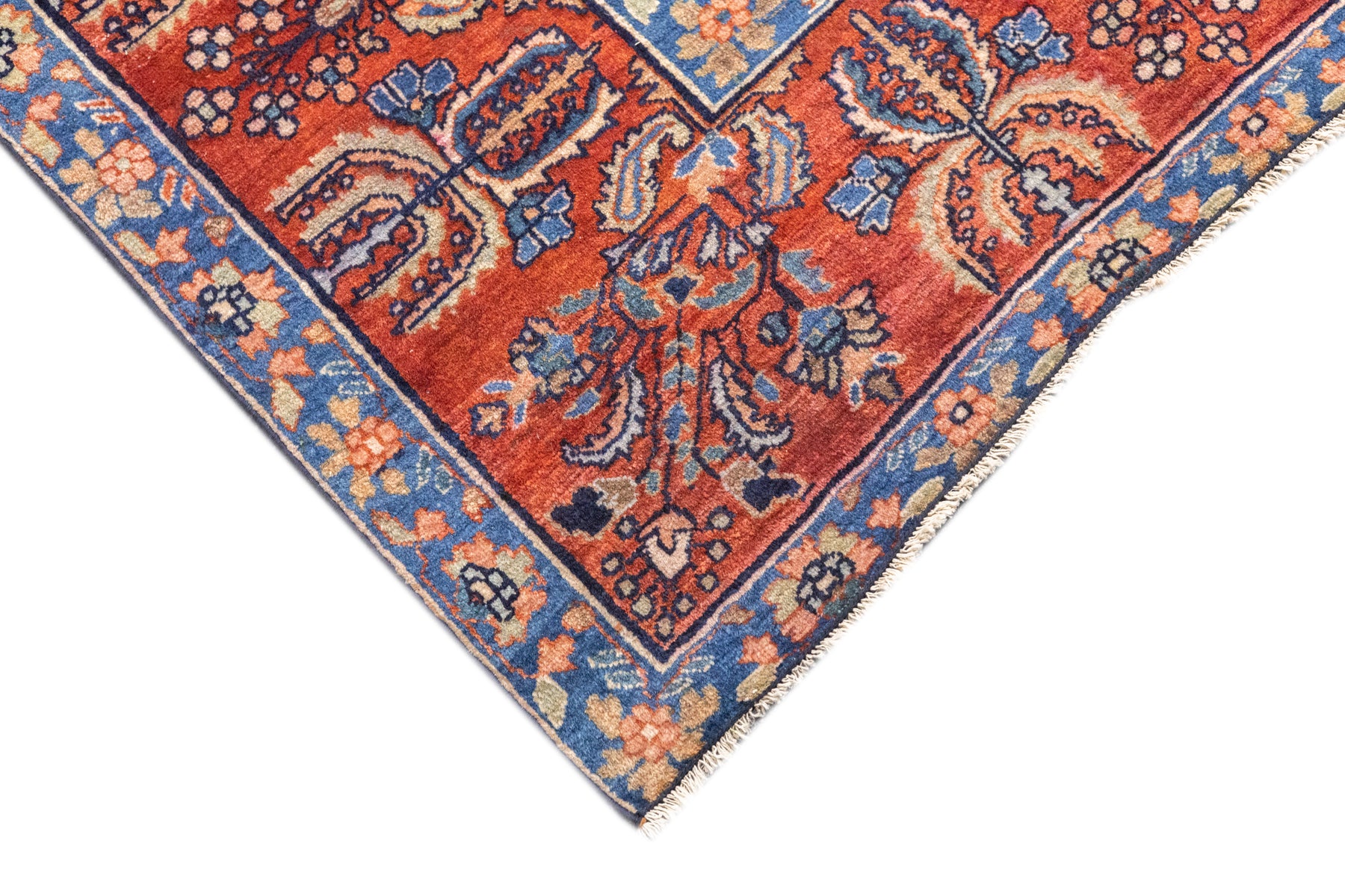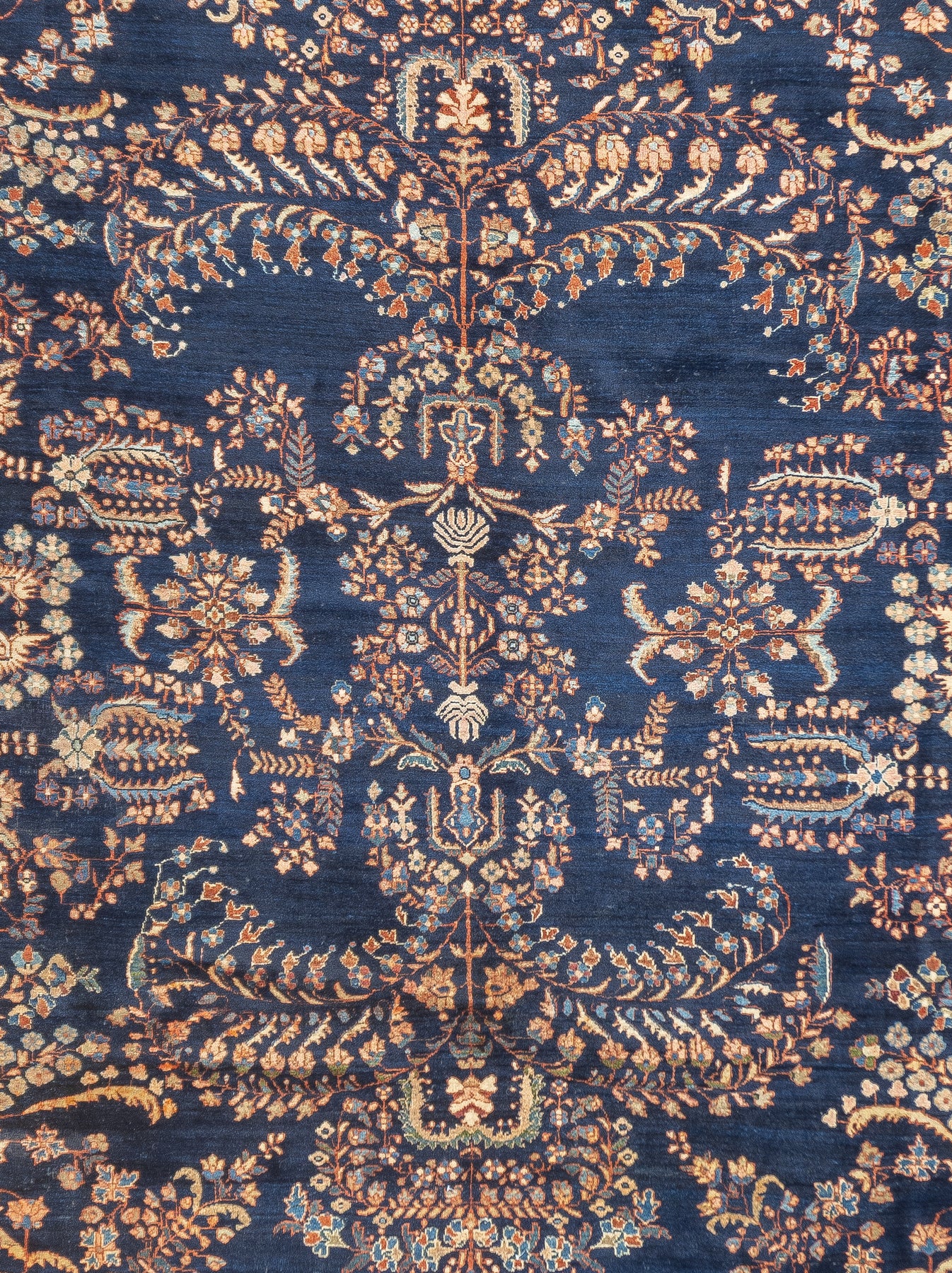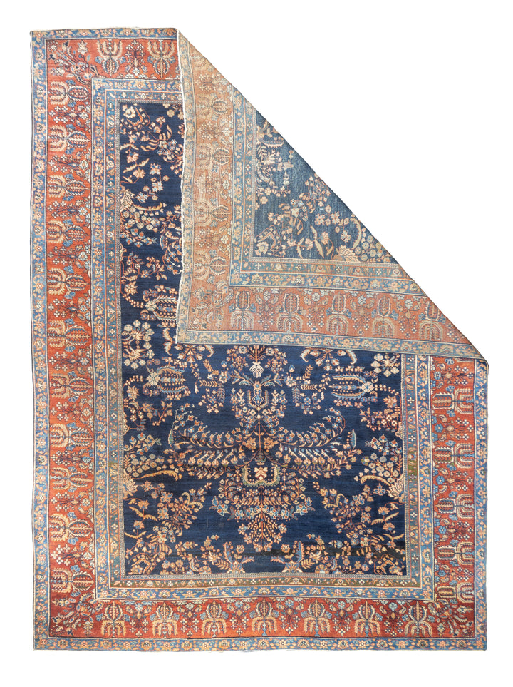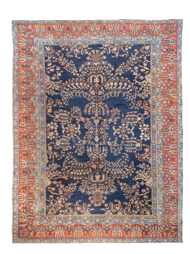 The well-woven village carpets from the Arak/Sultanabad area, especially the red field/navy border, detached floral spray pattern “American Sarouks” of the 1920-1970 period. Robust and leathery, on cotton. Recent examples show medallions and classic allover patterns. Best Sarouks are reputed to be Mohajerans.