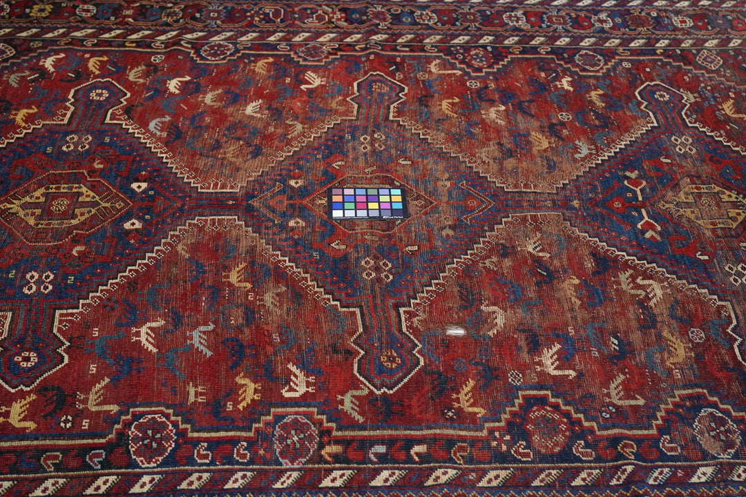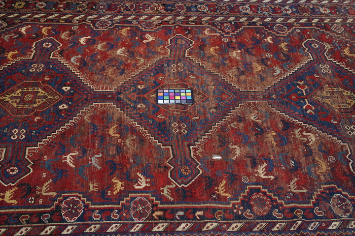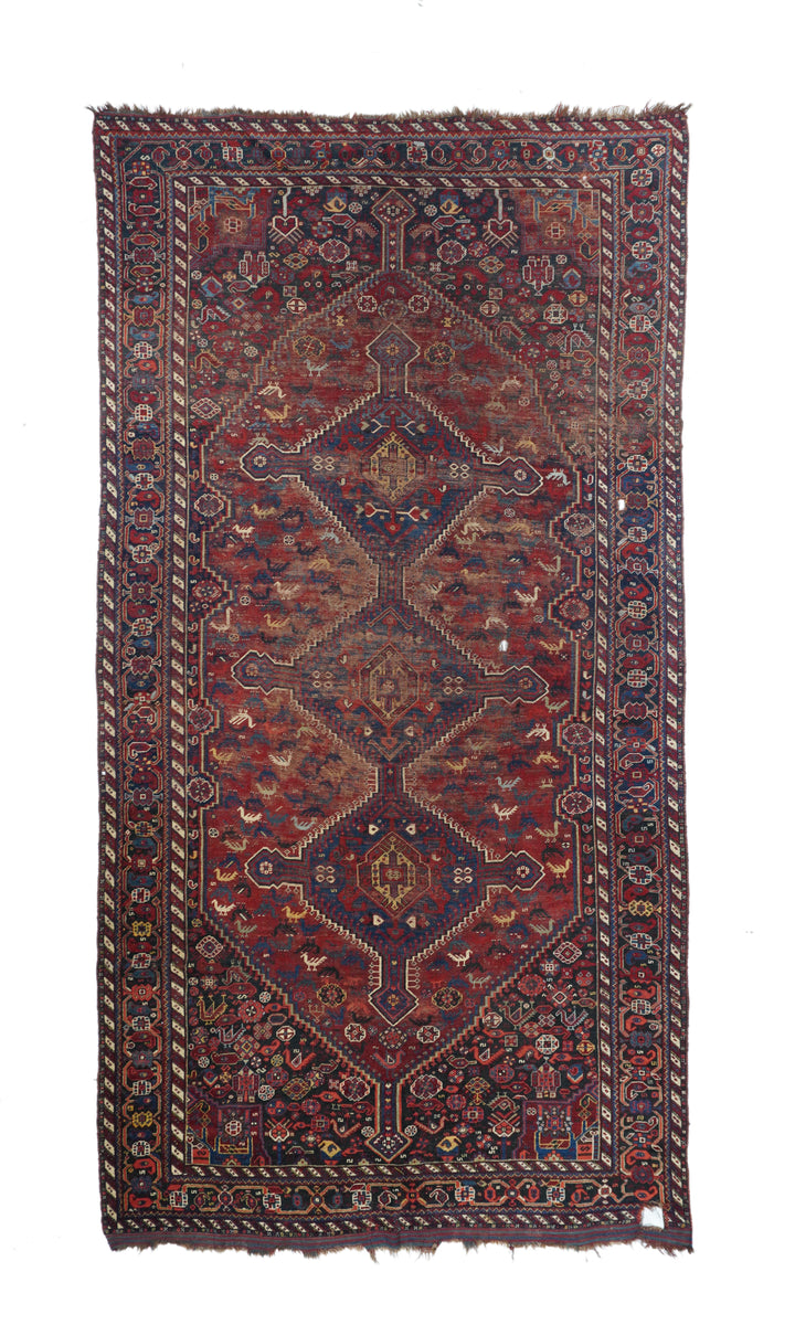 This Khamseh tribal kellegi (long rug) from around Shiraz show a three hexagon pole medallion with finial and horizontal extenders, on a red, chicken-filled sub-field, all set on a stepped dark blue ground with rosette patterning. Main border in near black with rosettes, and en suite minors with bitonal oblique barber pole stripes. Moderate weave. Shows wear. Fair condition with soft wool.