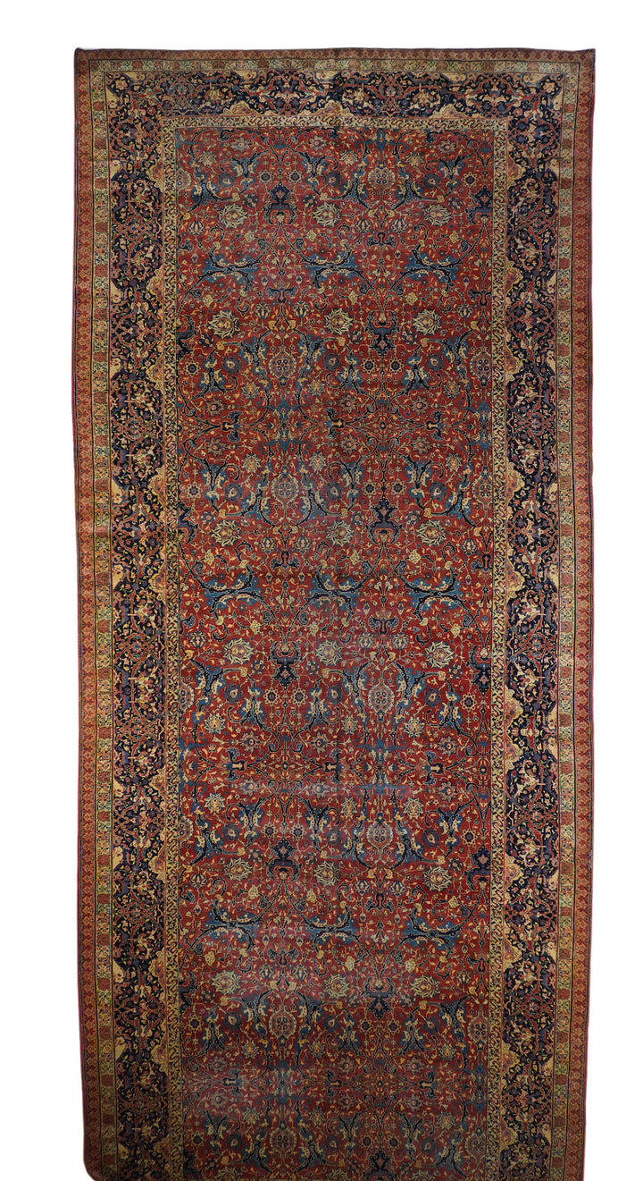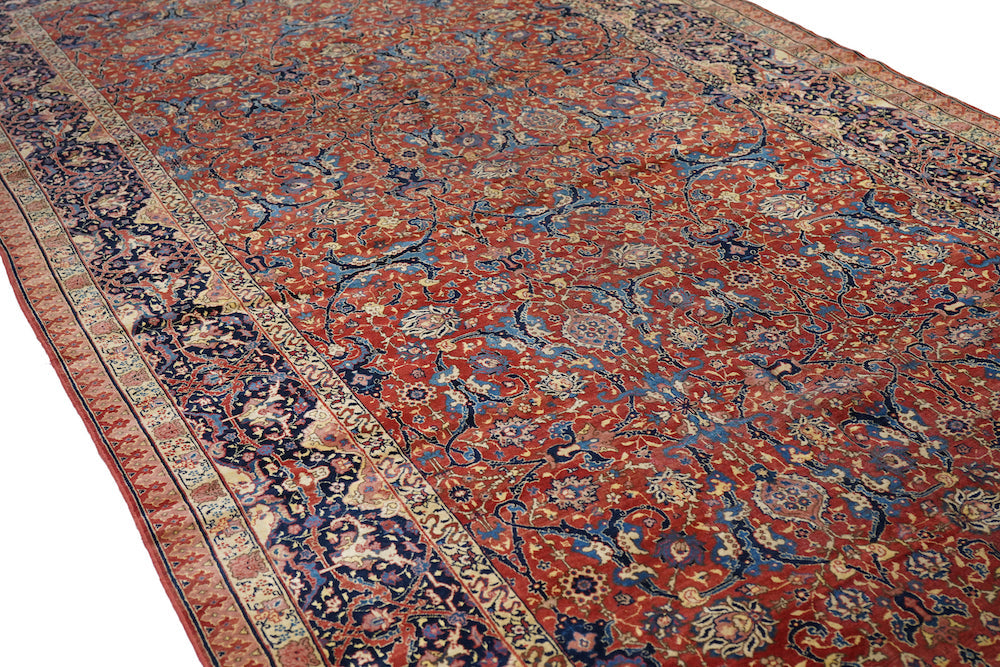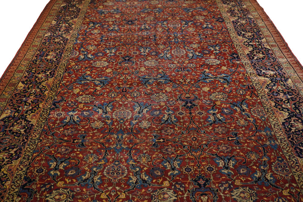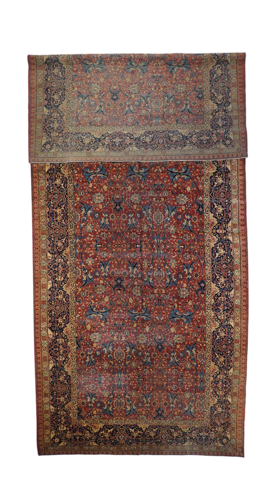 A slightly irregular navy cartouche and arabesque main border perfectly frames the saturated cardinal red field with a finely detailed allover design of petal palmettes, navy vigourously curling split acanthus arabesques, stylized lazy irises and smaller floral elements. Has the look of a classic 17th century carpet. Teal, dark blue-green, pale green, straw and ecru detail tones. Cotton foundation, well-woven. Beautiful carpet in a traditional format. Good condition.