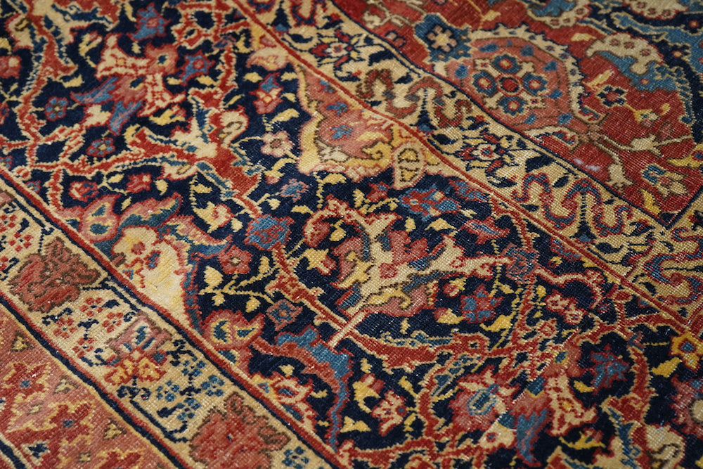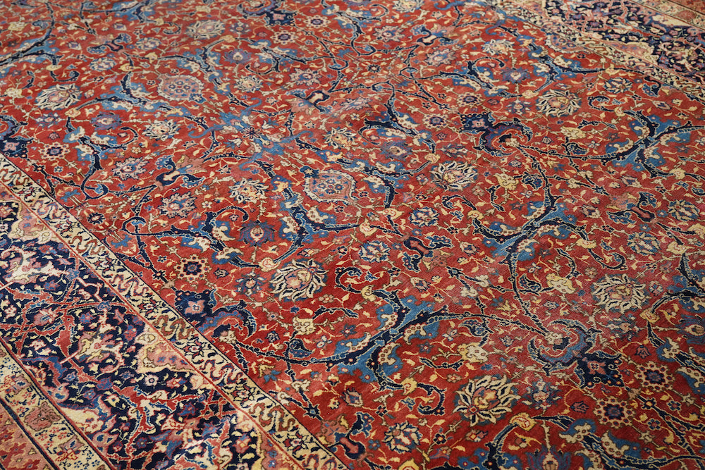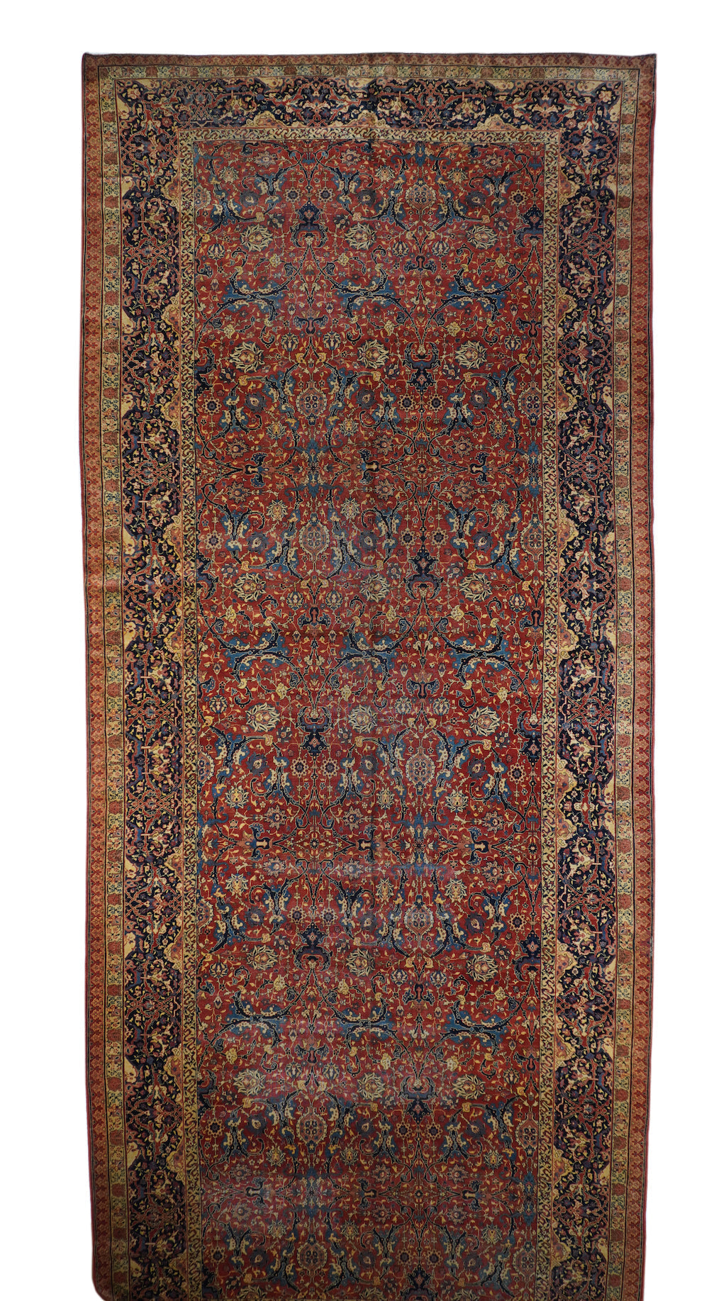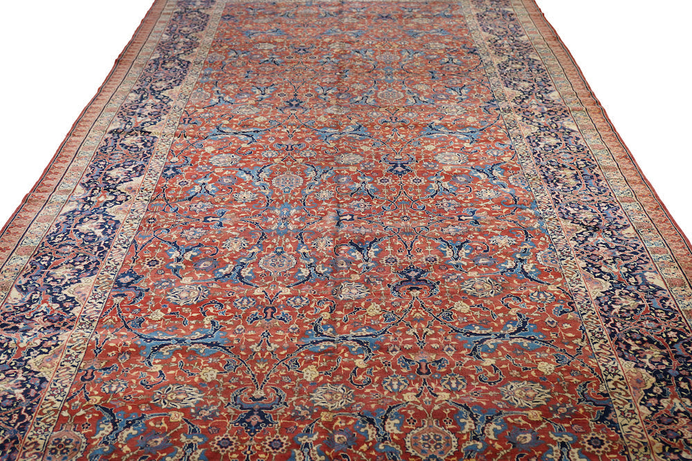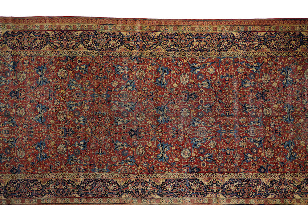 A slightly irregular navy cartouche and arabesque main border perfectly frames the saturated cardinal red field with a finely detailed allover design of petal palmettes, navy vigourously curling split acanthus arabesques, stylized lazy irises and smaller floral elements. Has the look of a classic 17th century carpet. Teal, dark blue-green, pale green, straw and ecru detail tones. Cotton foundation, well-woven. Beautiful carpet in a traditional format. Good condition.