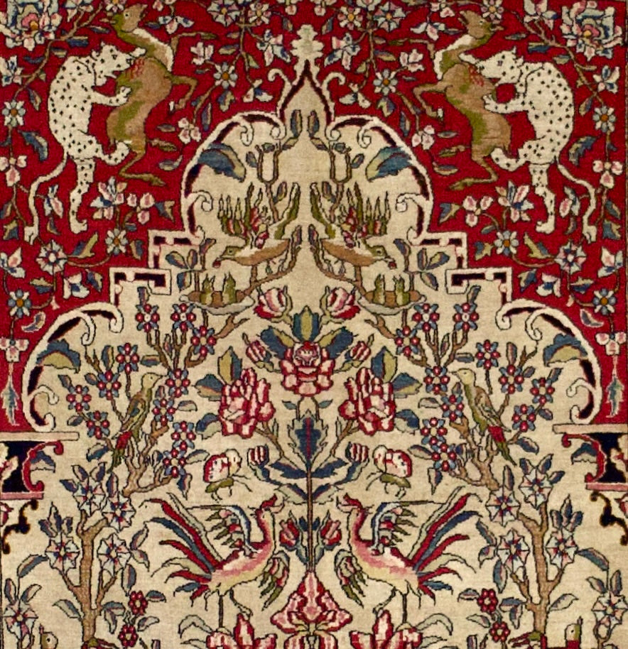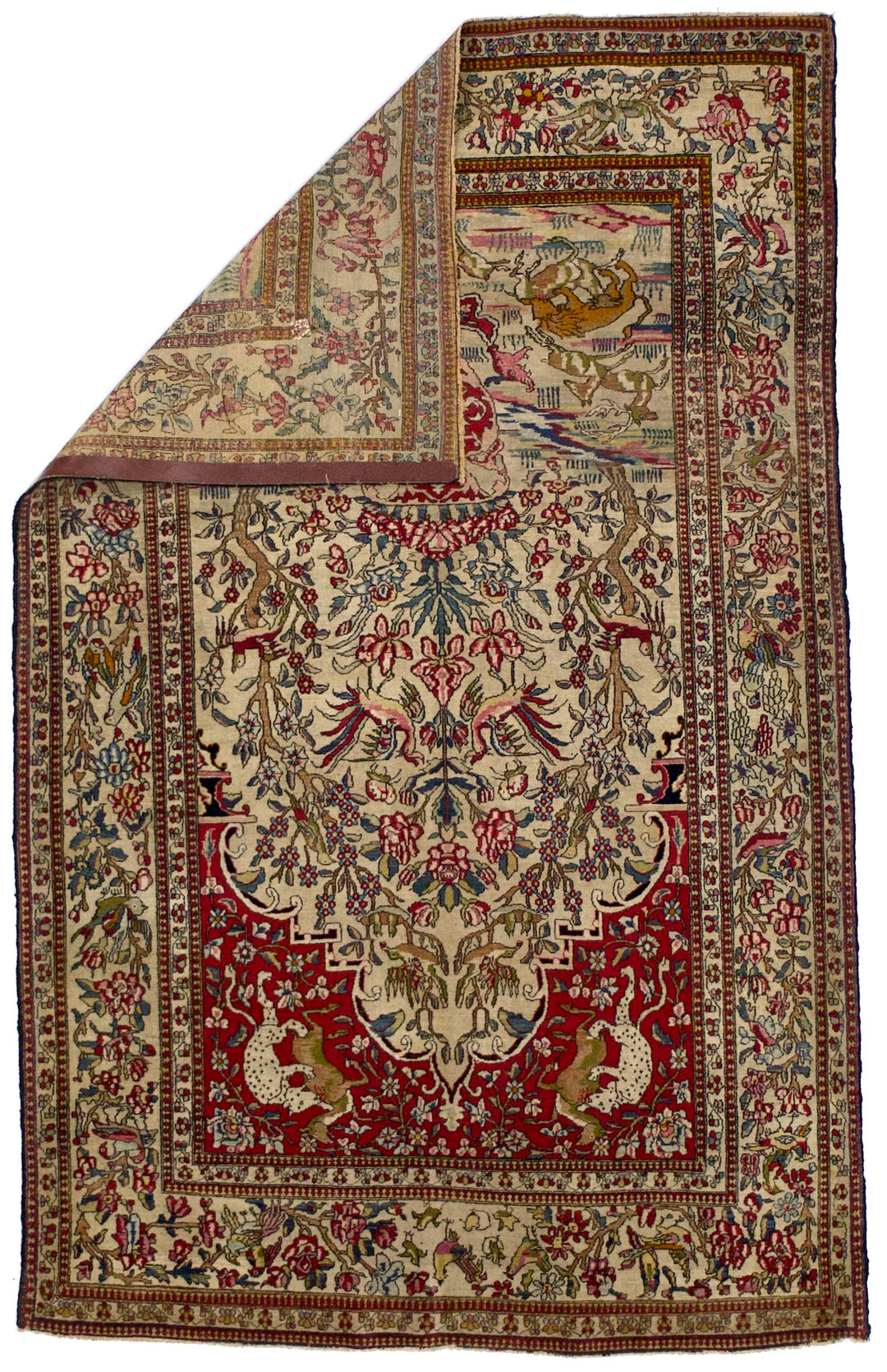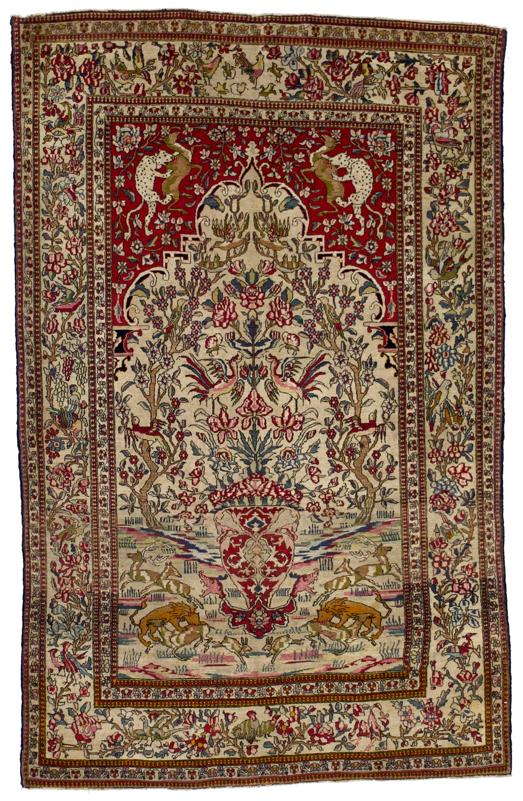 The interwar, finely woven curvilinear scatters and room sizes woven in the Persian capital city. Medallion, allover and directional/niche layouts. Extensive palettes and high quality wool, on cotton. Balanced drawing and perfect, though not stiff, execution. Originally woven for the Persian upper-class market. Expensive.