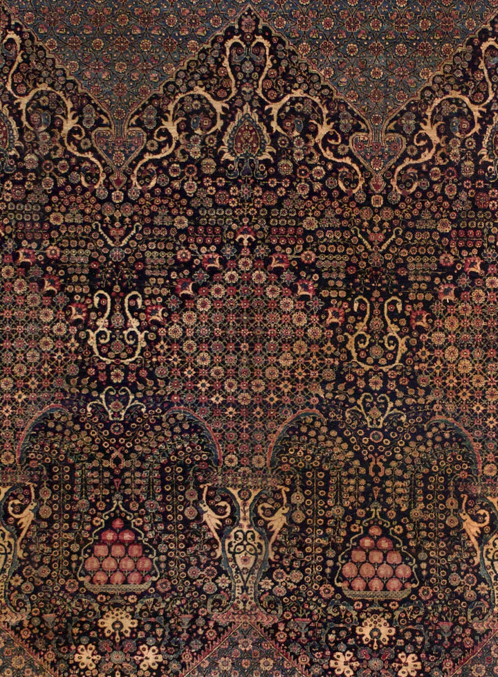 The interwar, finely woven curvilinear scatters and room sizes woven in the Persian capital city. Medallion, allover and directional/niche layouts. Extensive palettes and high quality wool, on cotton. Balanced drawing and perfect, though not stiff, execution. Originally woven for the Persian upper-class market. Expensive.
