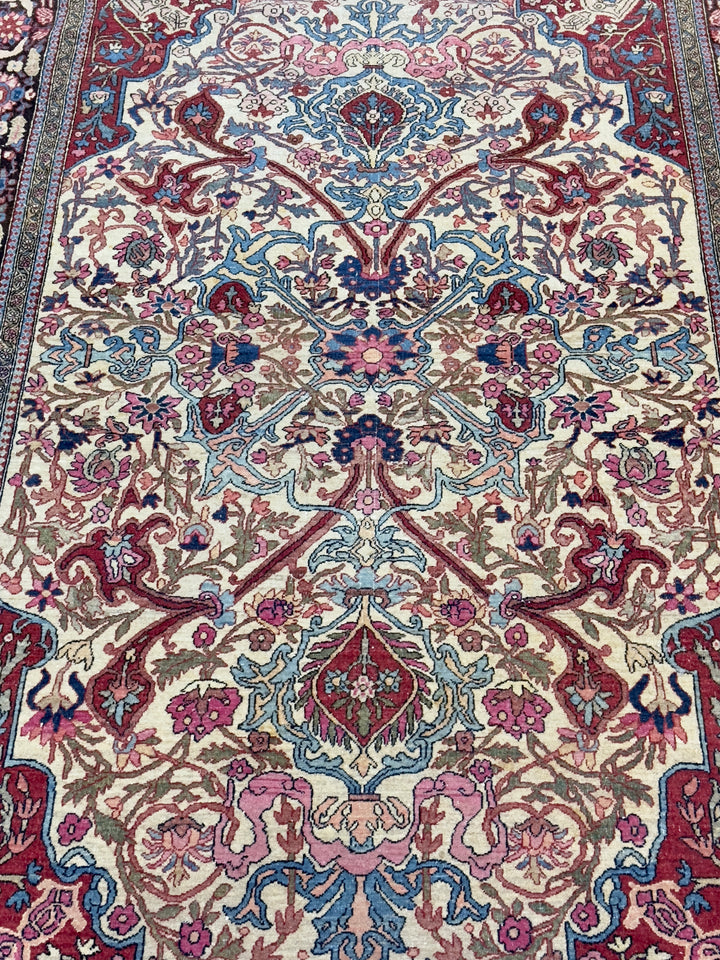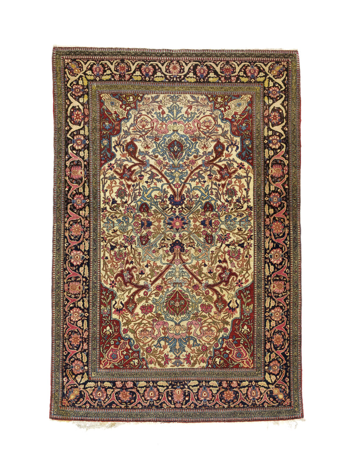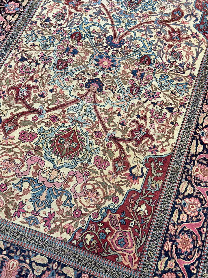 The interwar, finely woven curvilinear scatters and room sizes woven in the Persian capital city. Medallion, allover and directional/niche layouts. Extensive palettes and high quality wool, on cotton. Balanced drawing and perfect, though not stiff, execution. Originally woven for the Persian upper-class market.