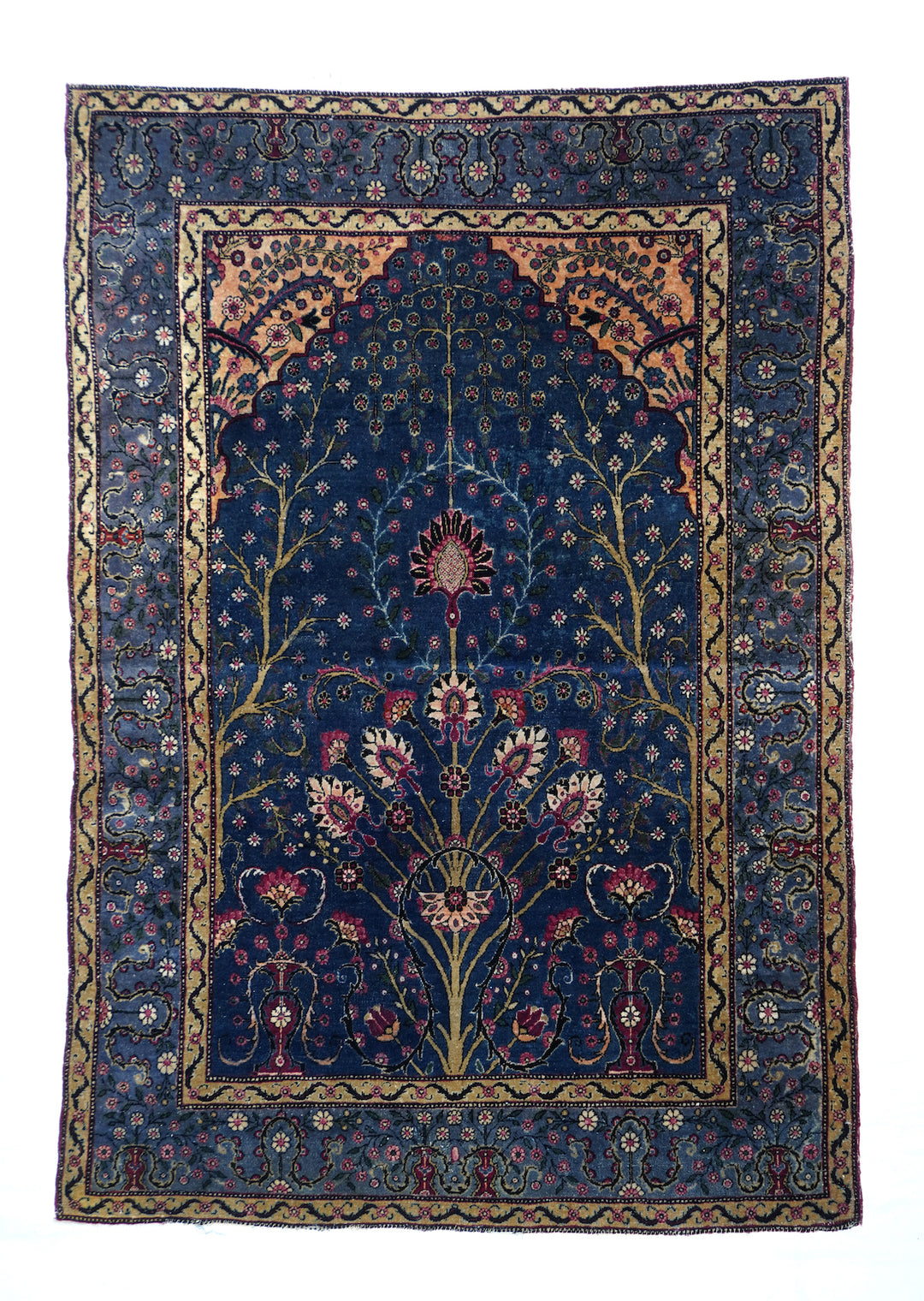 The interwar, finely woven curvilinear scatters and room sizes woven in the Persian capital city. Medallion, allover and directional/niche layouts. Extensive palettes and high quality wool, on cotton. Balanced drawing and perfect, though not stiff, execution. Originally woven for the Persian upper-class market.