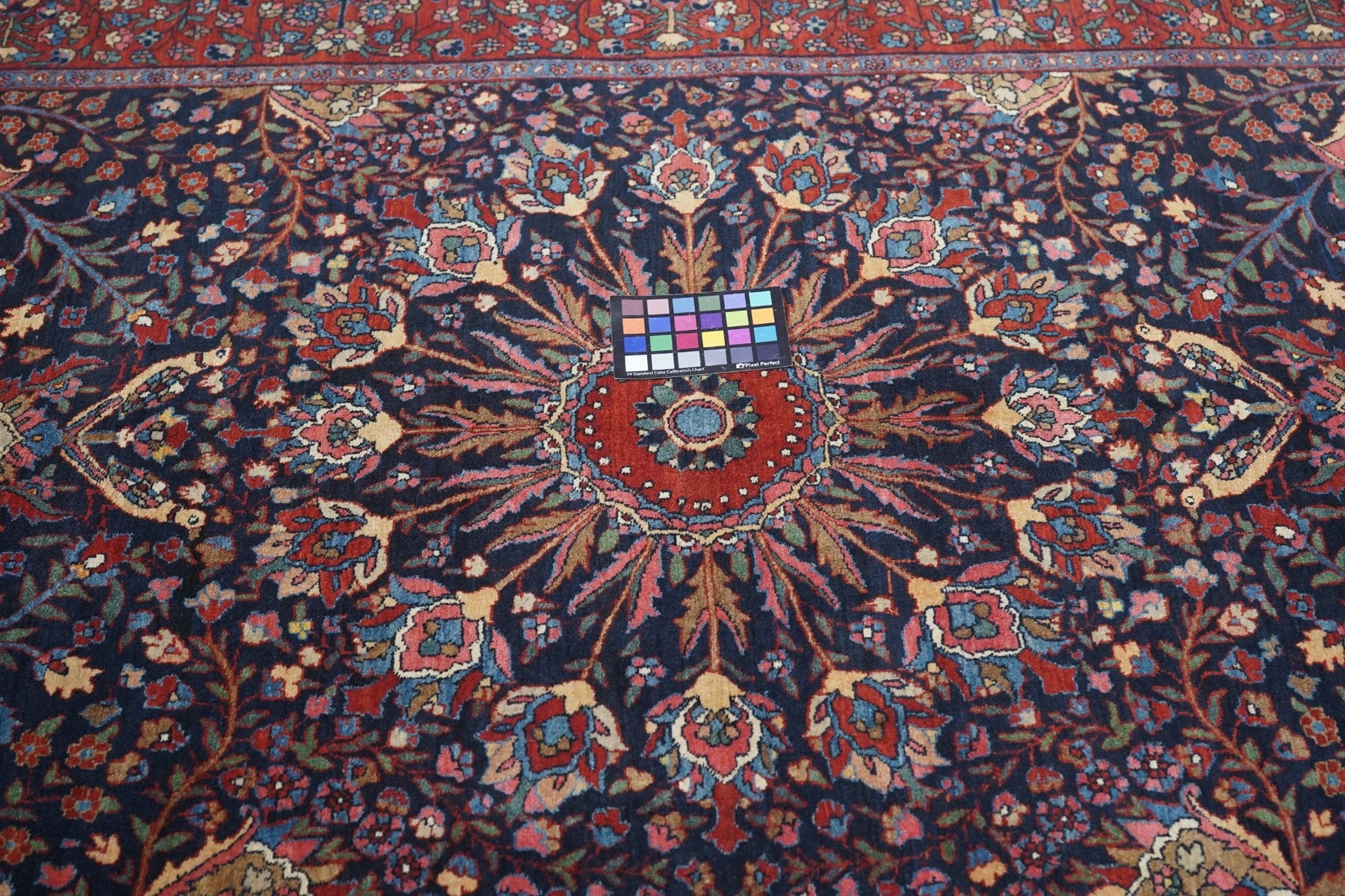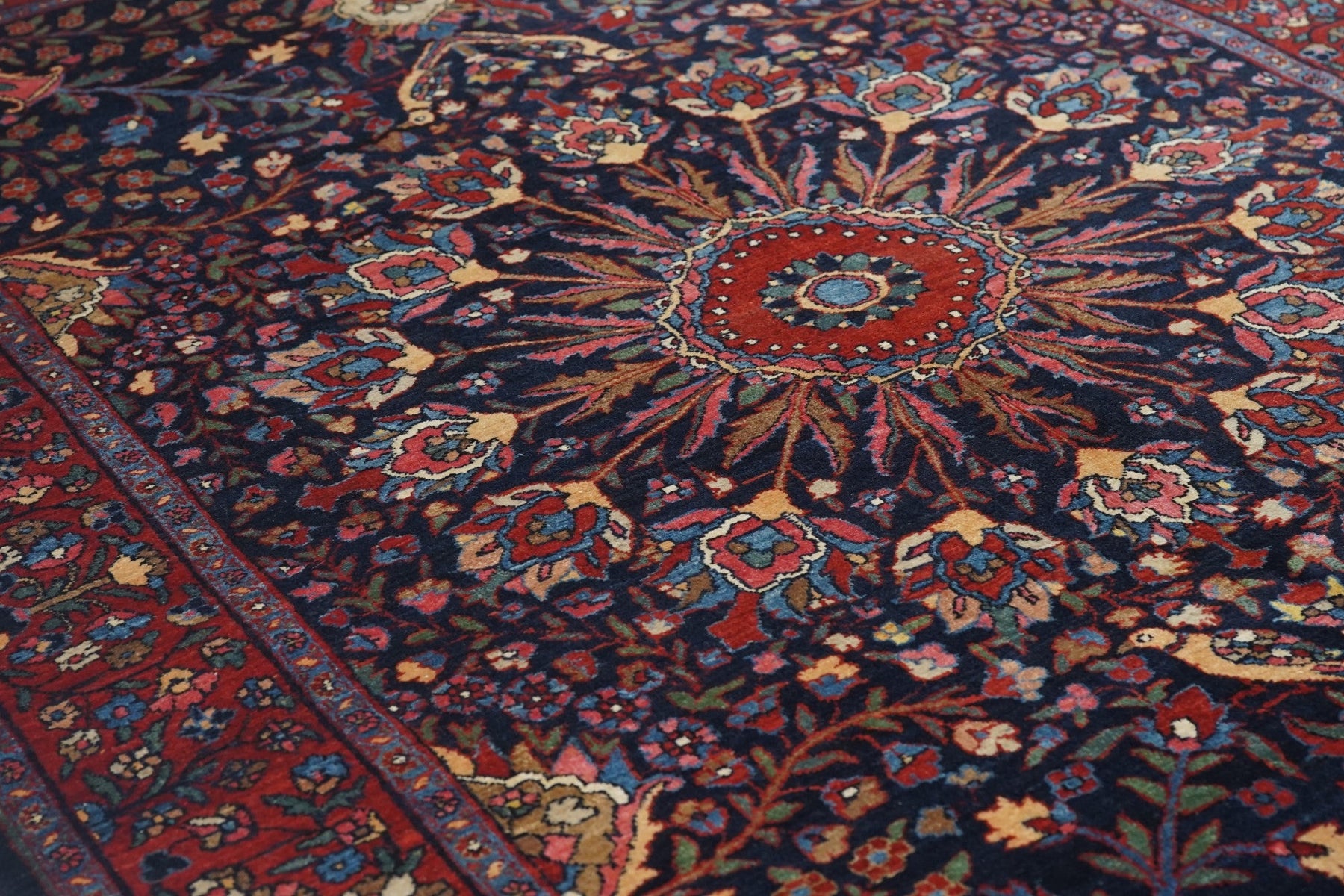 This well-woven Kurdish town scatter shows a radiating 16-palmette and leaf flowerhead pattern on a rich navy ground. Field corner diagonal vases. Wine red border of rosette sprays and upright whole flowers. Compact construction with short, but incredibly firm pile. Good condition. Probably c. 1925. The transition from wool to cotton warps on Bidjars began c. 1920.