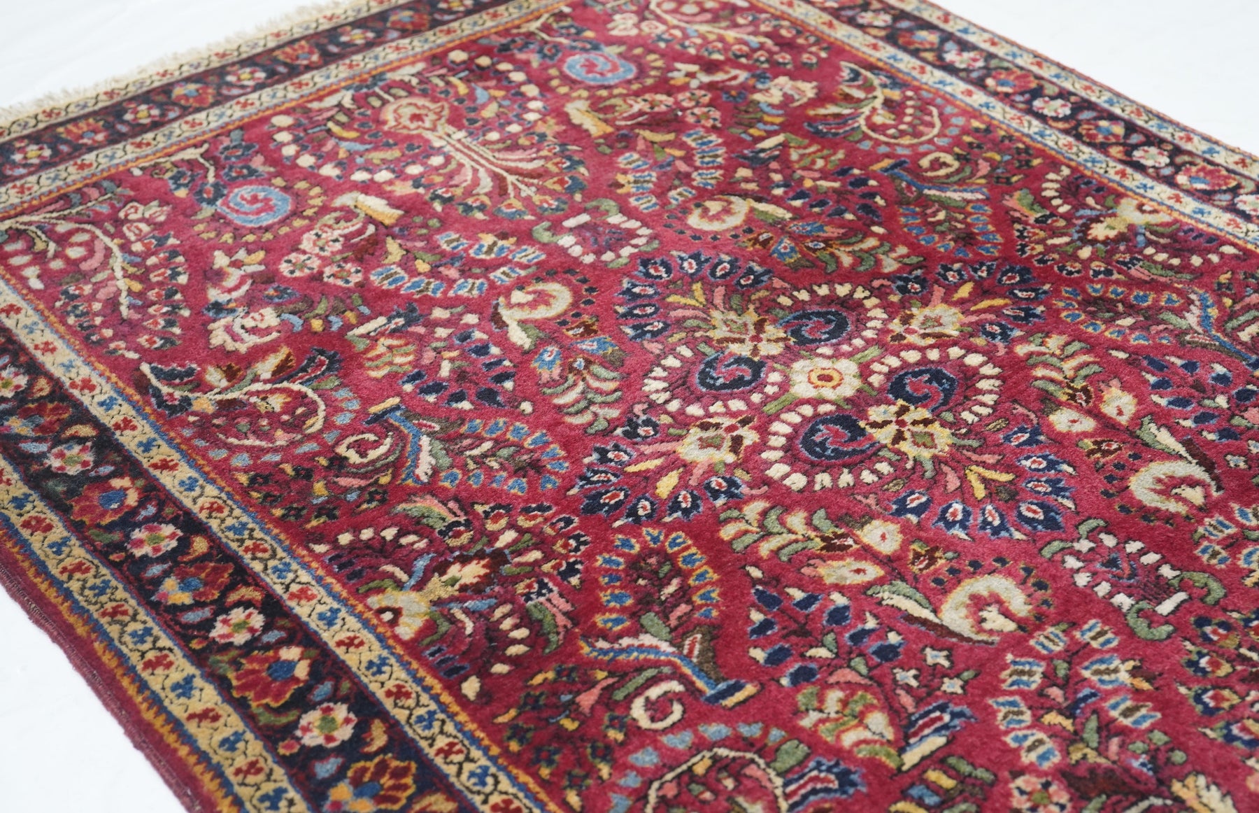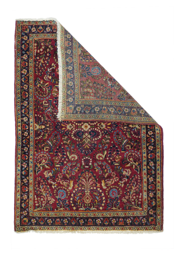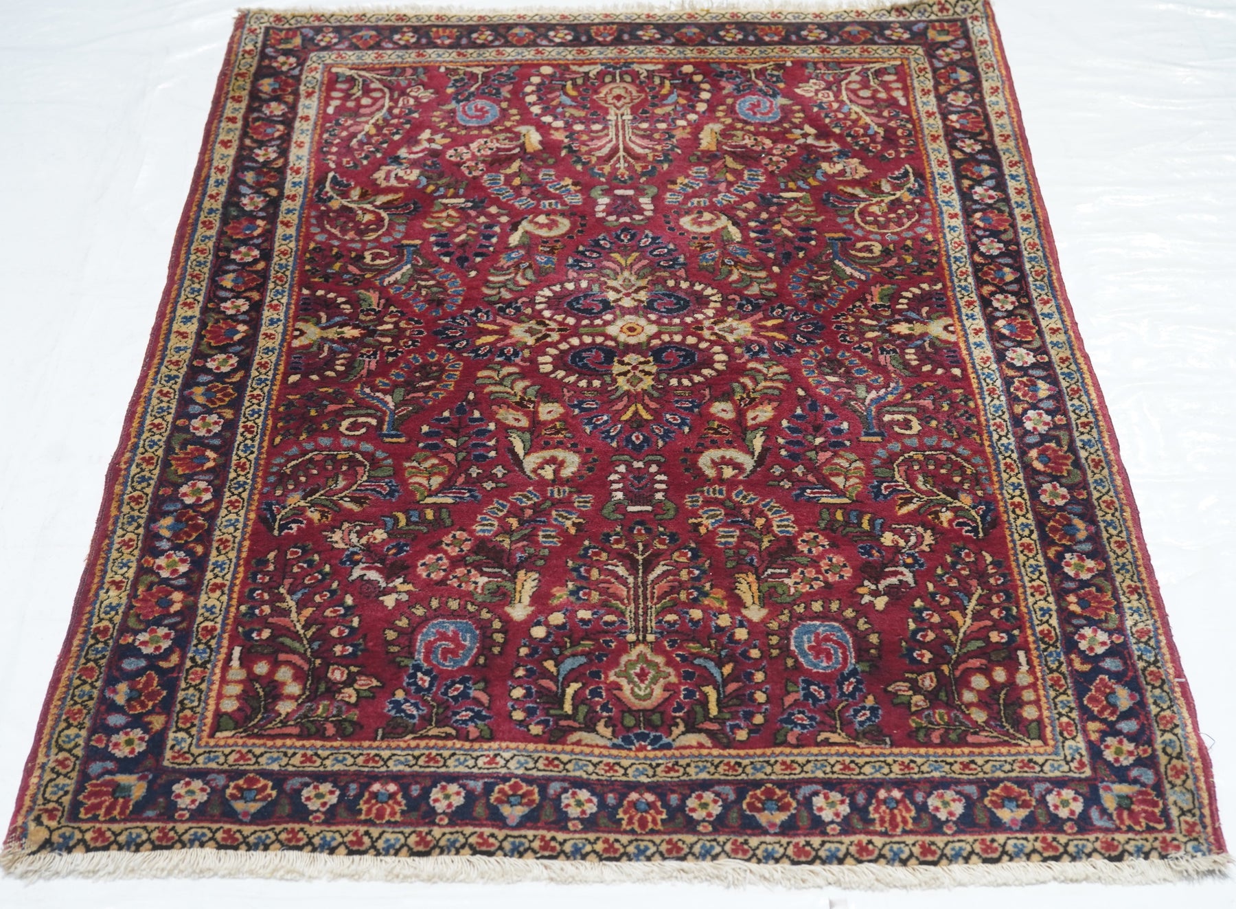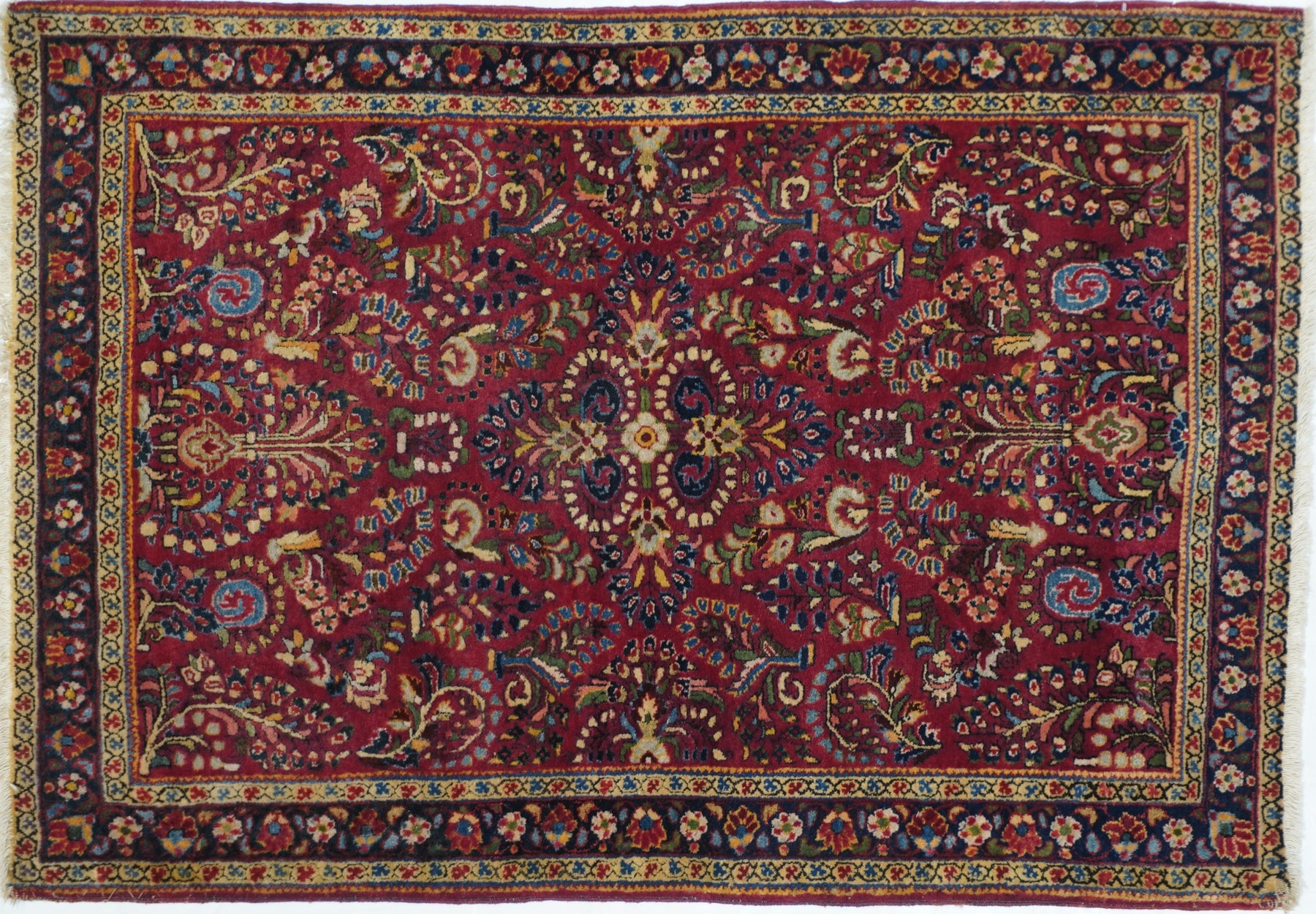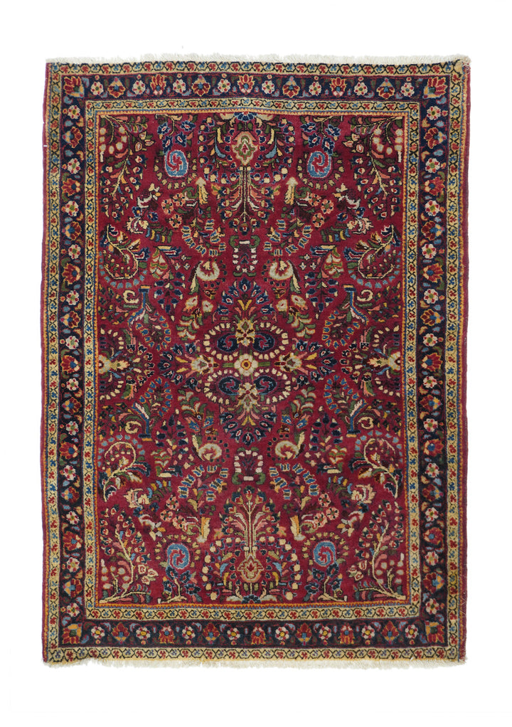 From Arak Province in western Persia, this village scatter in the “American” manner shows a red field with four ivory dot horseshoes centering a detached floral spray four way pattern. Navy narrow main border with rosettes and simple palmettes. Compact, leathery handle on cotton. Medium plus weave.