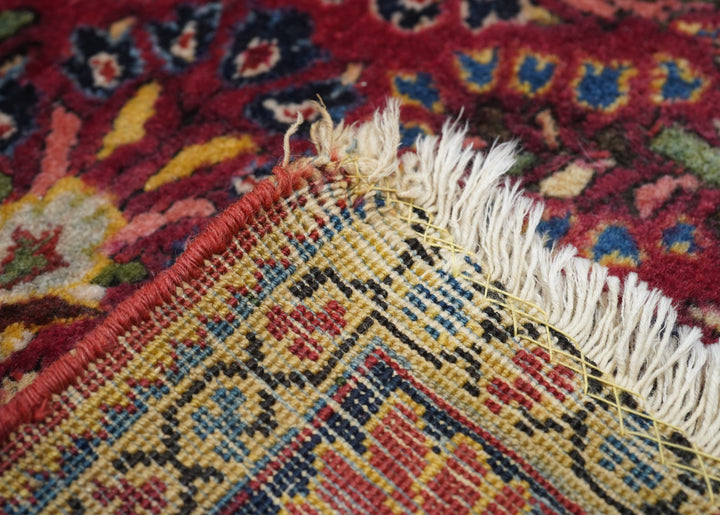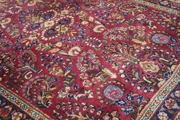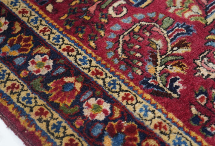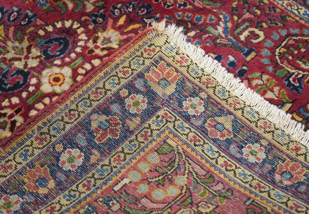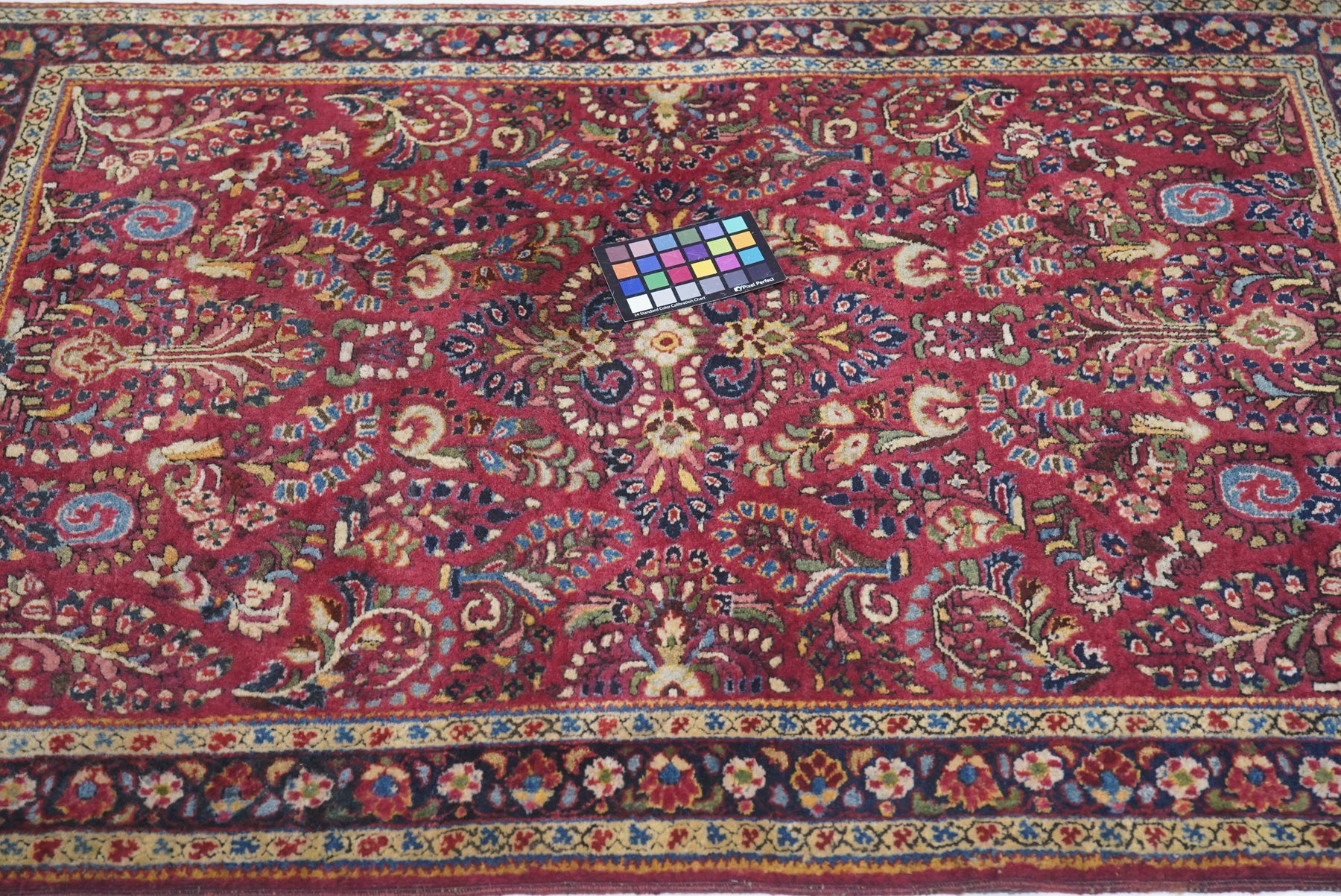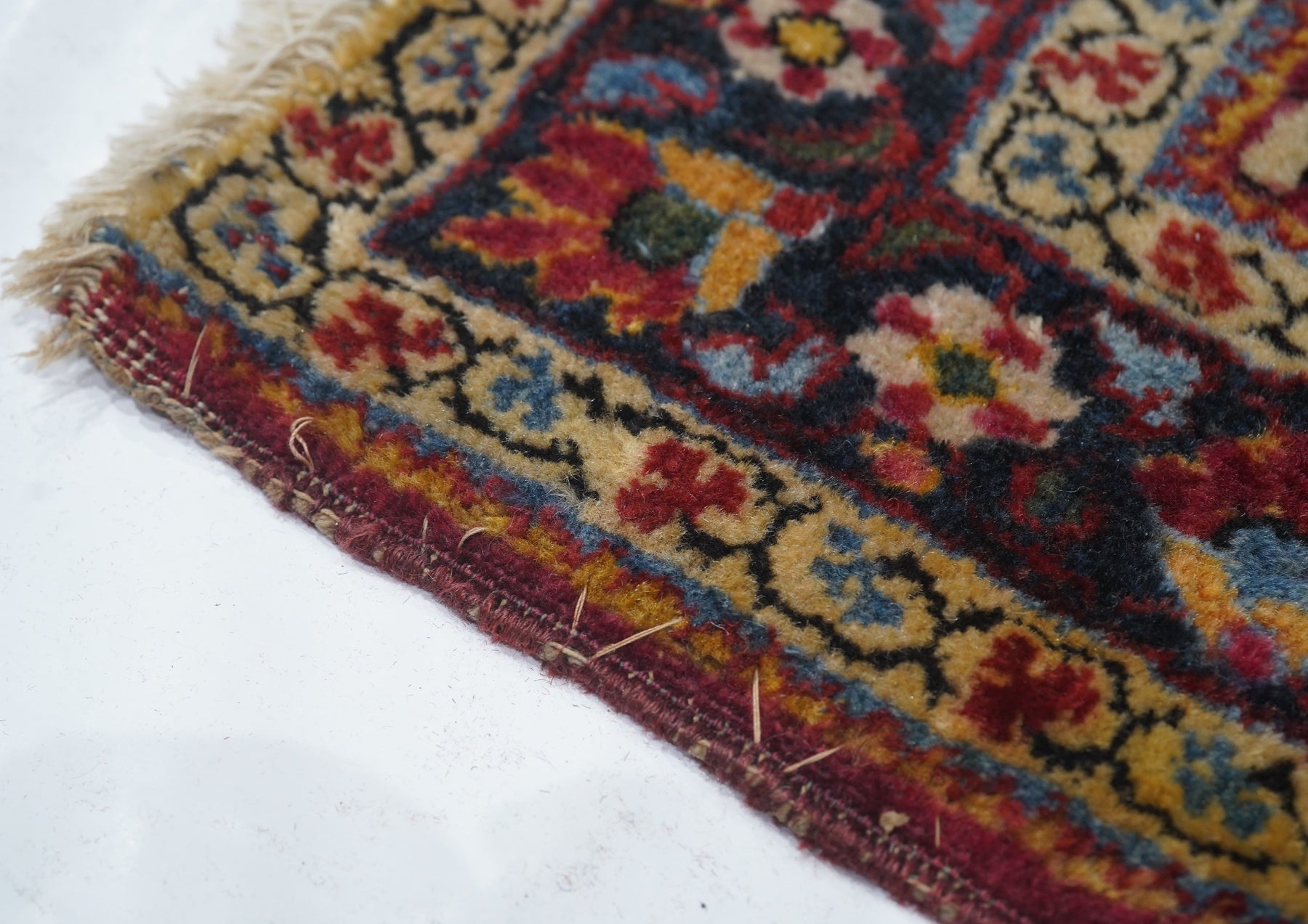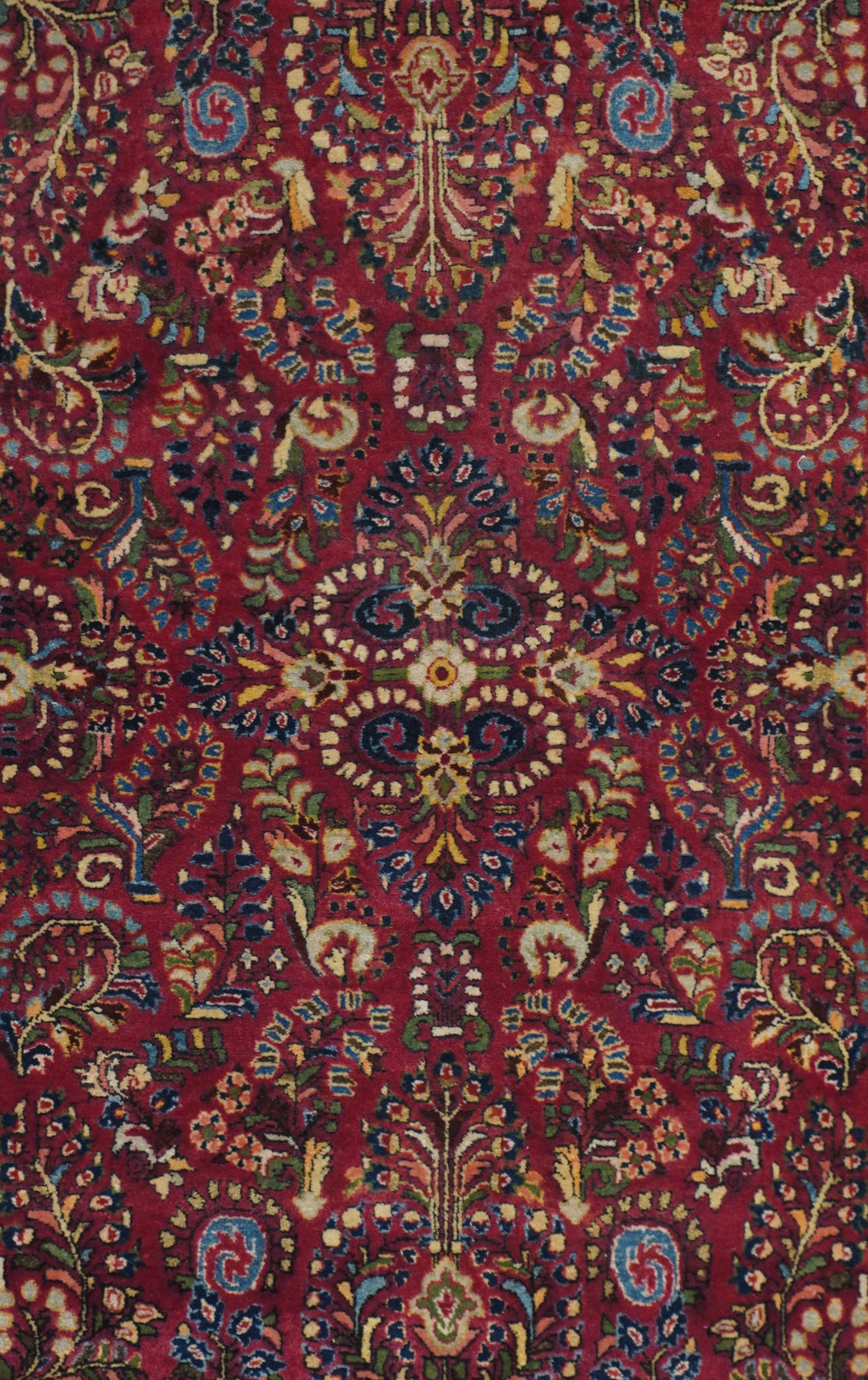 From Arak Province in western Persia, this village scatter in the “American” manner shows a red field with four ivory dot horseshoes centering a detached floral spray four way pattern. Navy narrow main border with rosettes and simple palmettes. Compact, leathery handle on cotton. Medium plus weave.