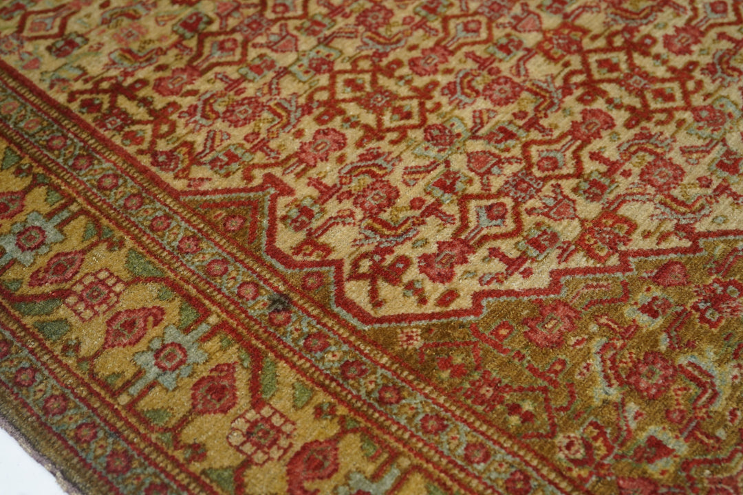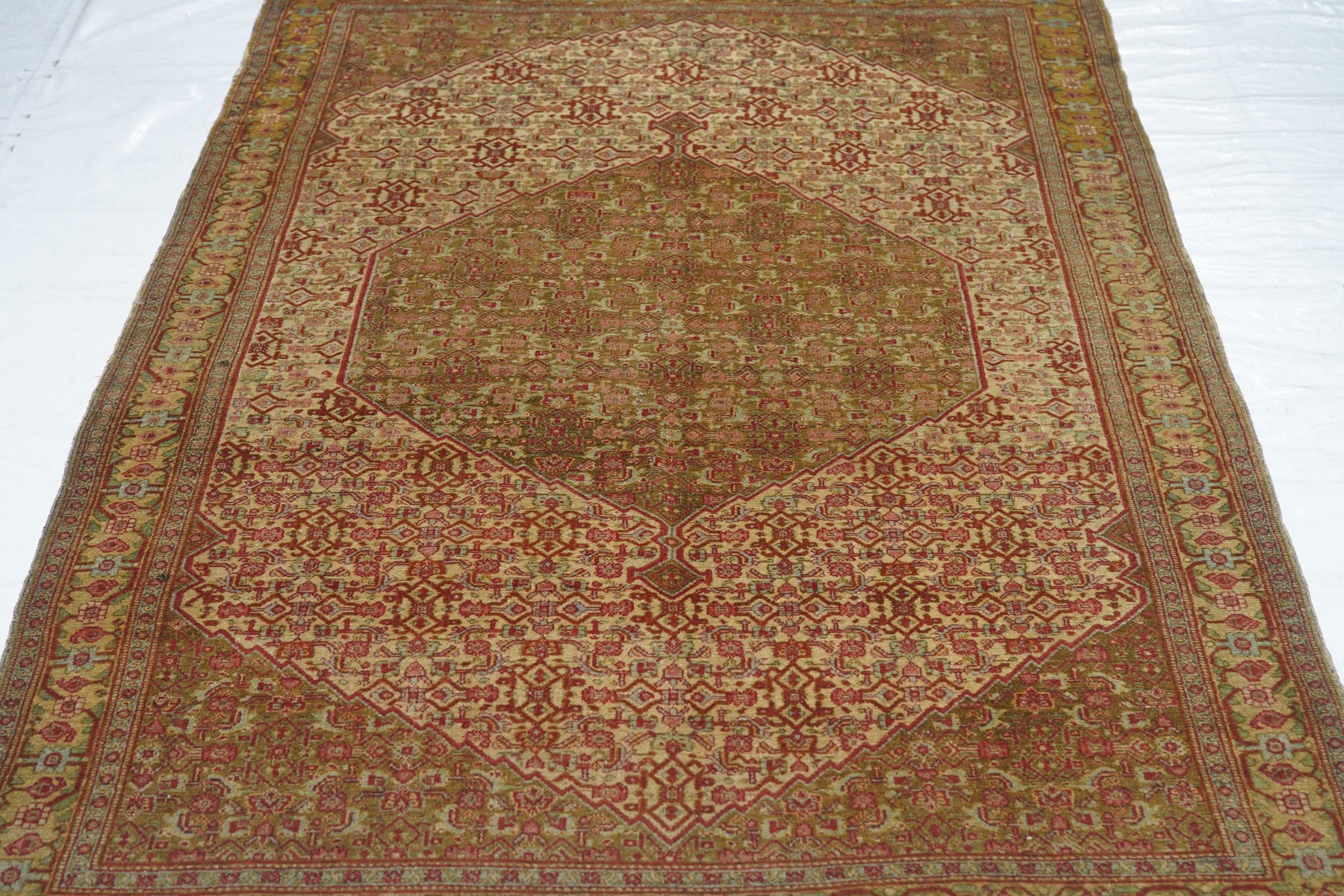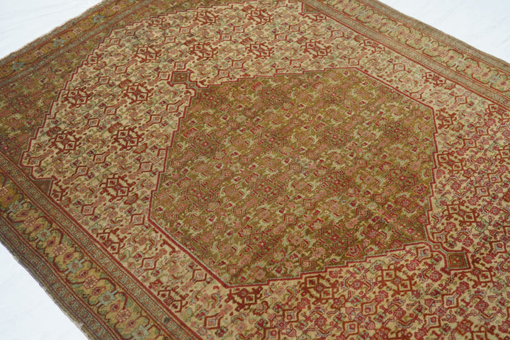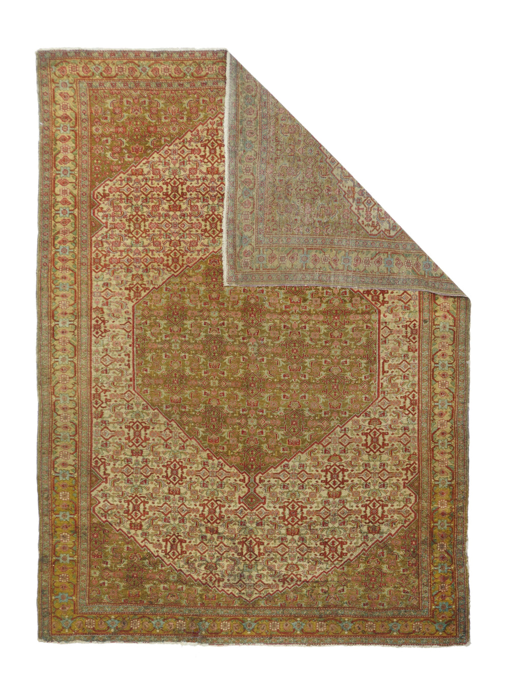 A uniform Herati design, varying only in color distribution, covers the hexagonal medallion, triangular corners and sandy-straw field of this well-woven western Persian Kurdish town rug from the seat of Kurdistan province, Sanandaj. The straw main border with rosettes and botehs gets more geometric on the sides and more fluid along the ends. Sandpapery, short-clipped pile, cotton foundation, single weft. Good condition.