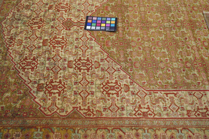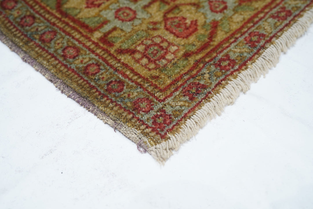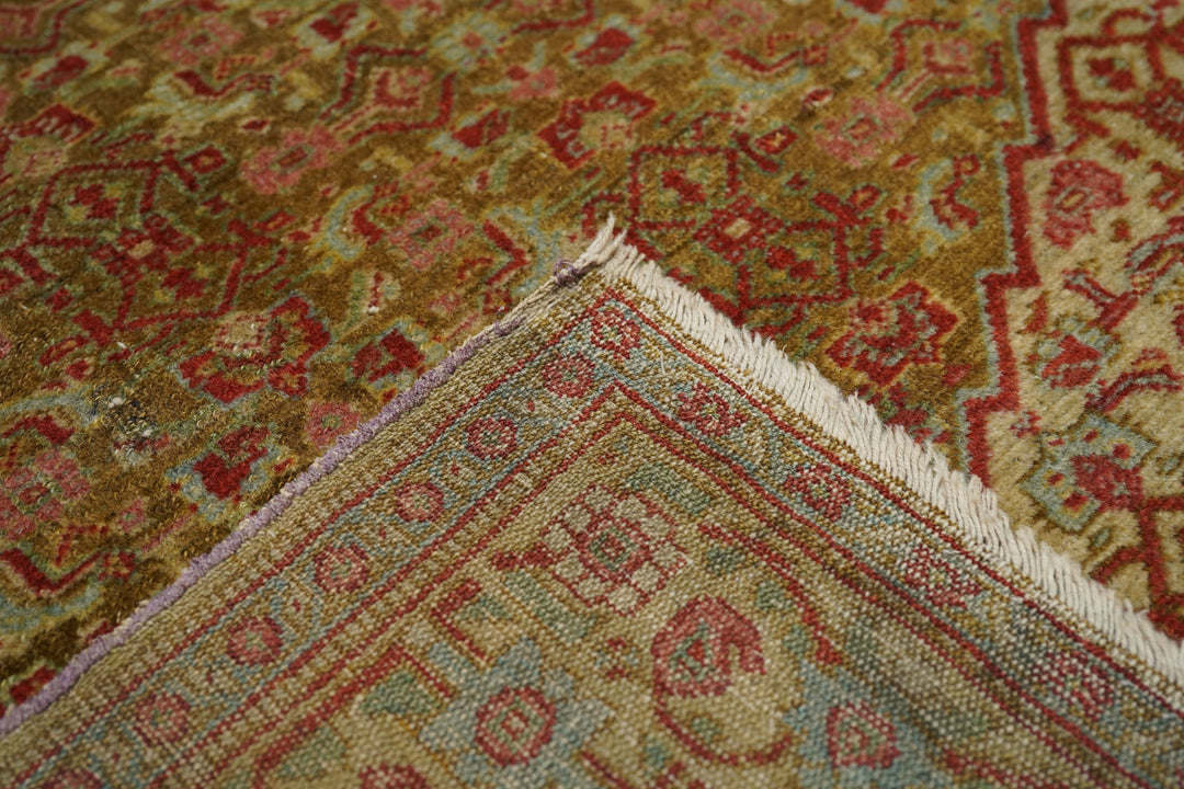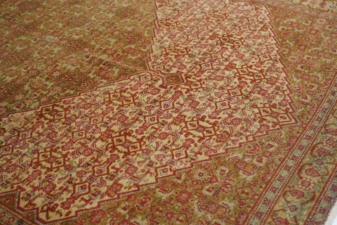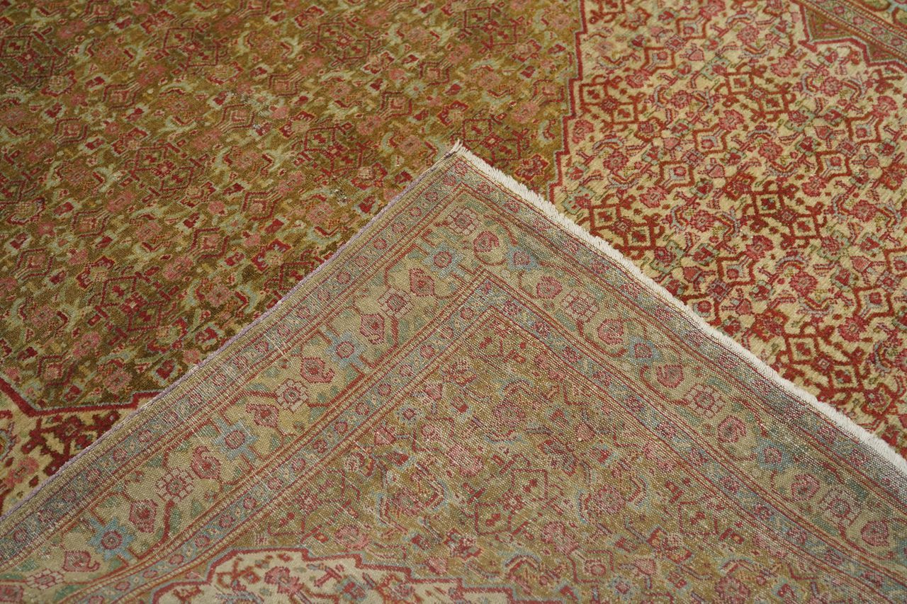 A uniform Herati design, varying only in color distribution, covers the hexagonal medallion, triangular corners and sandy-straw field of this well-woven western Persian Kurdish town rug from the seat of Kurdistan province, Sanandaj. The straw main border with rosettes and botehs gets more geometric on the sides and more fluid along the ends. Sandpapery, short-clipped pile, cotton foundation, single weft. Good condition.