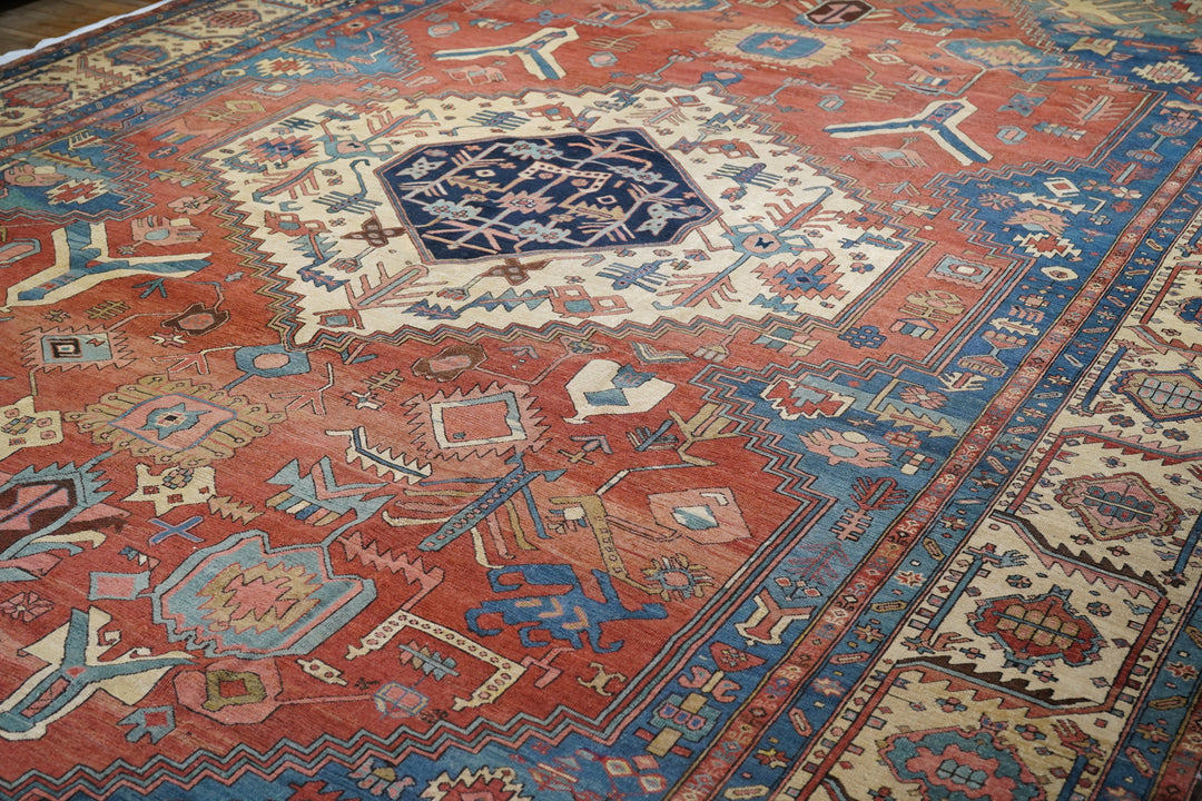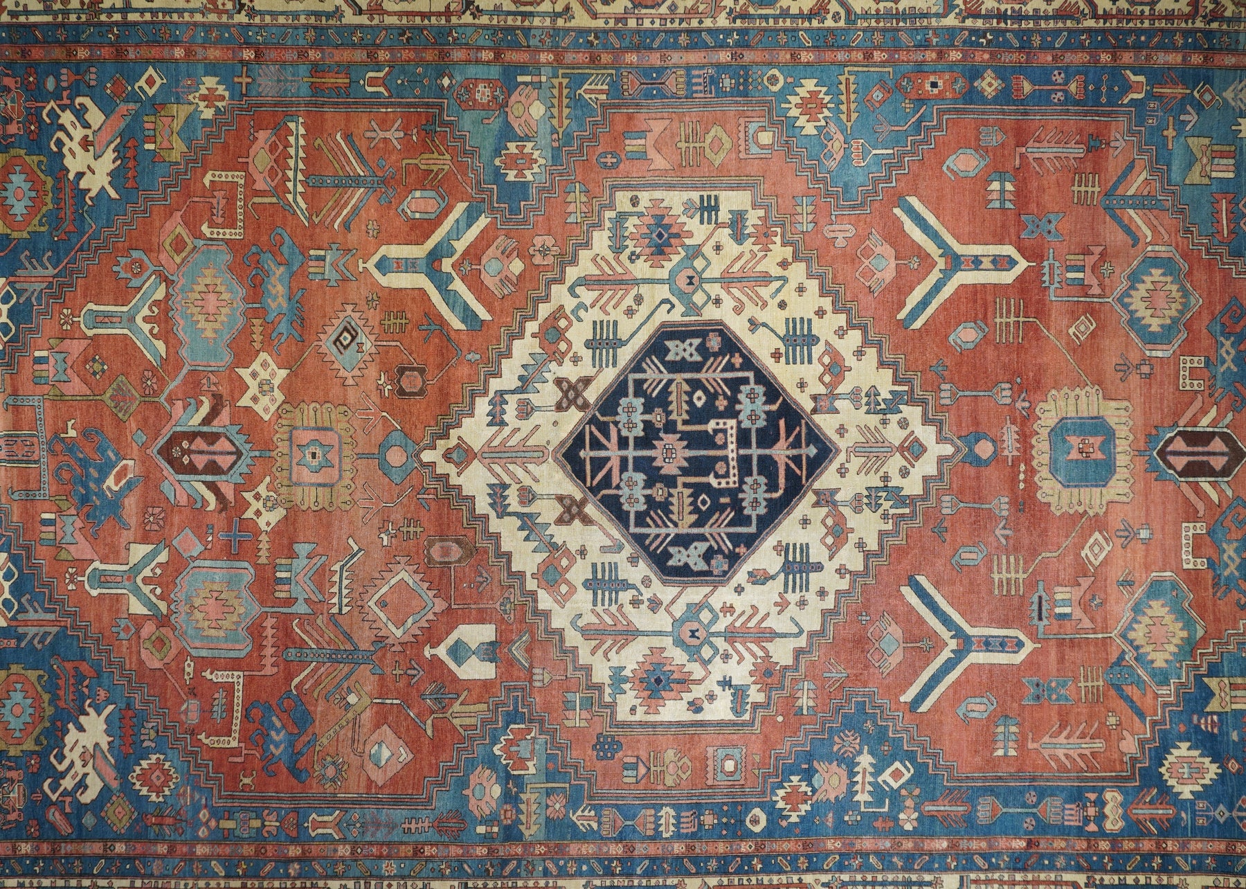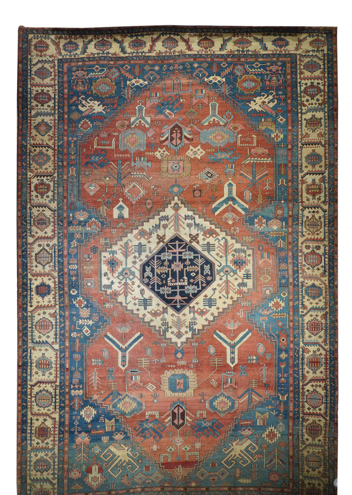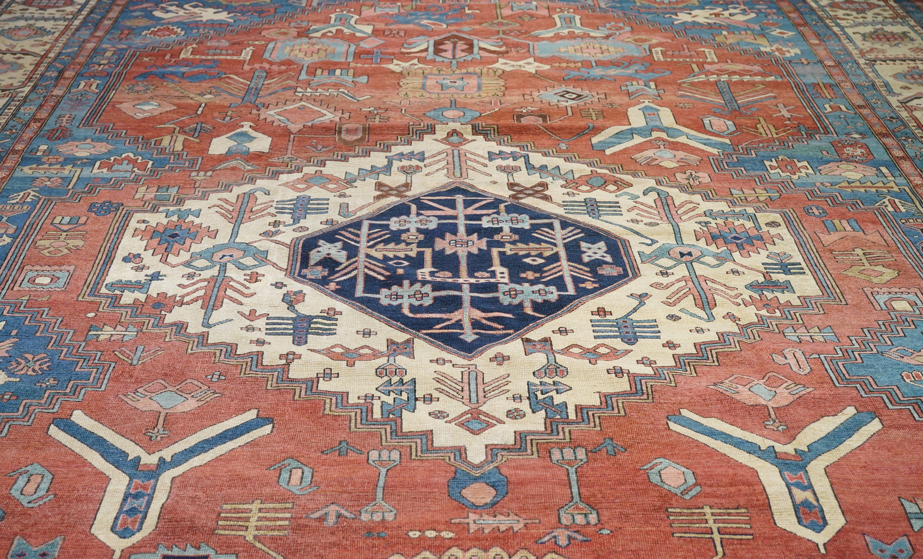 A higher grade of Heriz carpets, usually in medallion designs, with crisp natural dyes, and primarily woven between 1900 and 1930. Red field, navy border is the most popular combination. Semi-geometric.No town of ‘Serapi’. Robustly woven on cotton, with Turkish knots. Moderate weave. Expensive.