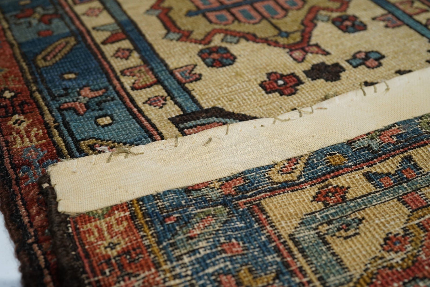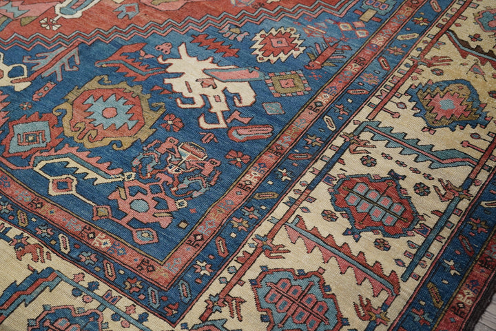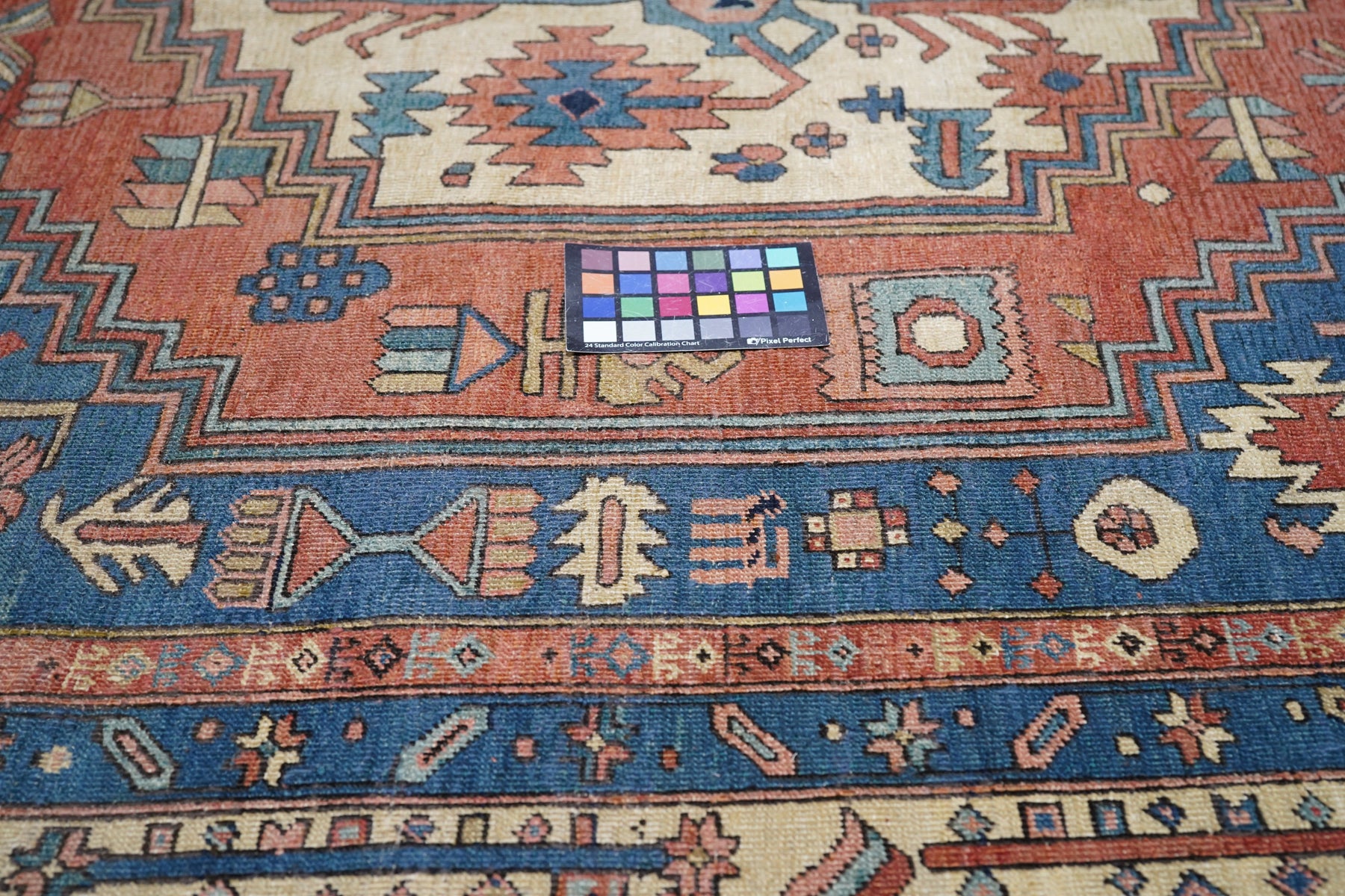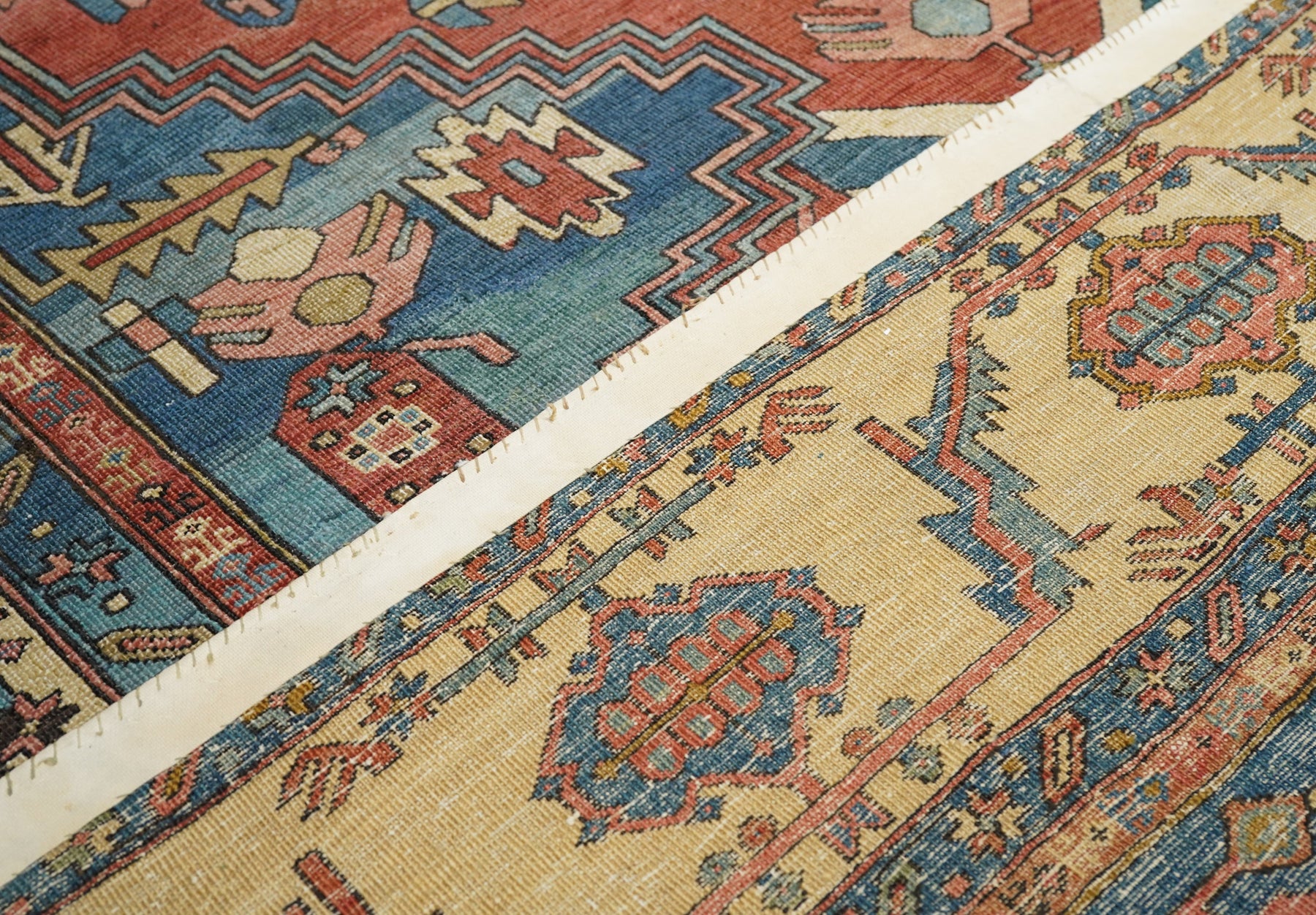 A higher grade of Heriz carpets, usually in medallion designs, with crisp natural dyes, and primarily woven between 1900 and 1930. Red field, navy border is the most popular combination. Semi-geometric.No town of ‘Serapi’. Robustly woven on cotton, with Turkish knots. Moderate weave. Expensive.