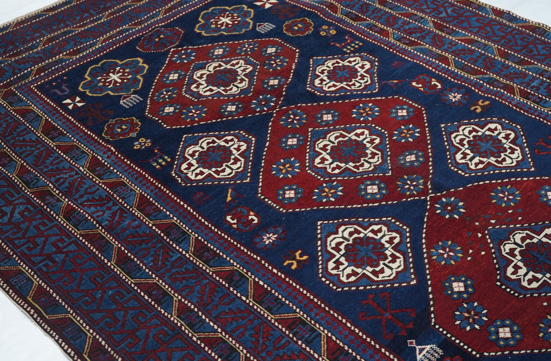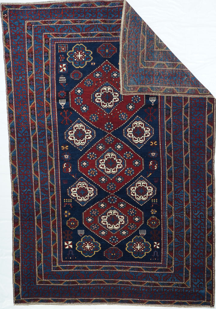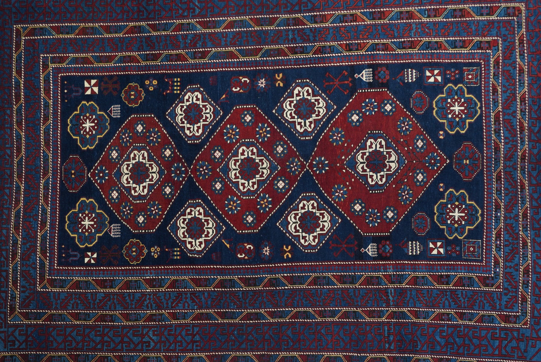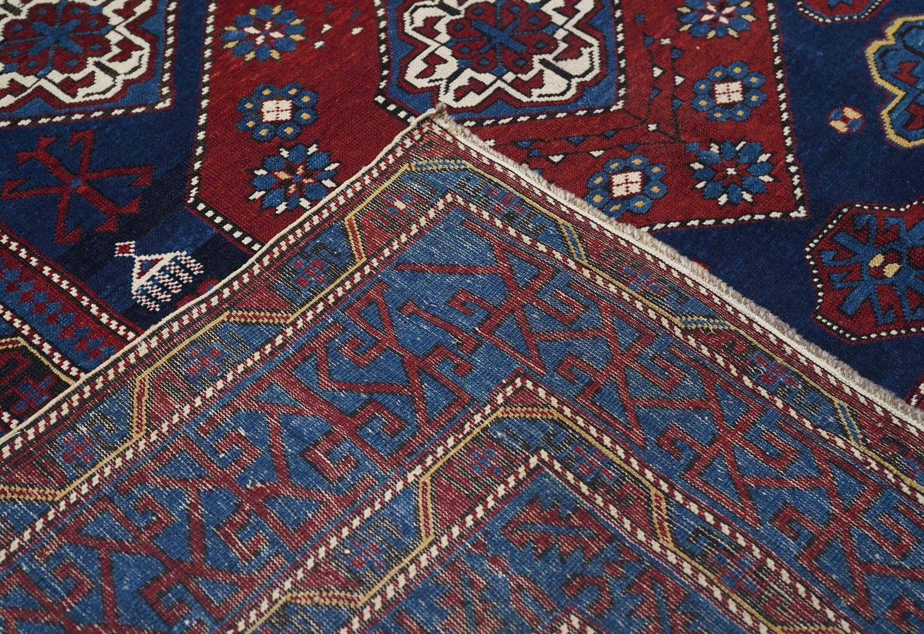 This east Caucasian well-woven scatter is basically a study in blue tones: royal blue for the field and abrashed medium-dark blue in the border system. Three hexagonal red panels enclose each an eight petal ivory rosette, and this motif reappears eight time. in ivory and blue in secondary field elements. Numerous borders including a blue and red main border with fractured, geometric curled motives and an inner second border with a calyx and slanted leaf design. Well-woven original close-clipped pile, wool foundation. Good condition.