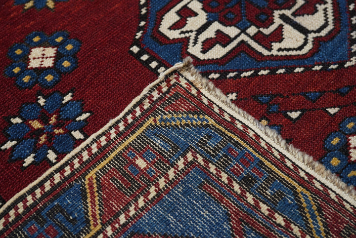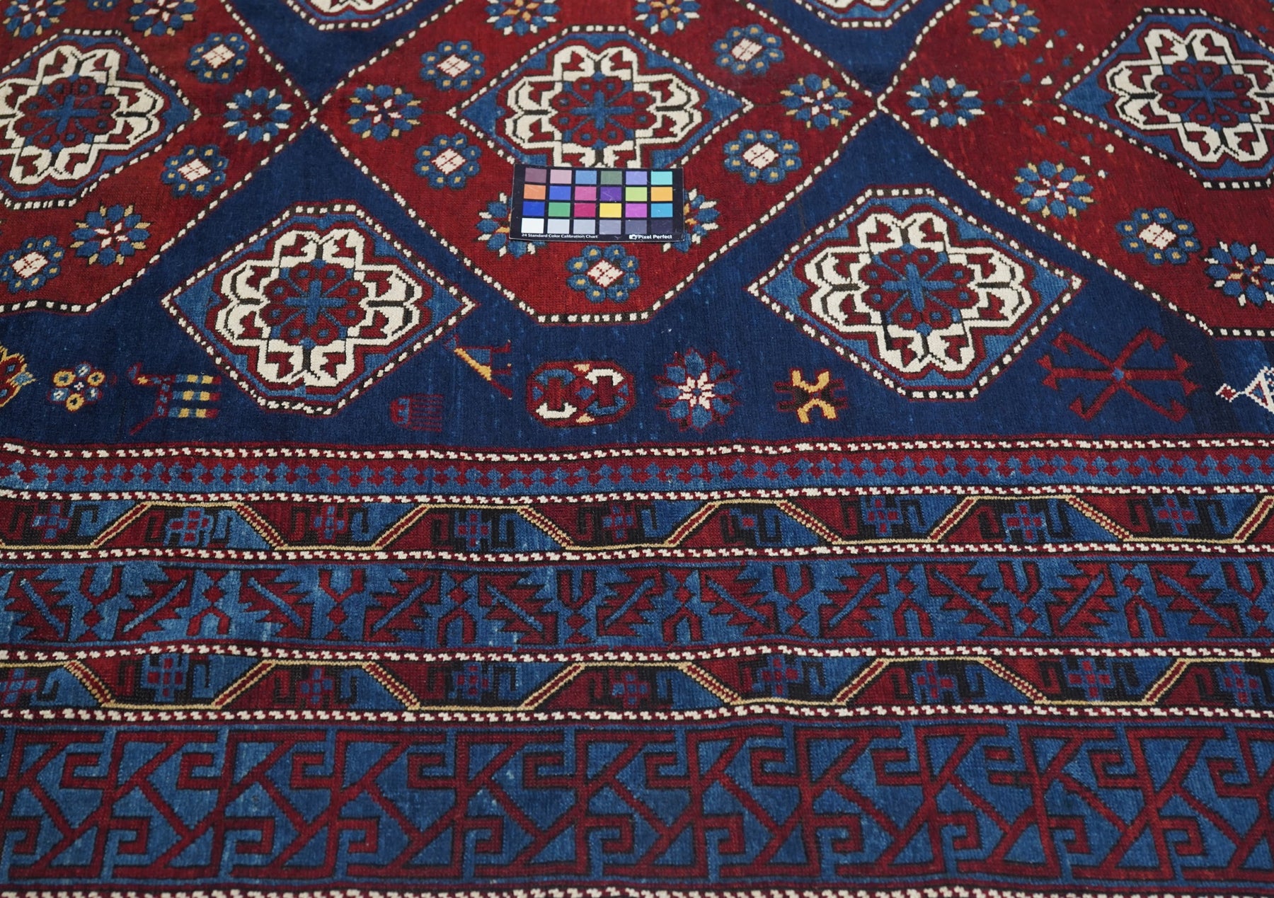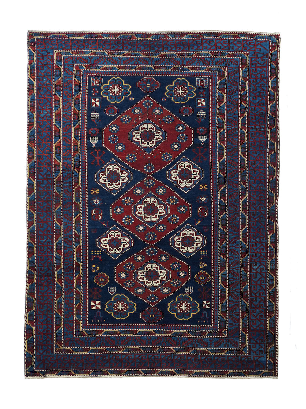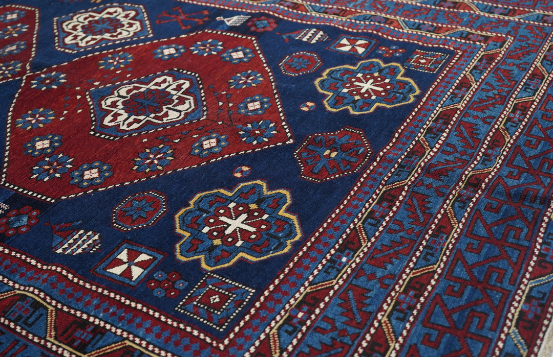 This east Caucasian well-woven scatter is basically a study in blue tones: royal blue for the field and abrashed medium-dark blue in the border system. Three hexagonal red panels enclose each an eight petal ivory rosette, and this motif reappears eight time. in ivory and blue in secondary field elements. Numerous borders including a blue and red main border with fractured, geometric curled motives and an inner second border with a calyx and slanted leaf design. Well-woven original close-clipped pile, wool foundation. Good condition.