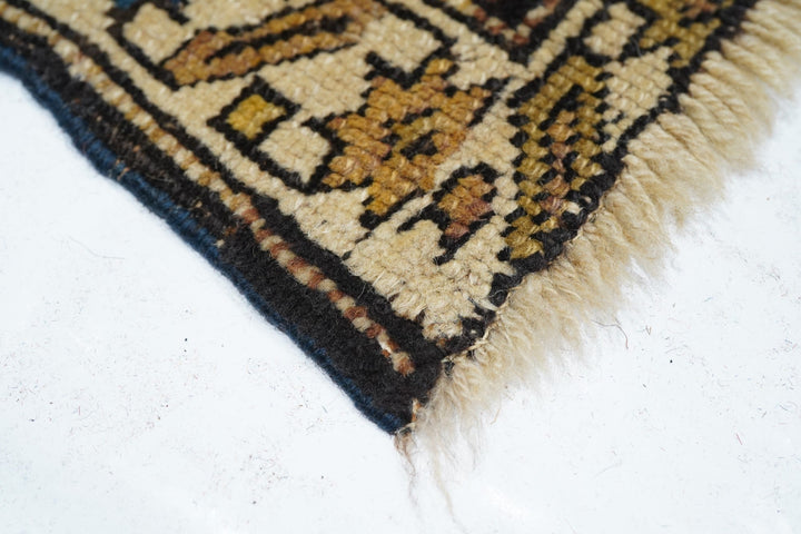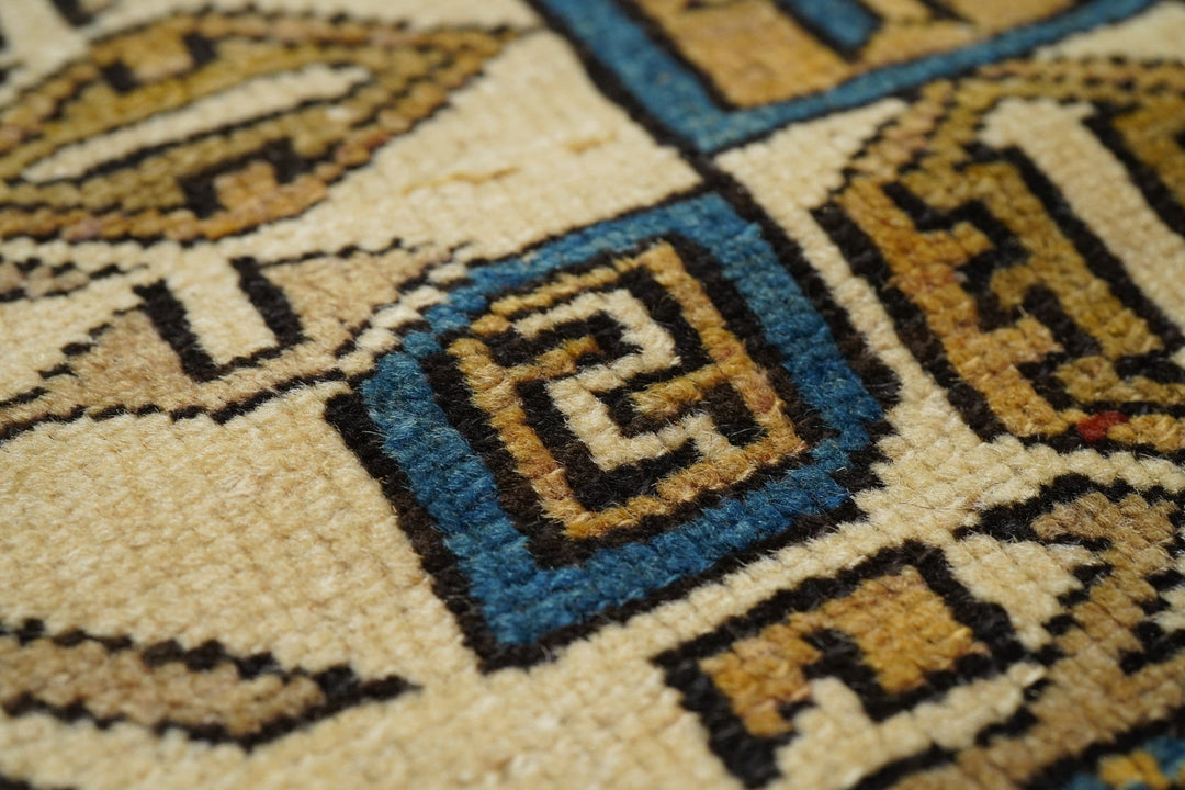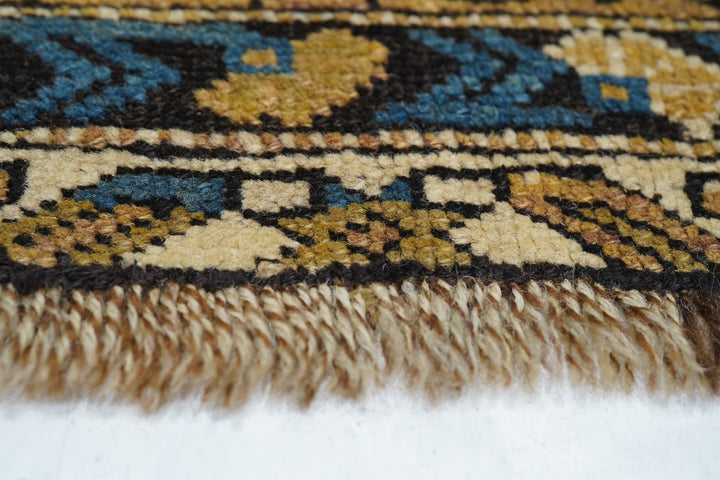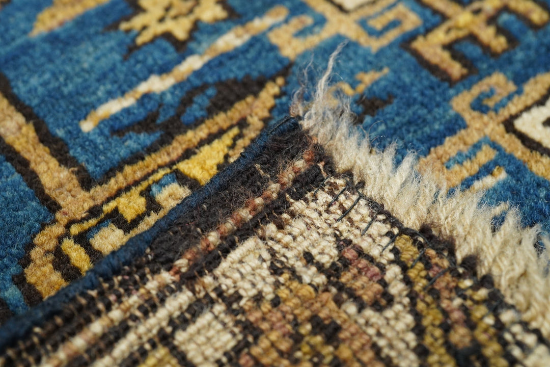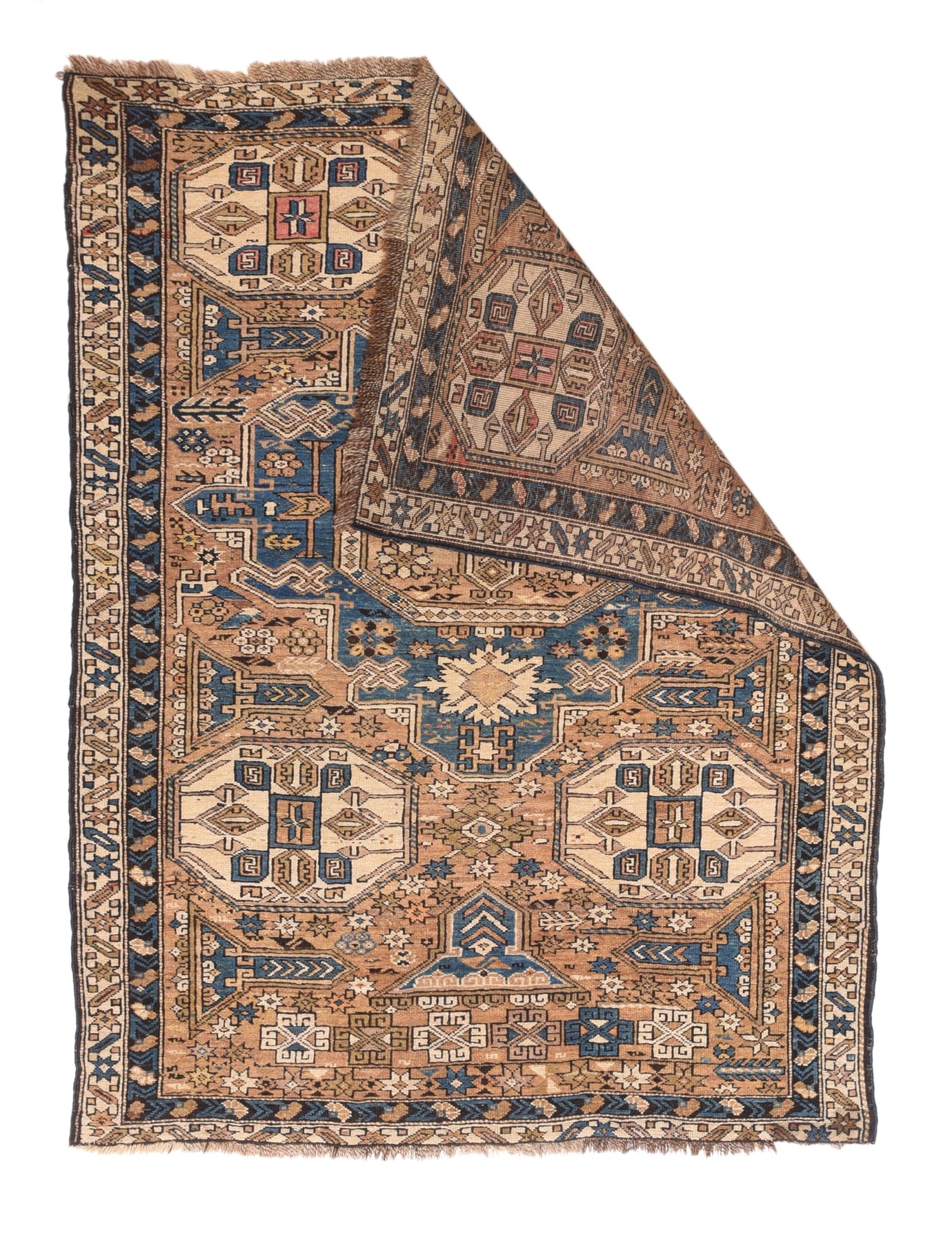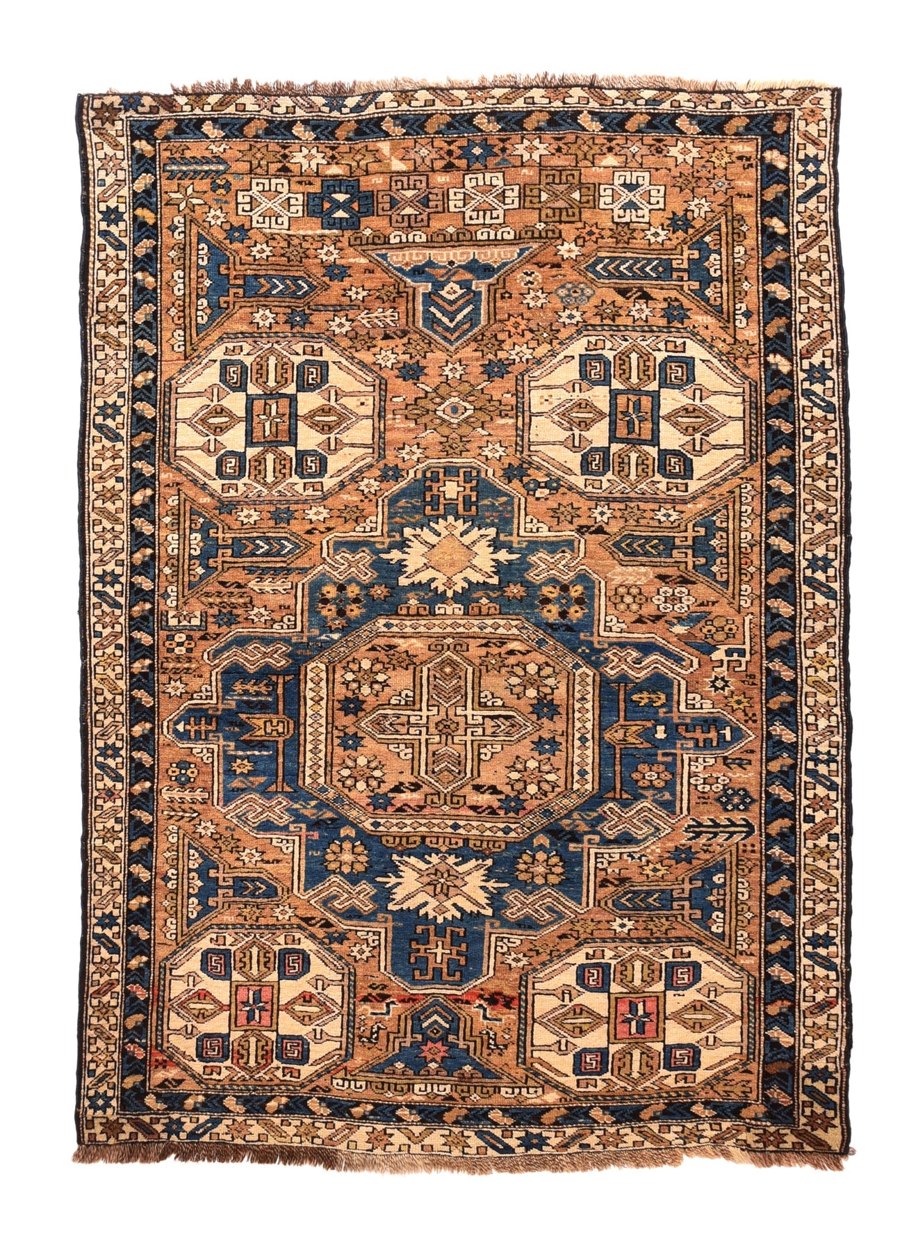 Adapted from a flat-woven Sumac rug design, this east Caucasian scatter shows a single reticulated medium blue faceted cruciform medallion with four pale straw secondary octagons and lateral; “rocket ships” on a dusty rose field. A row of squared volute rosettes at one end. Inner Carnation border and an outer of stars and oblique bars. Fair condition with slight end reduction. Needs a stretch to even it out. East Caucasian.