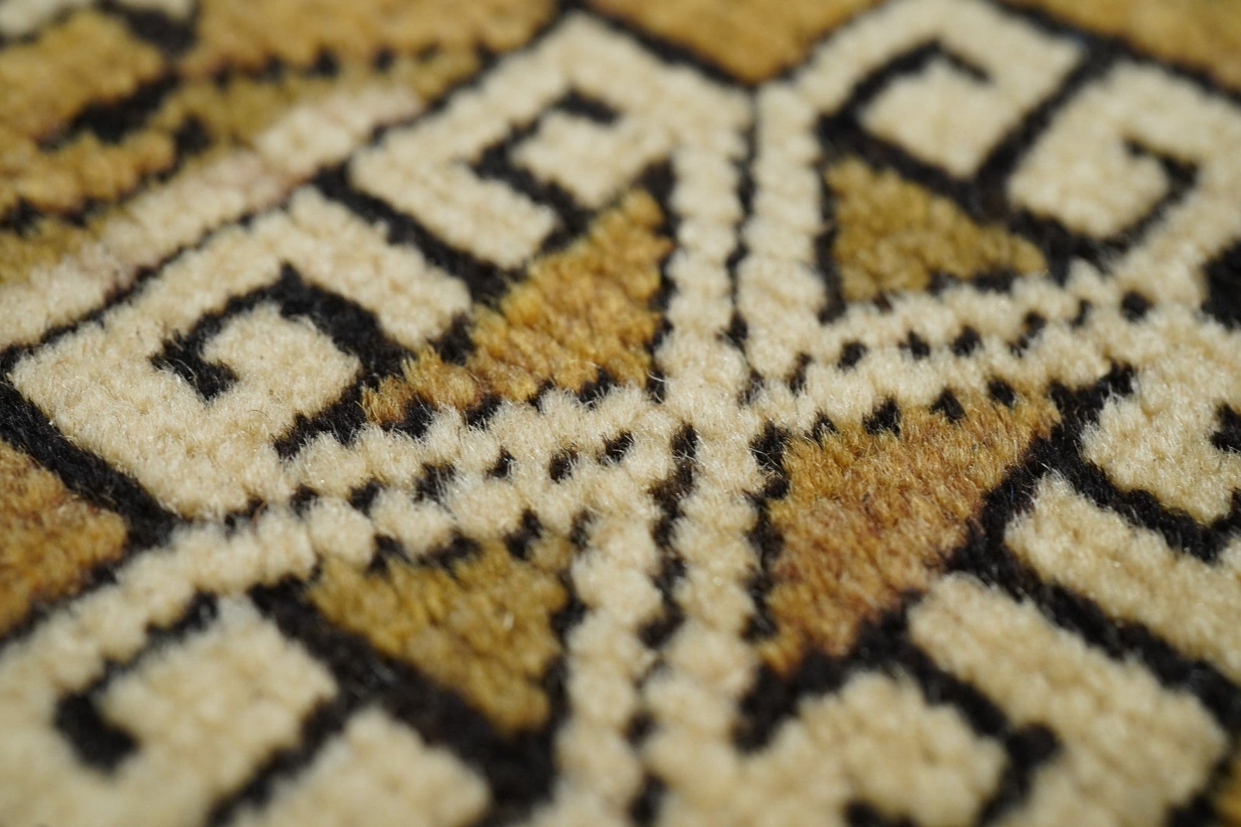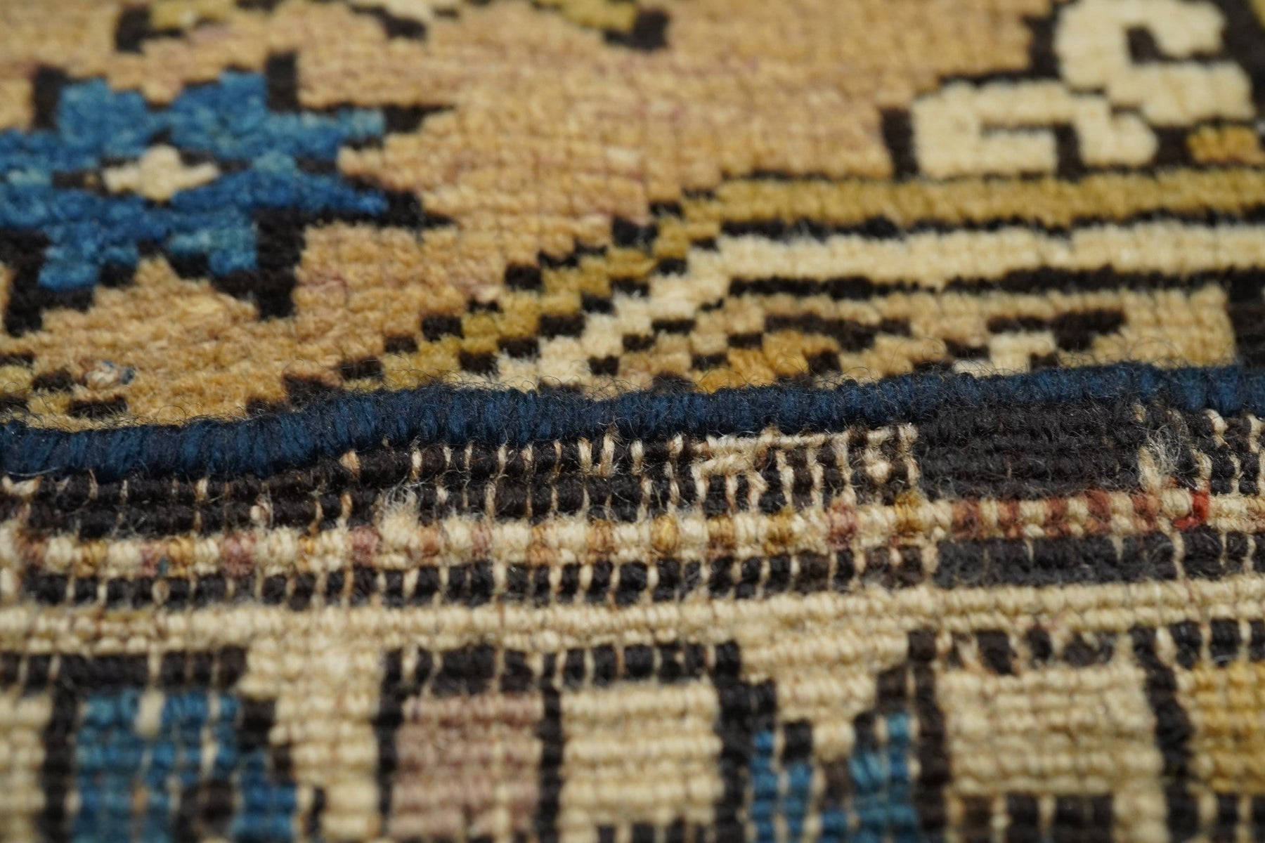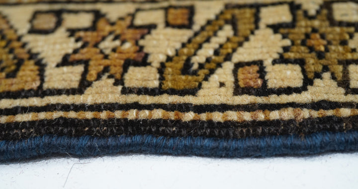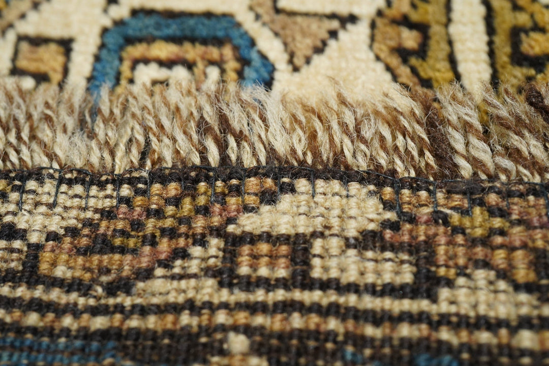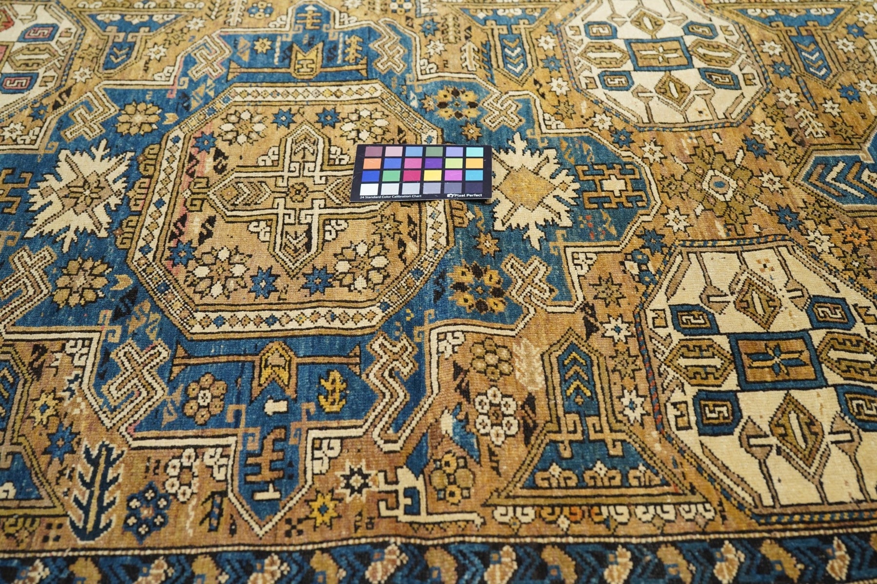 Adapted from a flat-woven Sumac rug design, this east Caucasian scatter shows a single reticulated medium blue faceted cruciform medallion with four pale straw secondary octagons and lateral; “rocket ships” on a dusty rose field. A row of squared volute rosettes at one end. Inner Carnation border and an outer of stars and oblique bars. Fair condition with slight end reduction. Needs a stretch to even it out. East Caucasian.