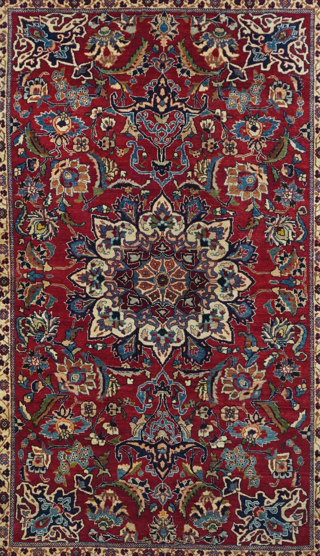 This very finely woven central Persian town small scatter shows a rich palette starting with the saturated red field which support a central ivory round medallion with eight spadiform points. Cerulean blue outlines the pendants, navy pointed corners, and freely flowing petal palmettes. Cerulean border with reversing palmettes. Velvety surface texture. Unsigned, but reasonably attributable to an esteemed Nain workshop. Good condition.