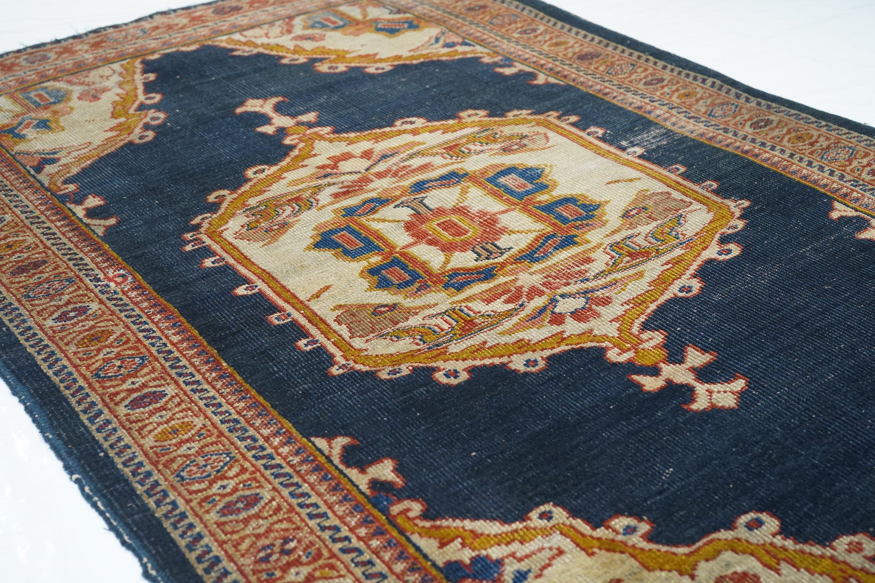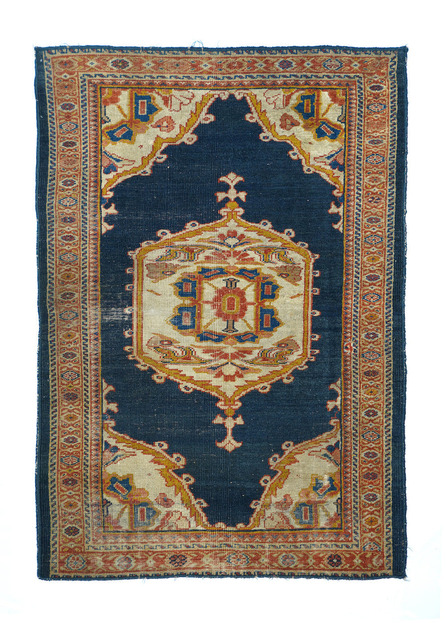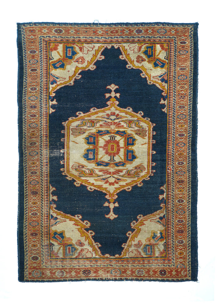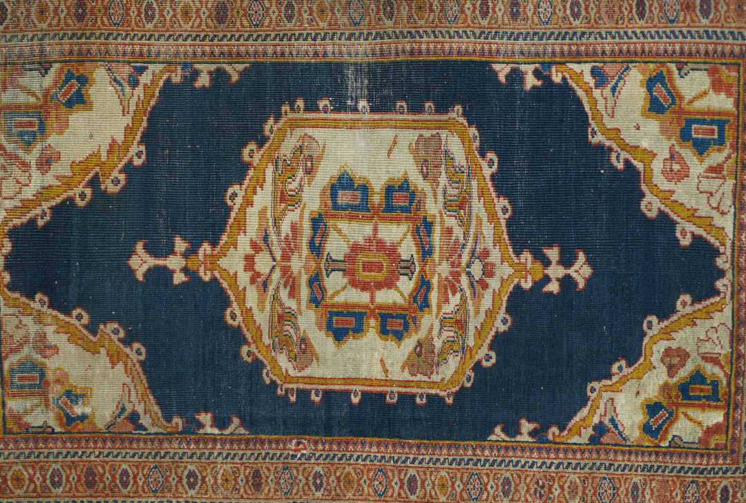 The rustic character of this west Persian, Arak Province scatter is well displayed by the lateral offset in the central soft hexagonal sand medallion, and in the variation among the semi-en suite corner pieces. Deep indigo open field with spot wear. Rosettes decorate rust strip-style main border. Coarse/moderate weave. Fair condition with visible end reduction. Withal issues, still a charming, authentic and rare product of the area.