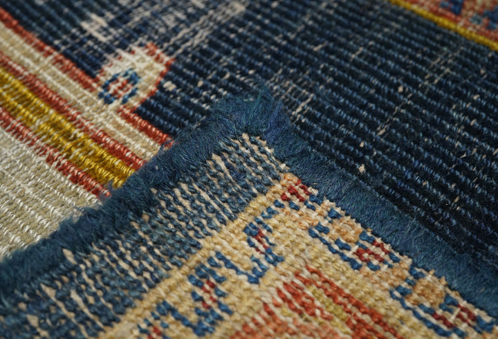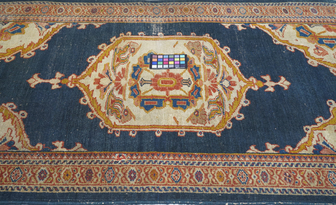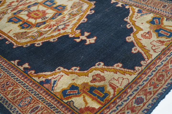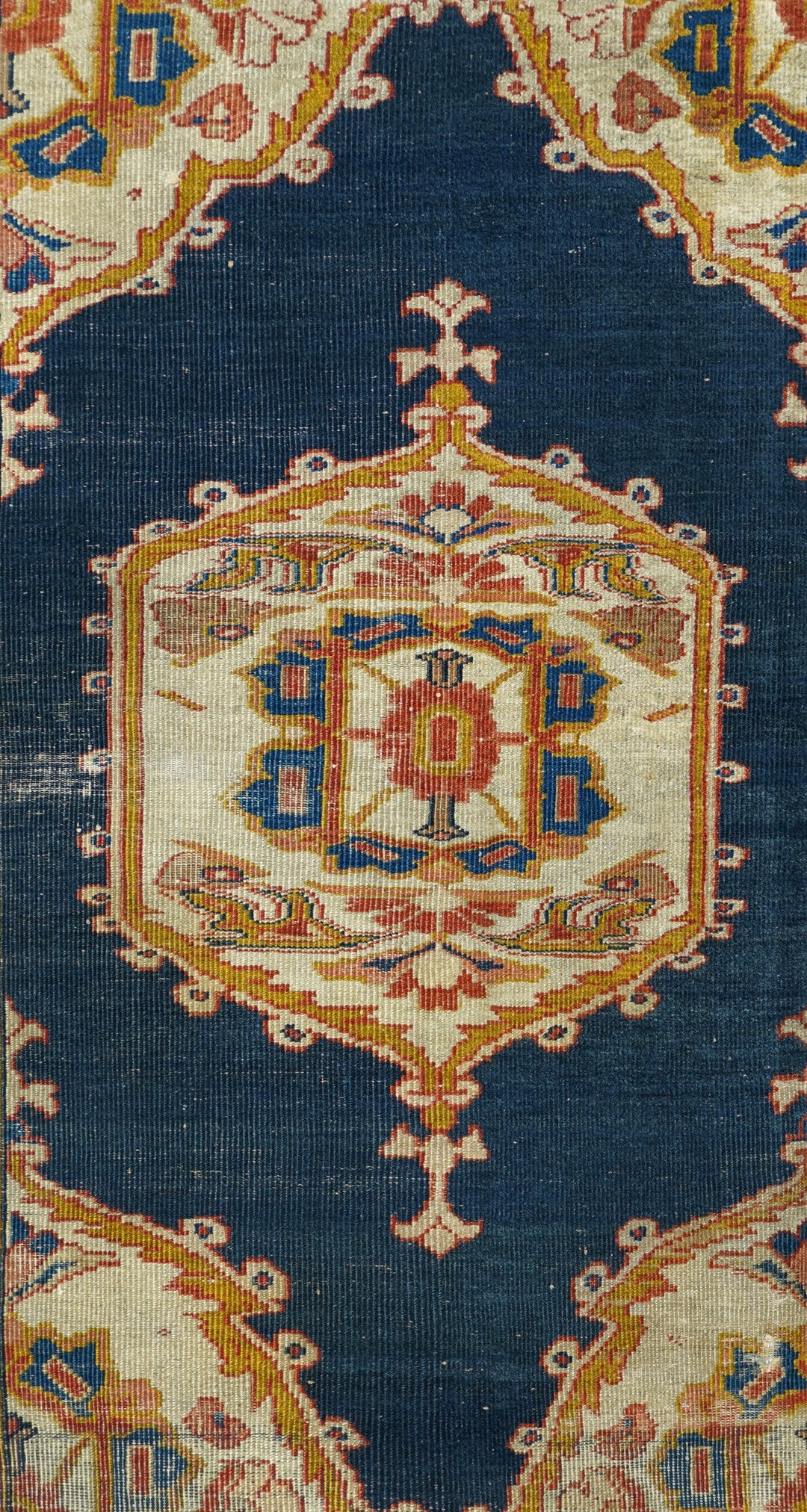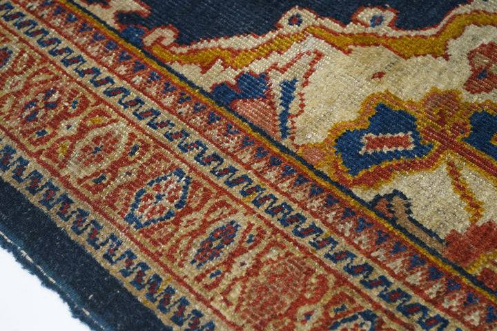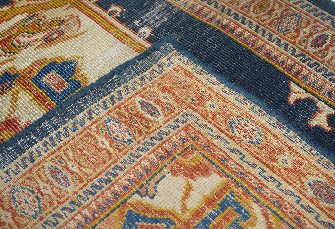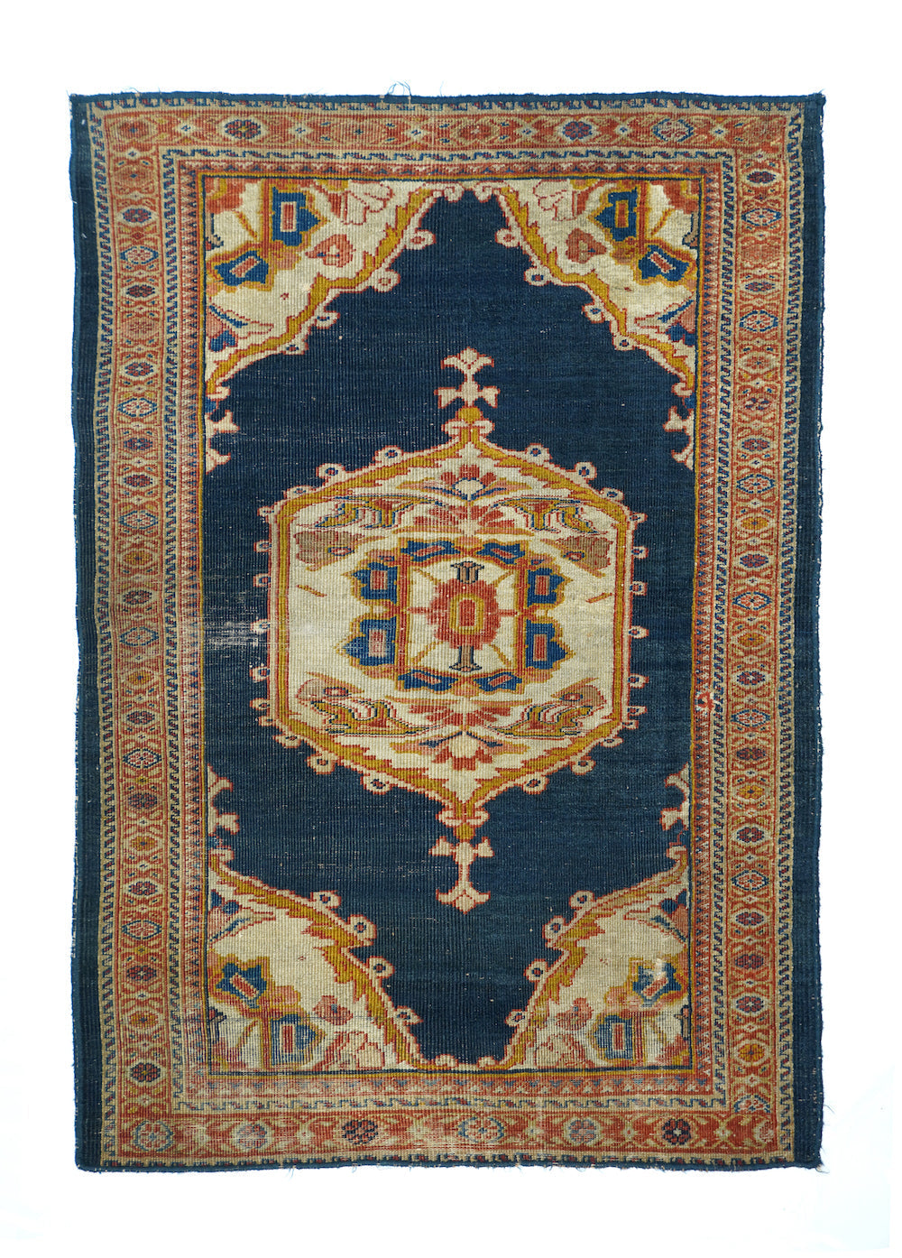 The rustic character of this west Persian, Arak Province scatter is well displayed by the lateral offset in the central soft hexagonal sand medallion, and in the variation among the semi-en suite corner pieces. Deep indigo open field with spot wear. Rosettes decorate rust strip-style main border. Coarse/moderate weave. Fair condition with visible end reduction. Withal issues, still a charming, authentic and rare product of the area.