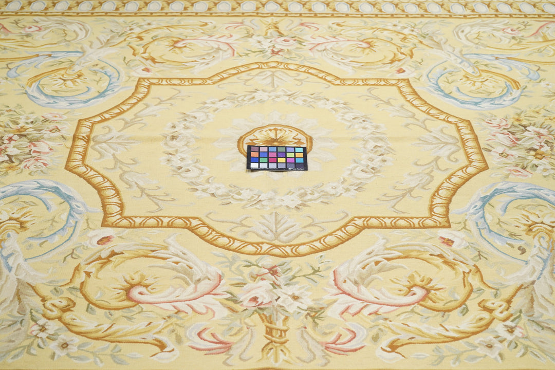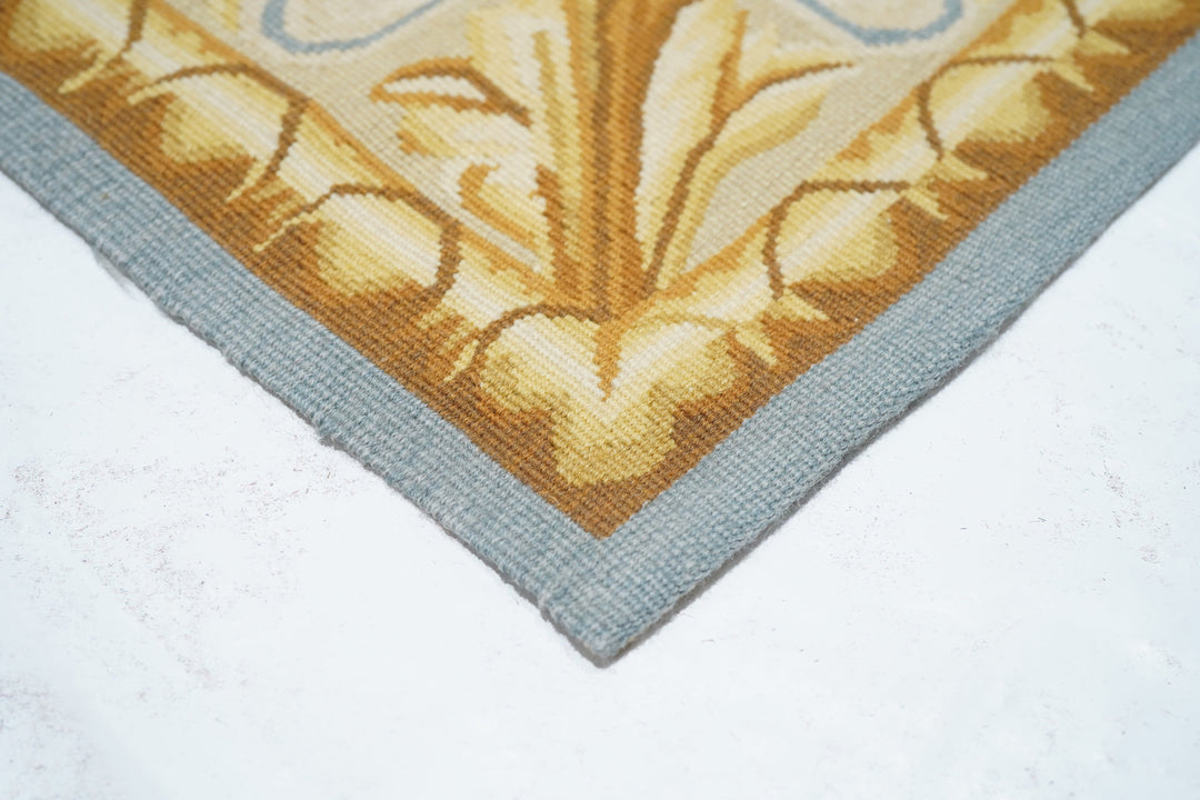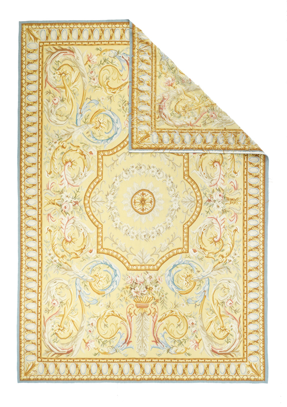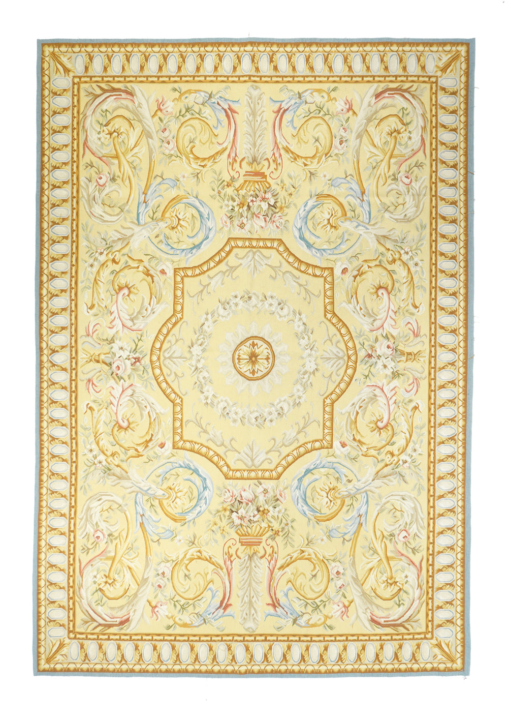 The dark brick field shows 11 offset rows of profile carnations and other stylized fringed flowers. At the centres of the sides and ends are bubbles displaying birds among verdant flowers. Main interrupted acanthus border. Outer stripe of bosses. Wool pattern wefts.