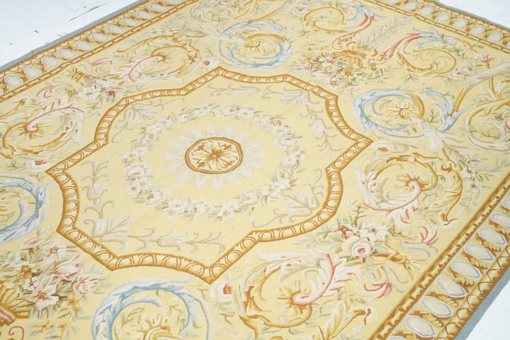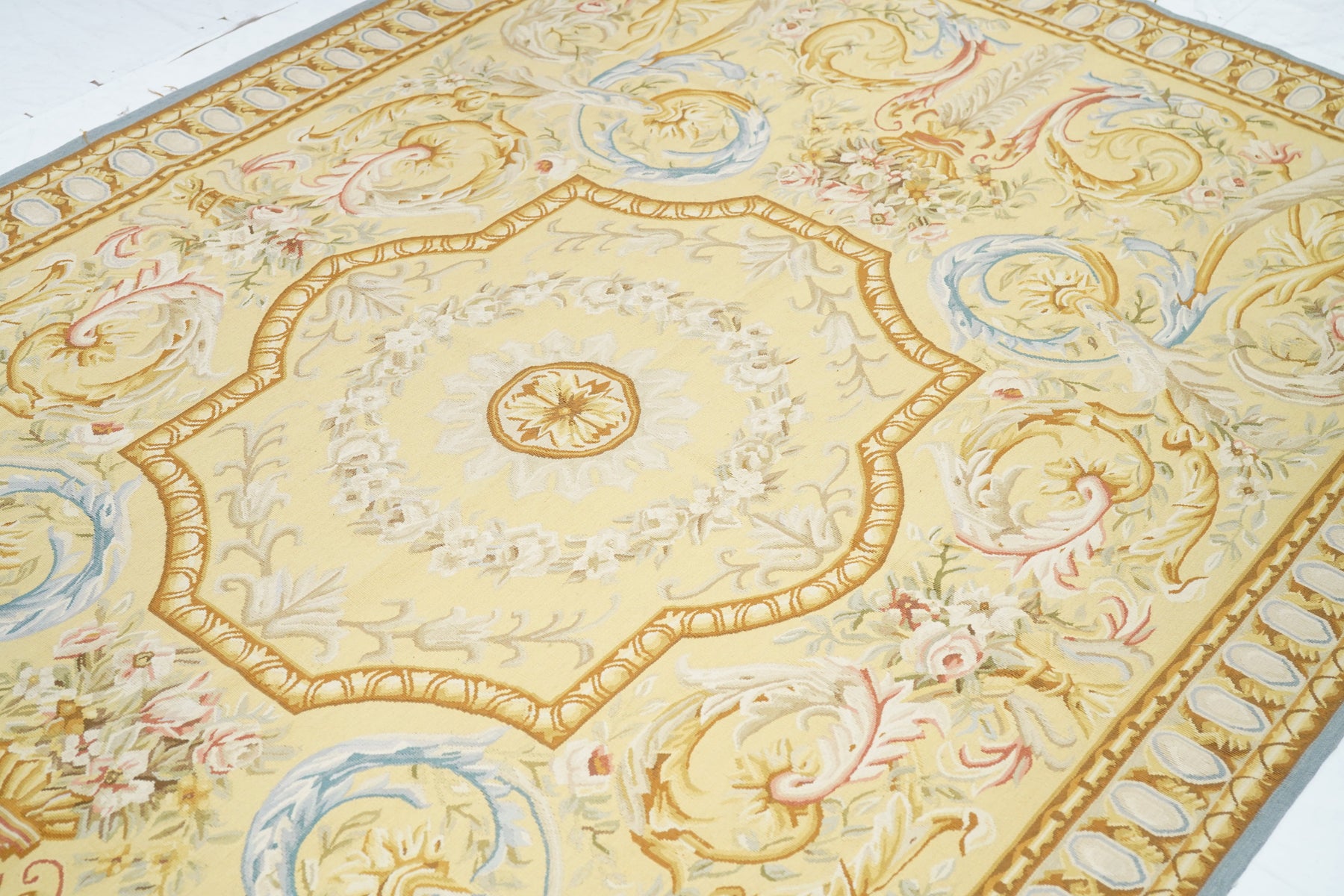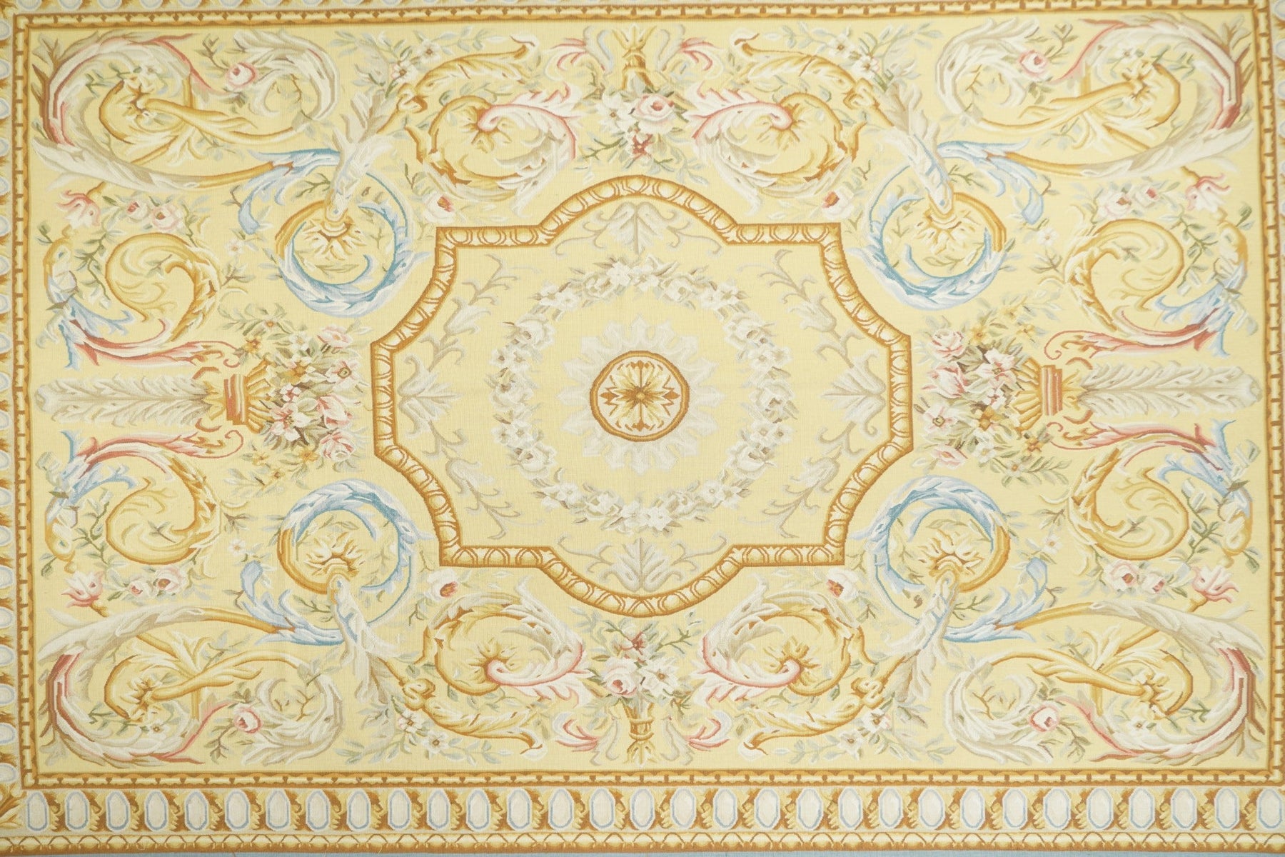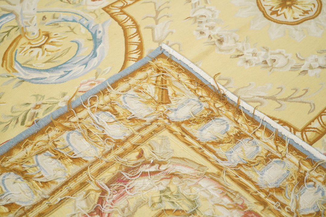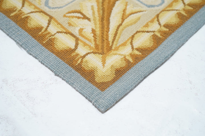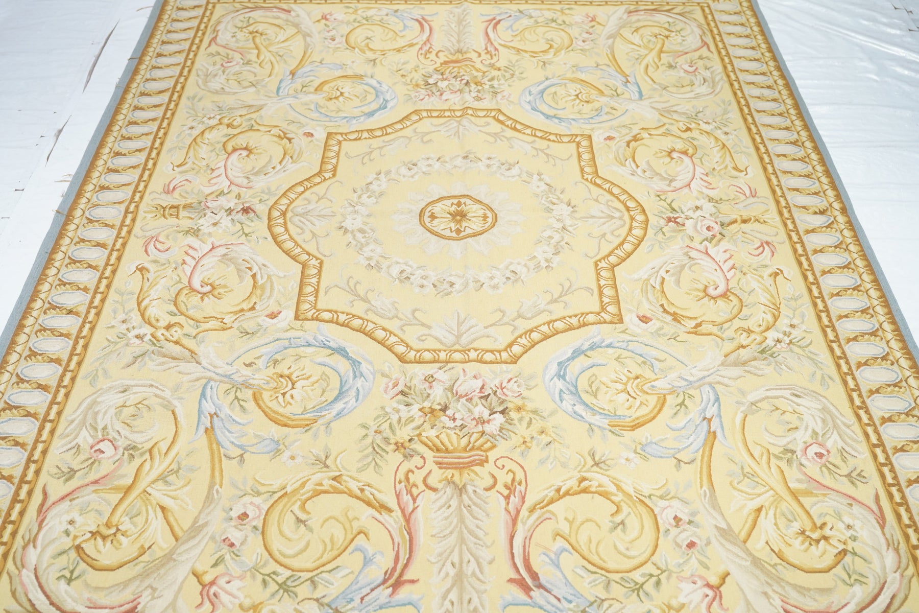 The dark brick field shows 11 offset rows of profile carnations and other stylized fringed flowers. At the centres of the sides and ends are bubbles displaying birds among verdant flowers. Main interrupted acanthus border. Outer stripe of bosses. Wool pattern wefts.