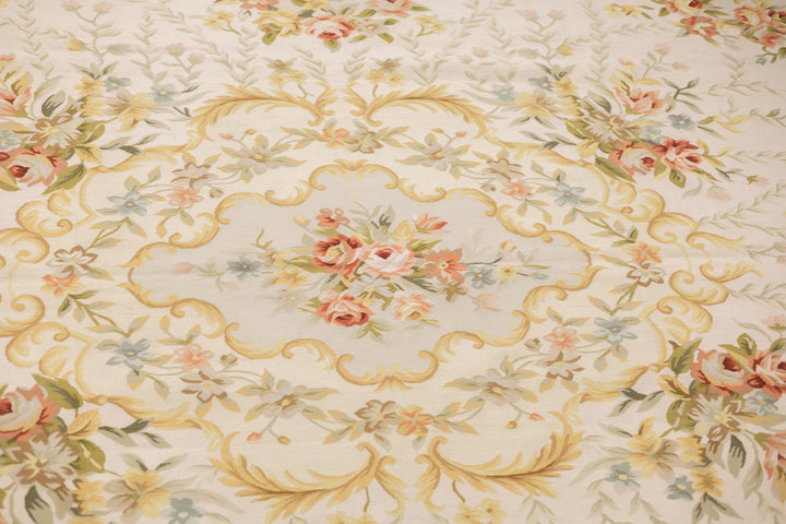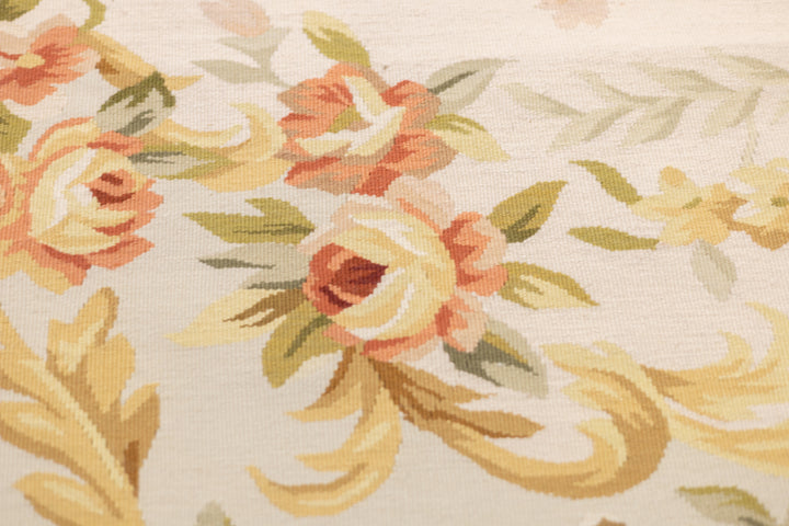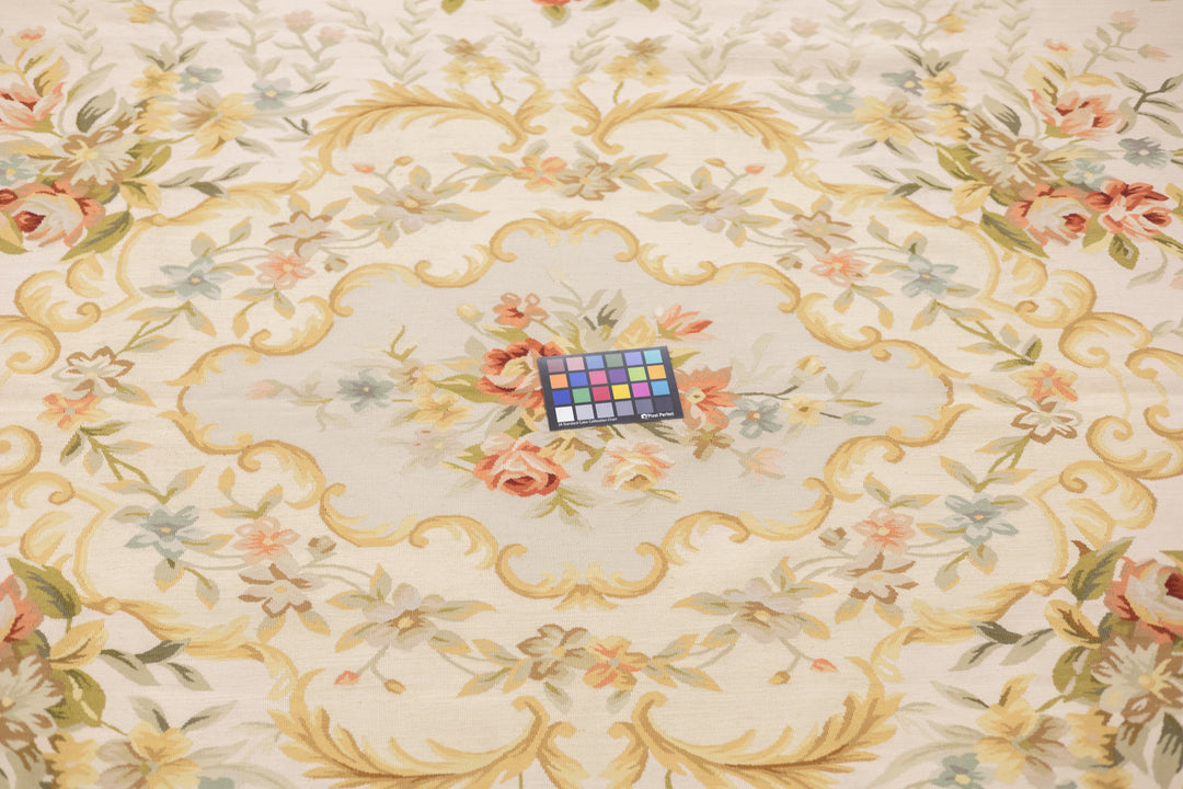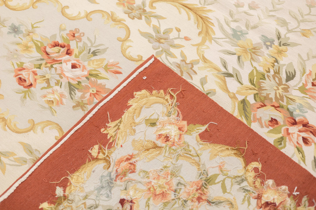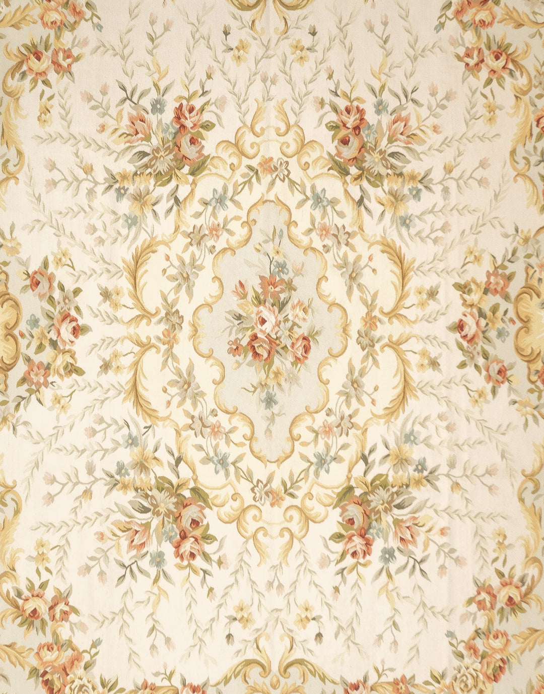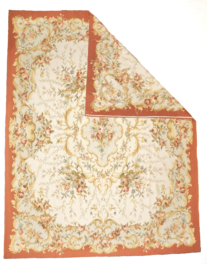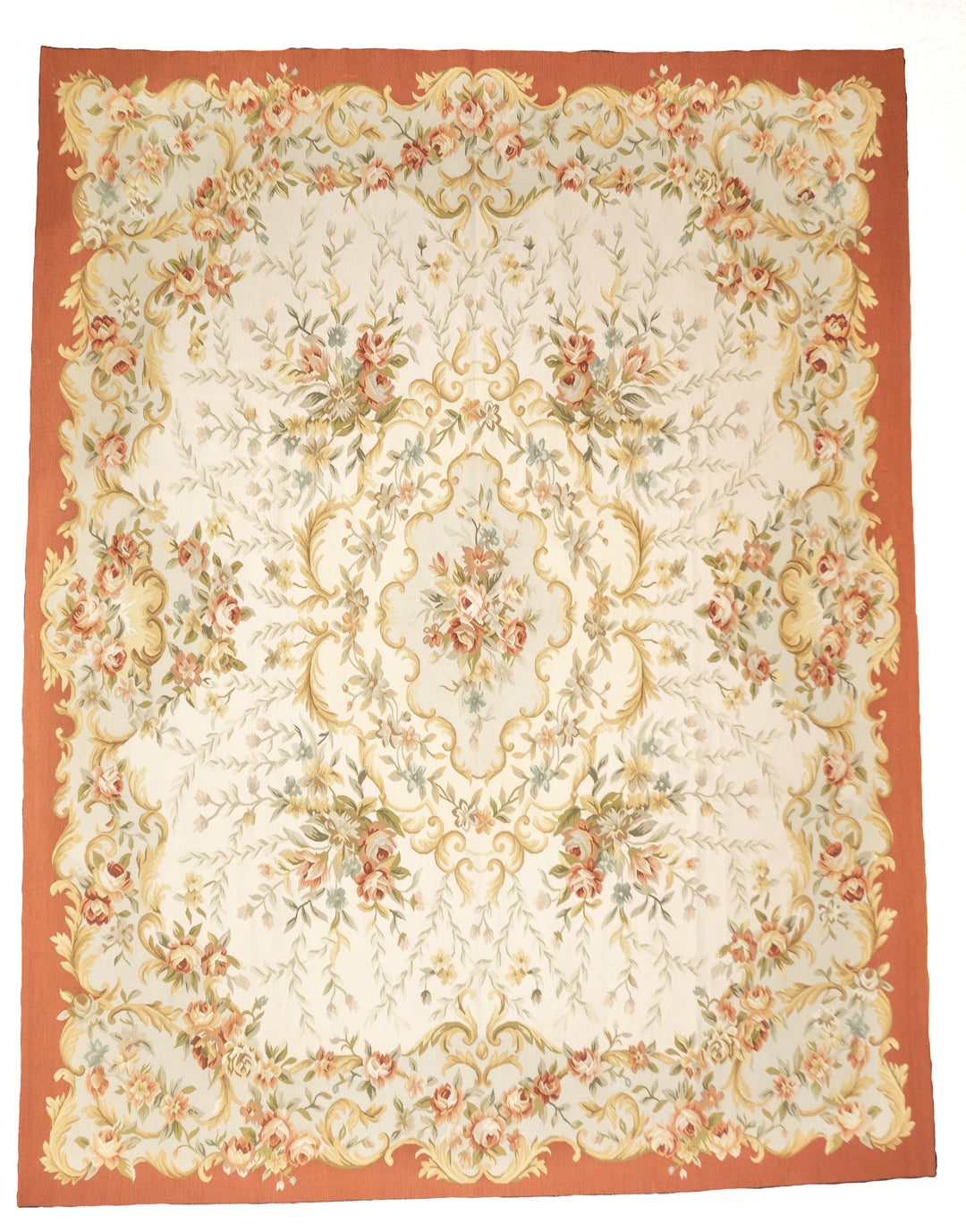Refers generally to recent carpets in tapestry technique and inspired by French Aubusson designs of the 18th and later centuries. Geometric or semi-floral. Scatters to room sizes. Recent pieces are usually Indian. Wool pattern wefts. Inexpensive to moderate