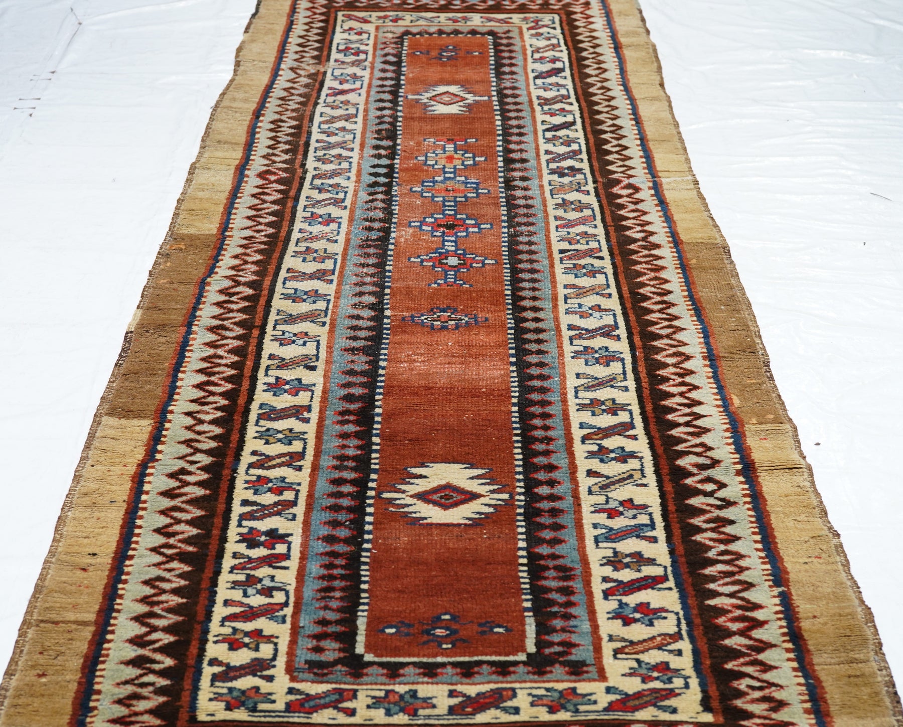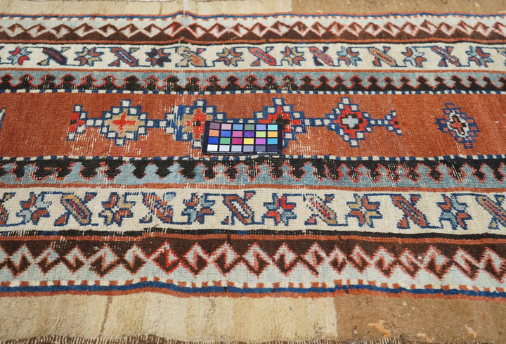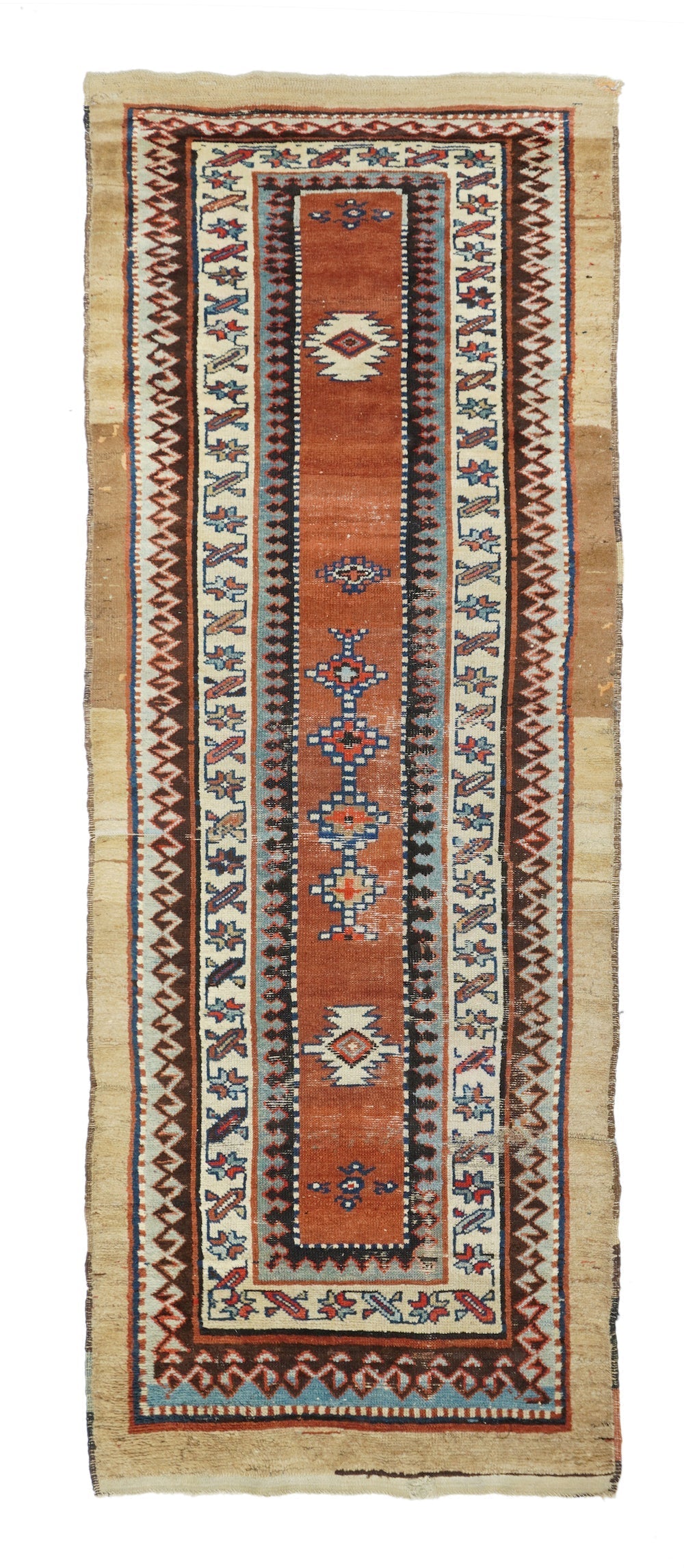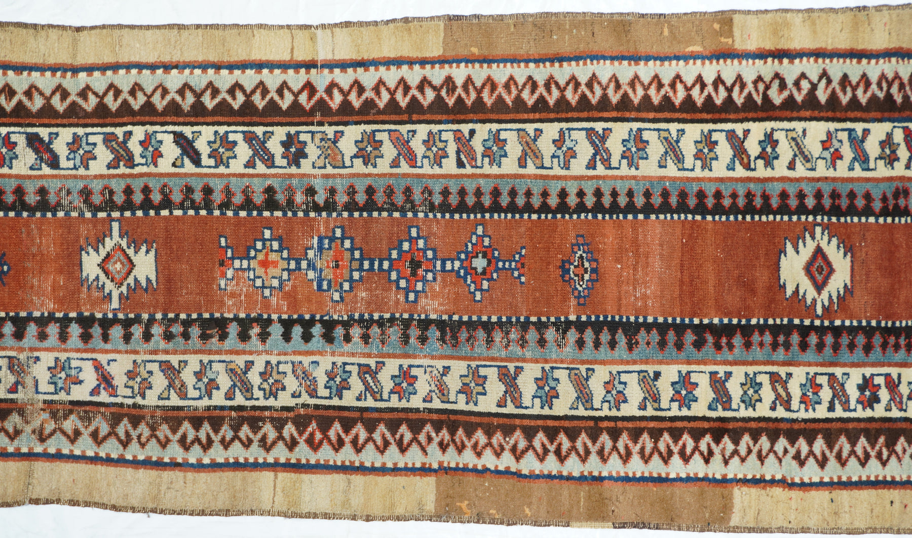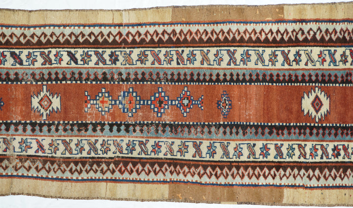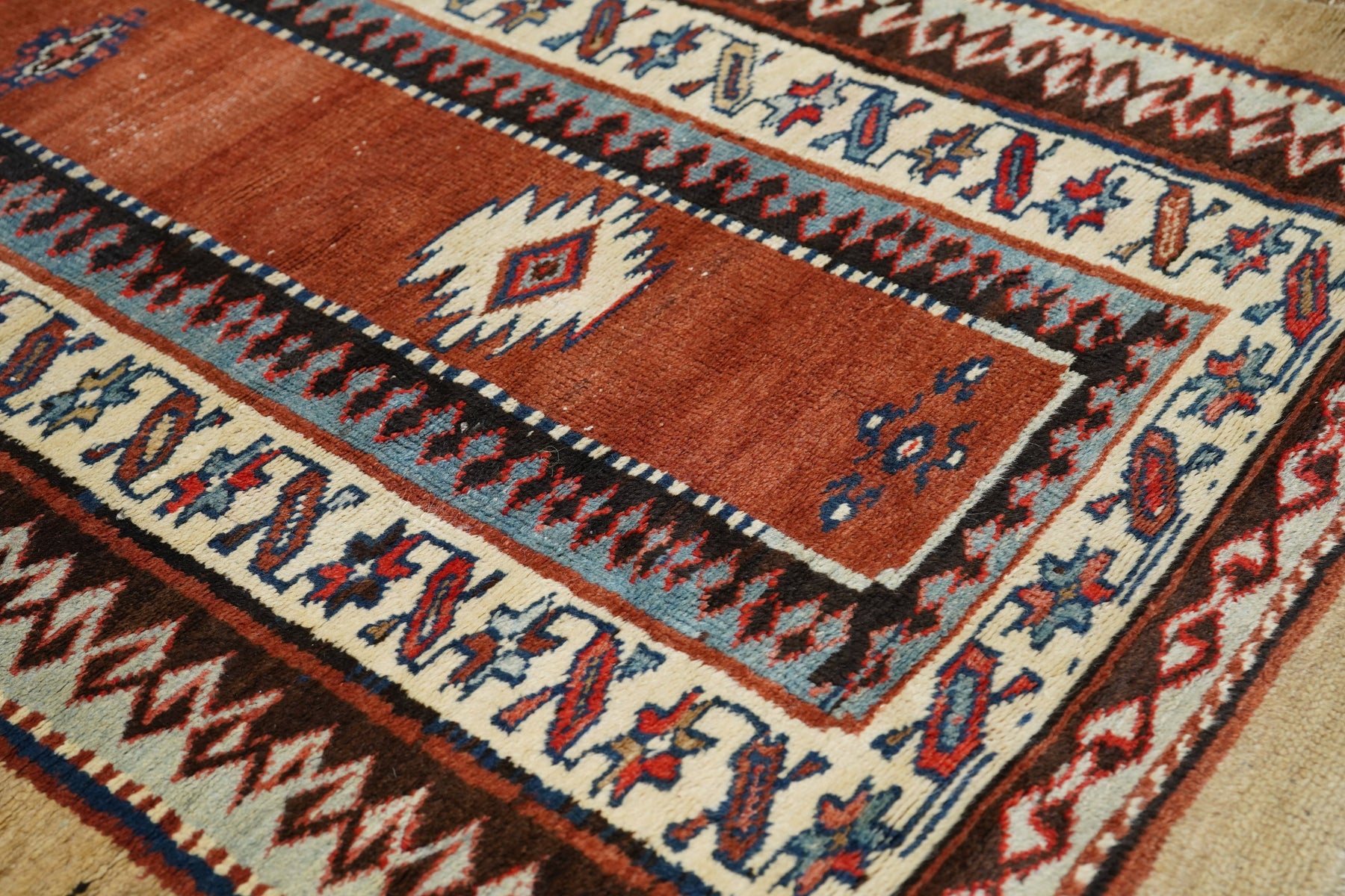 In the Talish mode with a narrow madder field displaying a short pole medallion and two ivory ashiks. Main border of stars and diagonal bars. Wool foundation. Moderate weave. Good condition with full width camel outer surround. Very unusual look.