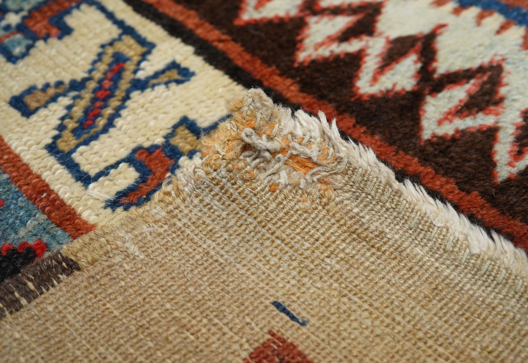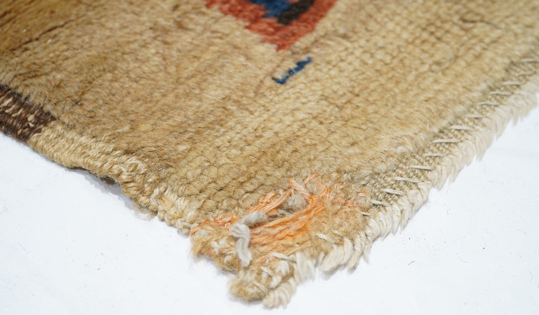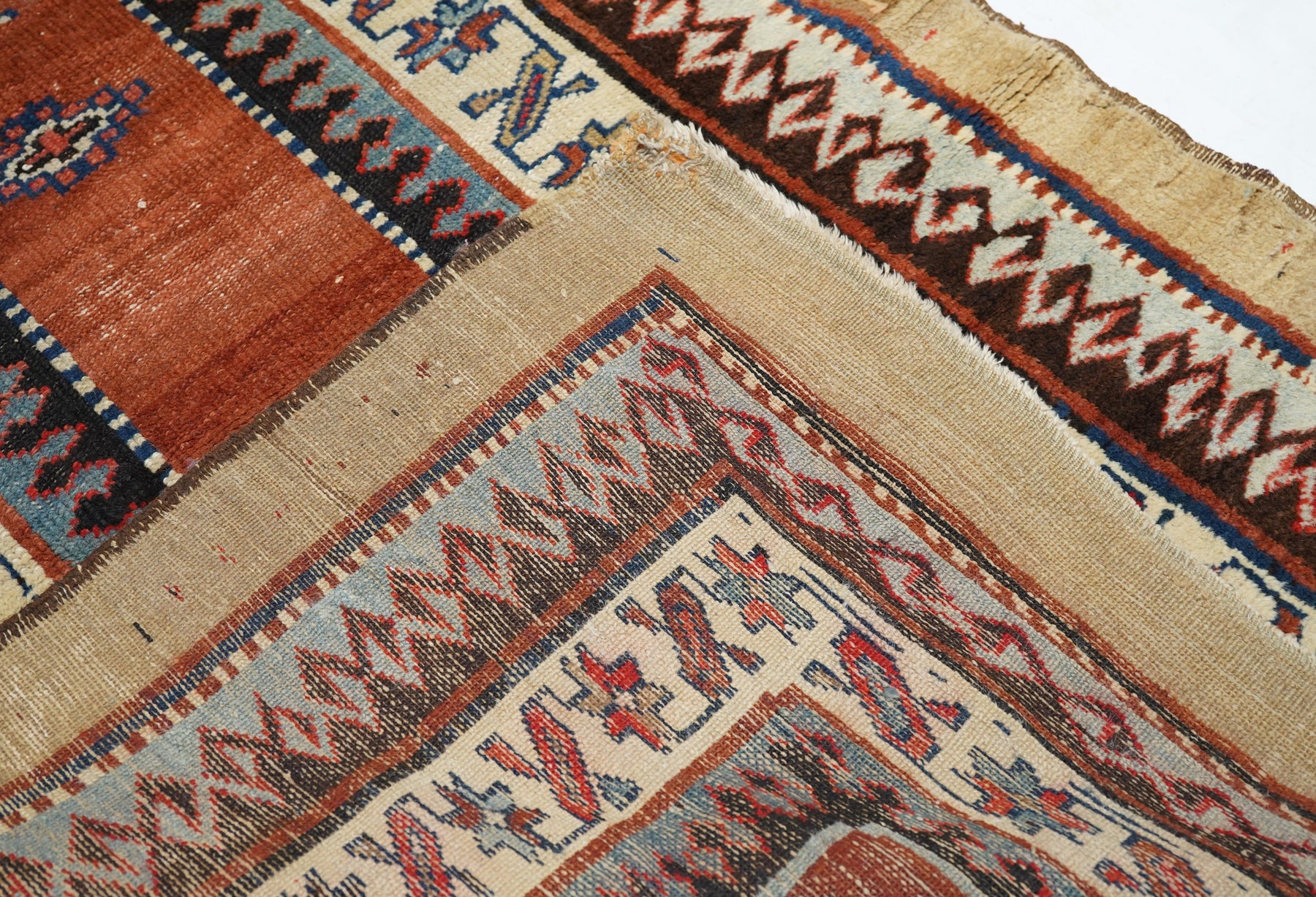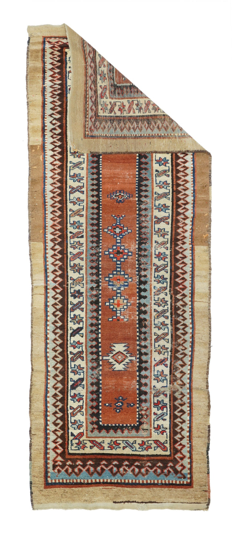 In the Talish mode with a narrow madder field displaying a short pole medallion and two ivory ashiks. Main border of stars and diagonal bars. Wool foundation. Moderate weave. Good condition with full width camel outer surround. Very unusual look.