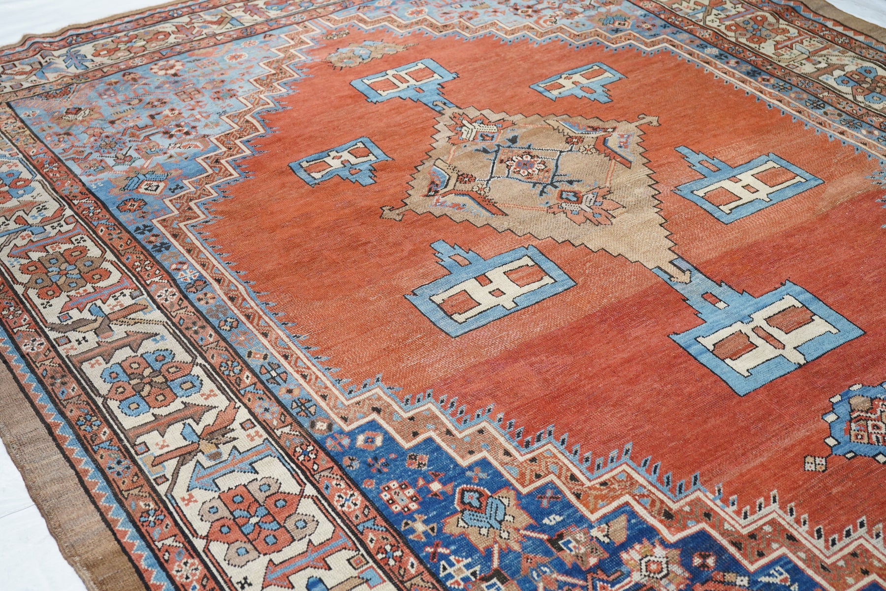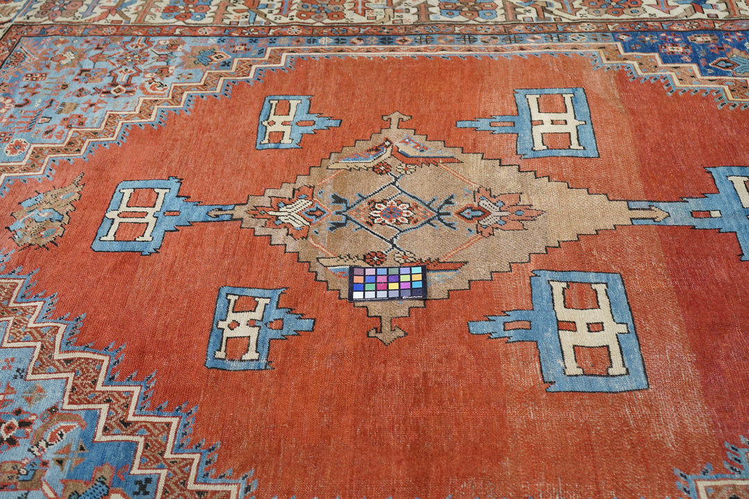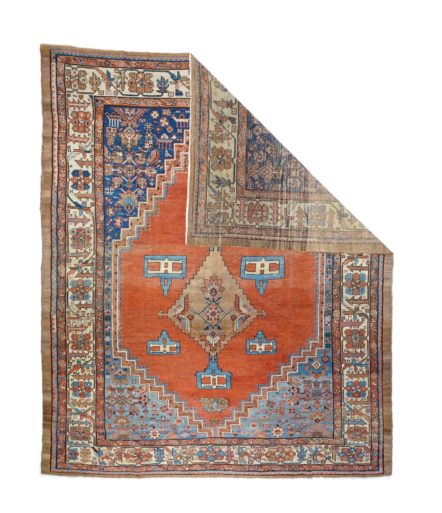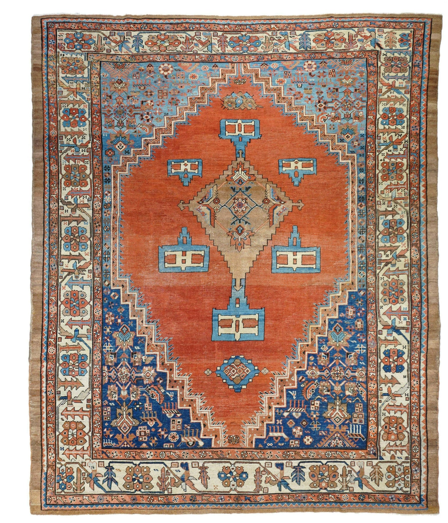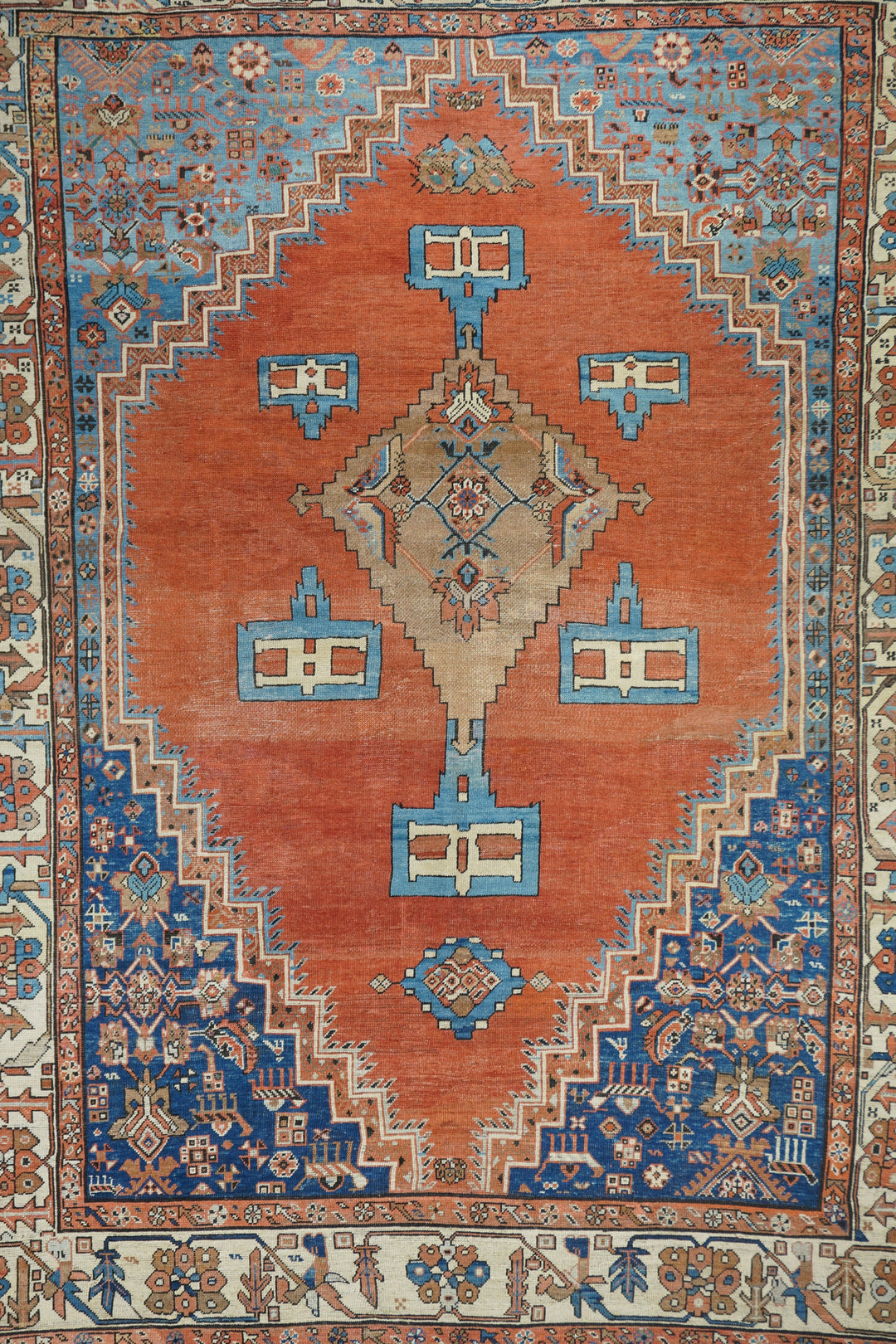 Antique Bakshayesh Rug 8'7'' x 11'1''. This C. 1880 carpet shows an amusingly downset rust subfield, on an abrashed light to medium blue field, enlarging to Herati and animal corners. Giant Herati nodule fills the centre of the stepped salmon medallion. Six rectangular light blue and cream pendants or floating ornaments. Cream Zanbaki border of polychrome rosettes and tilted irises, on a S-pattern broken meander. Natural dyes including indigo and madder. Moderate weave.
