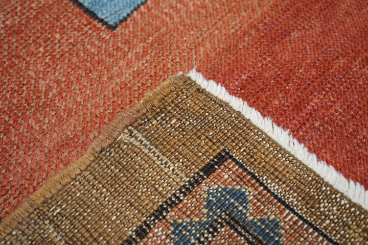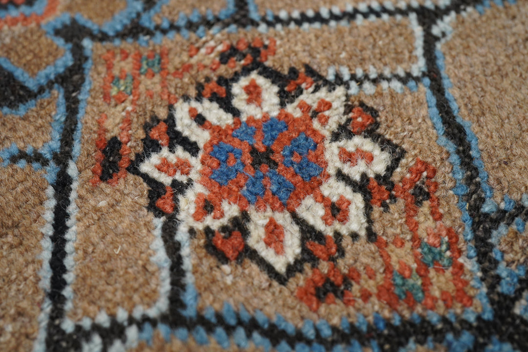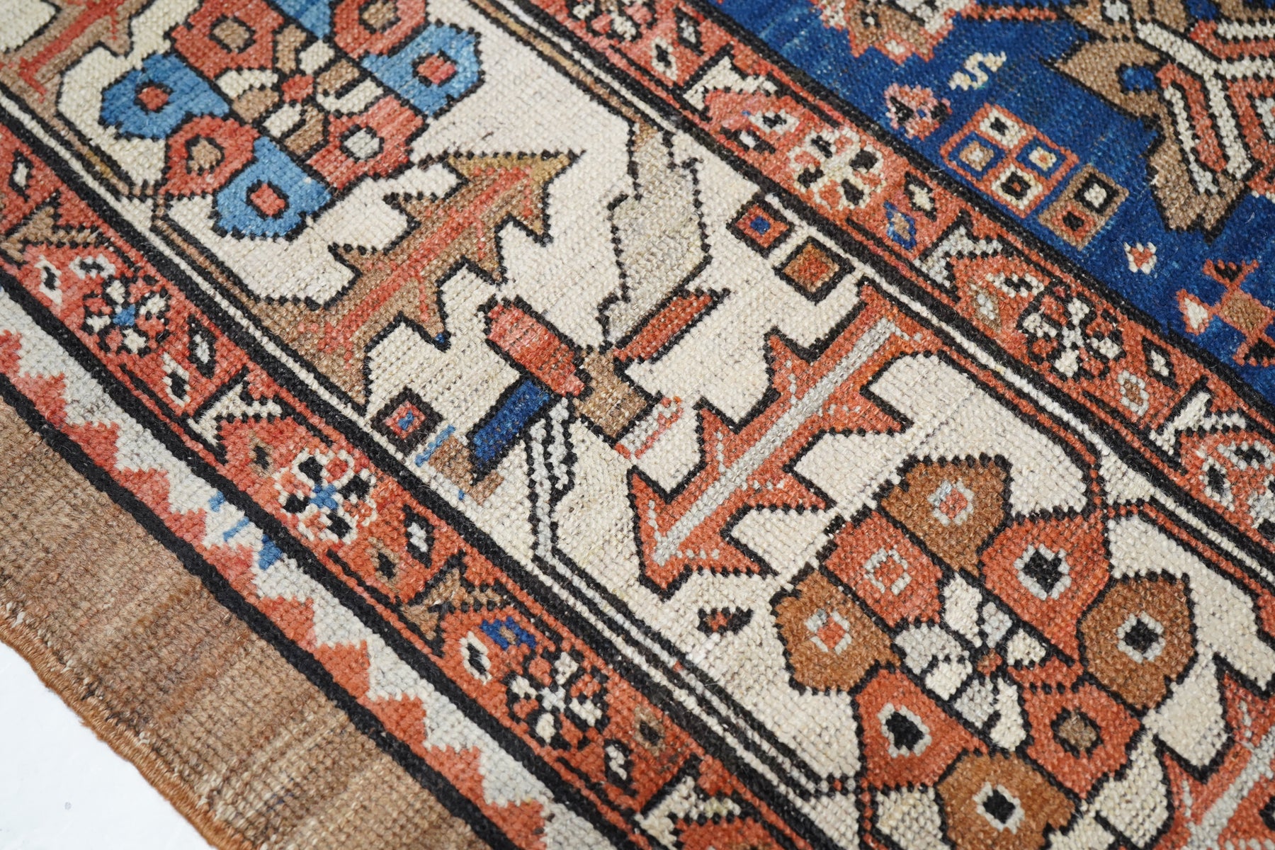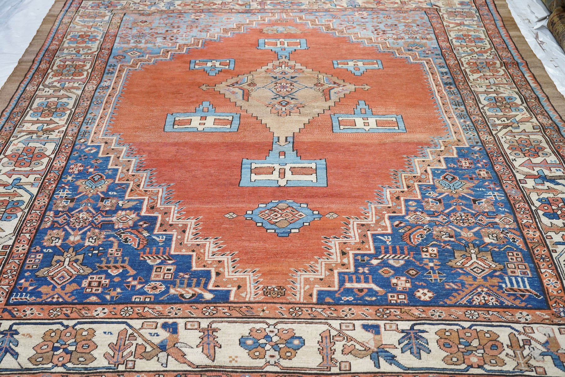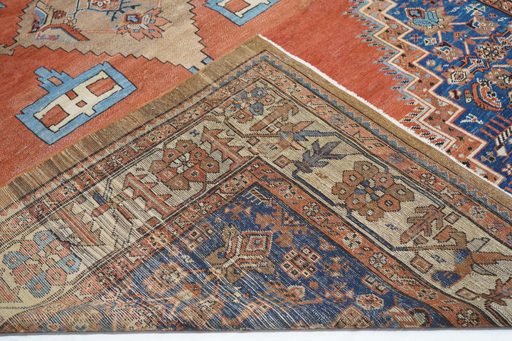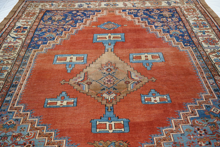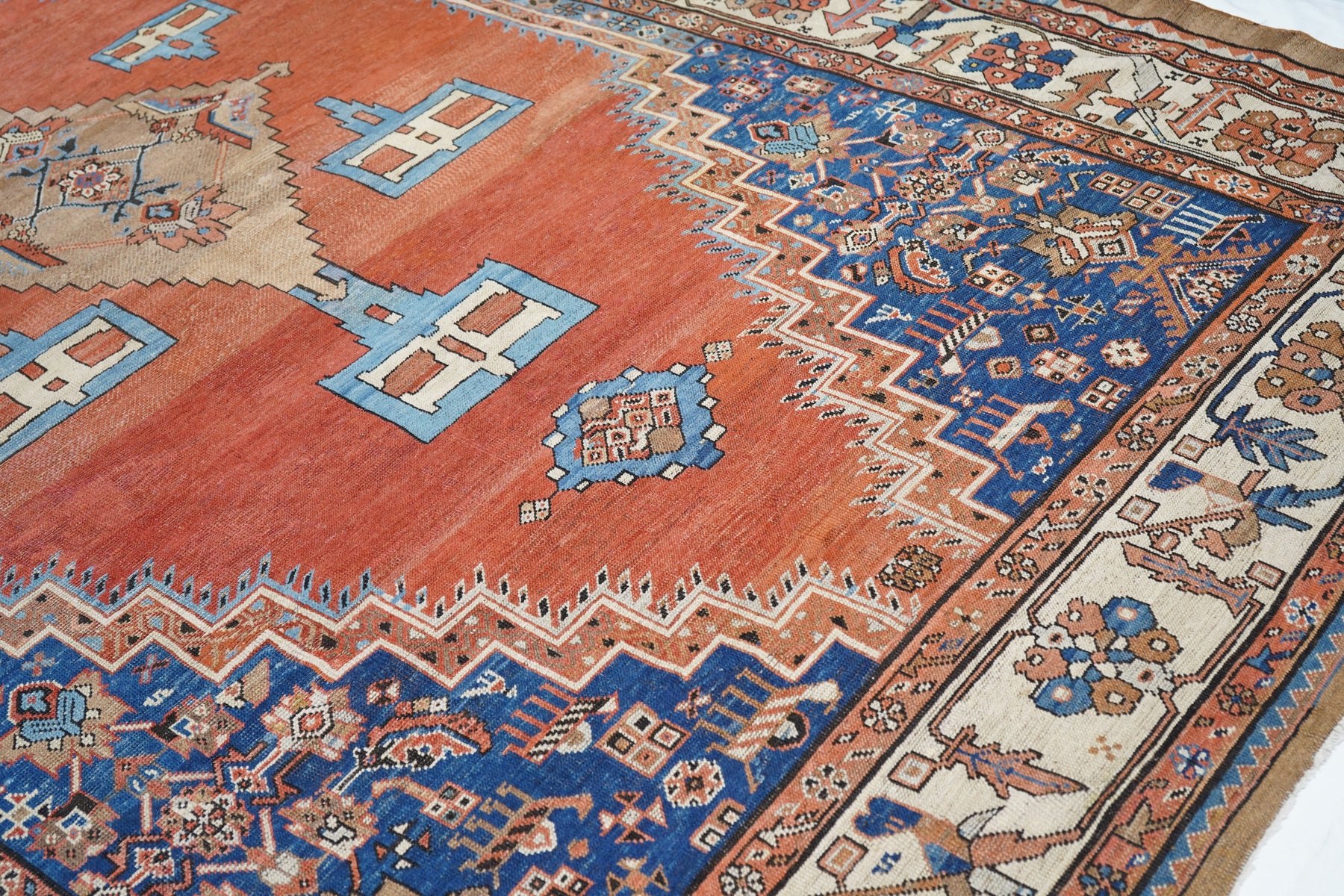Antique Bakshayesh Rug 8'7'' x 11'1''. This C. 1880 carpet shows an amusingly downset rust subfield, on an abrashed light to medium blue field, enlarging to Herati and animal corners. Giant Herati nodule fills the centre of the stepped salmon medallion. Six rectangular light blue and cream pendants or floating ornaments. Cream Zanbaki border of polychrome rosettes and tilted irises, on a S-pattern broken meander. Natural dyes including indigo and madder. Moderate weave.