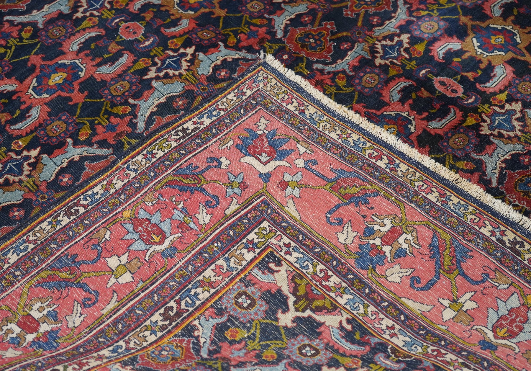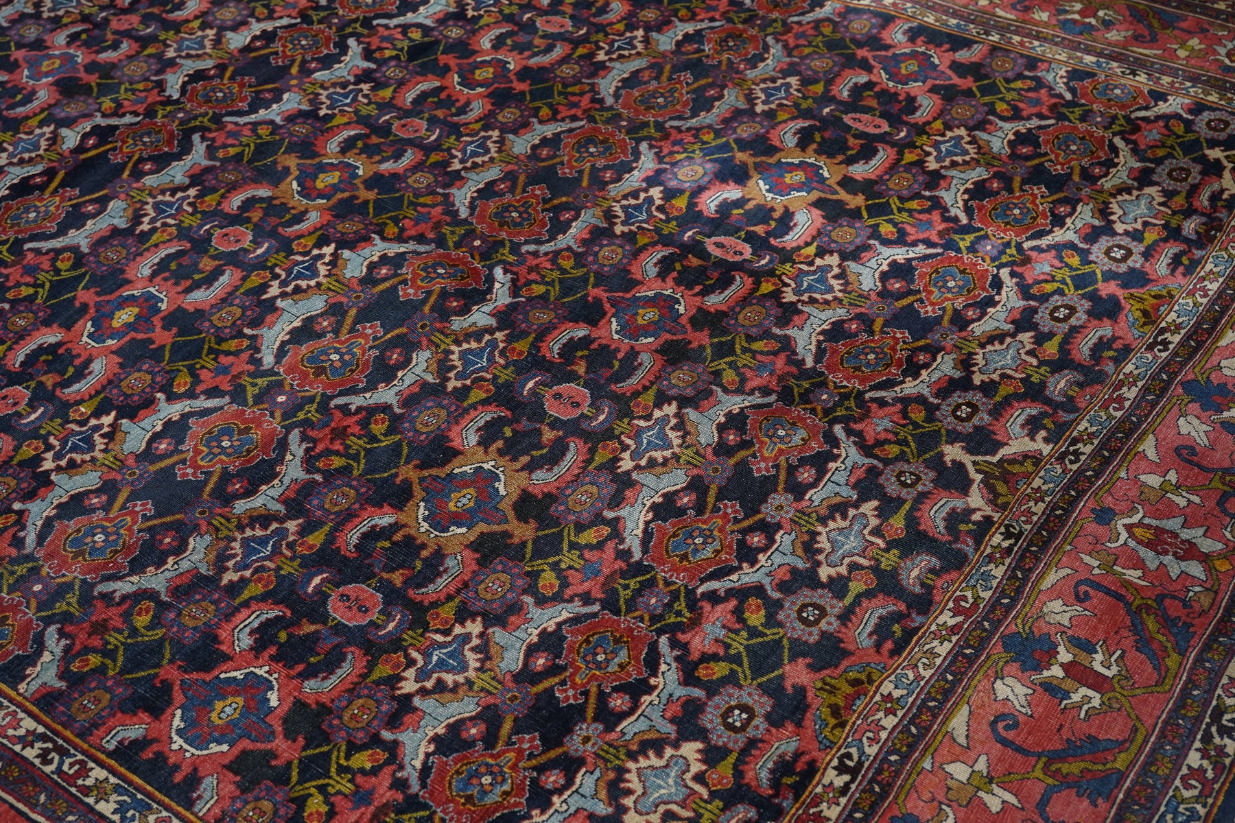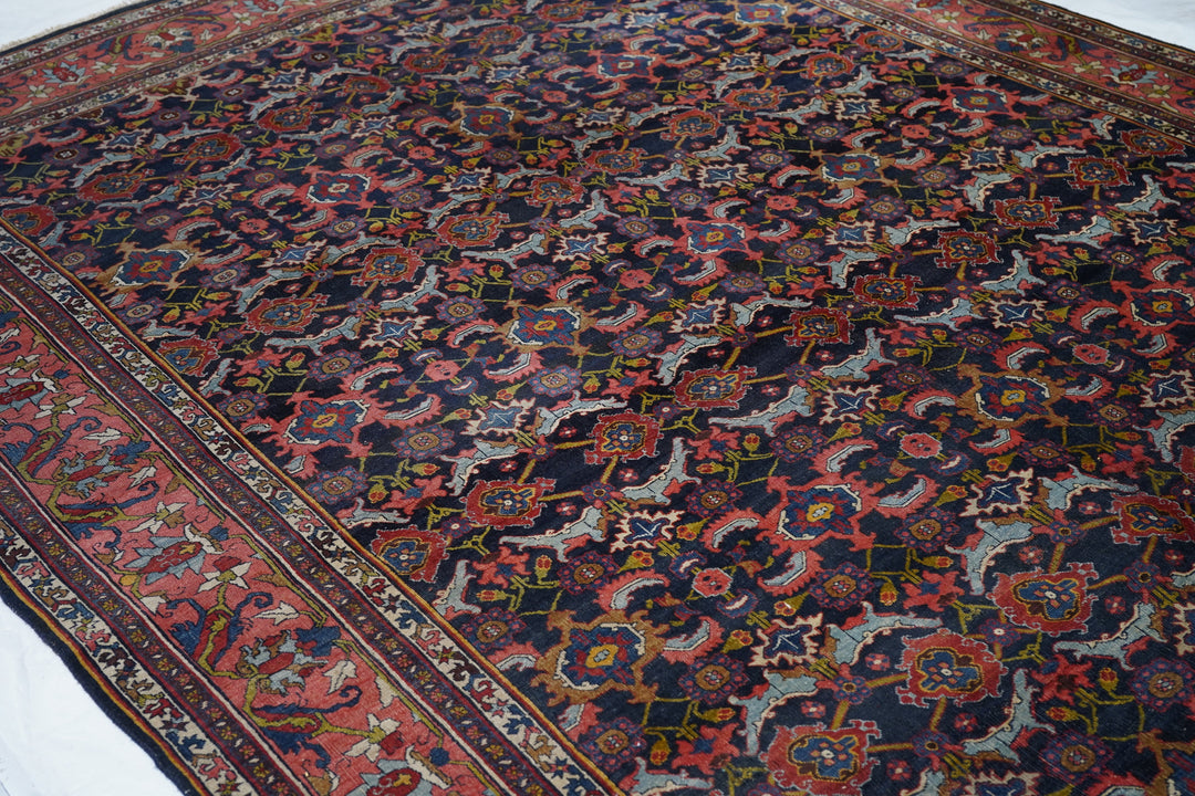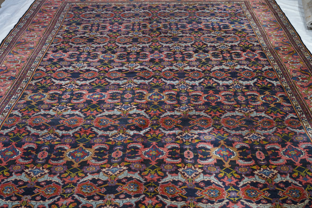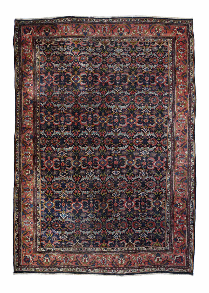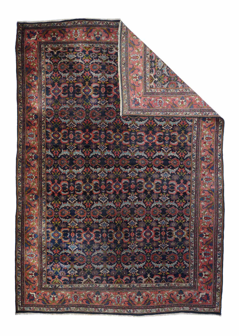 This incredibly compact and solid Kurdish town weaving pairs of rose palmettes, with jagged curled leaves and “turtle” medallions in rows between. Nearly a Herati design, but better. Rose-pink border with petal palmettes and hook-ended blue leaves. Ivory connected S “dragon vine” minors. Excellent wool. Medium-fine weave. Cotton foundation. Good condition. Beautiful carpet.