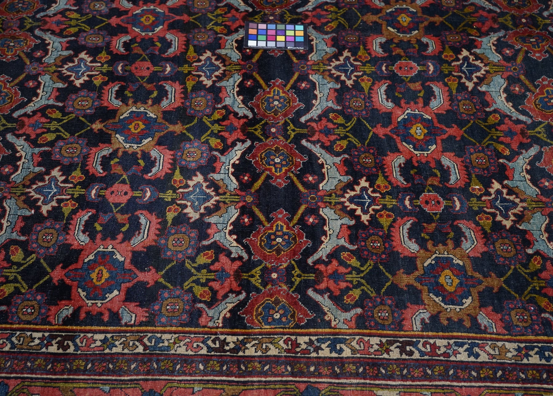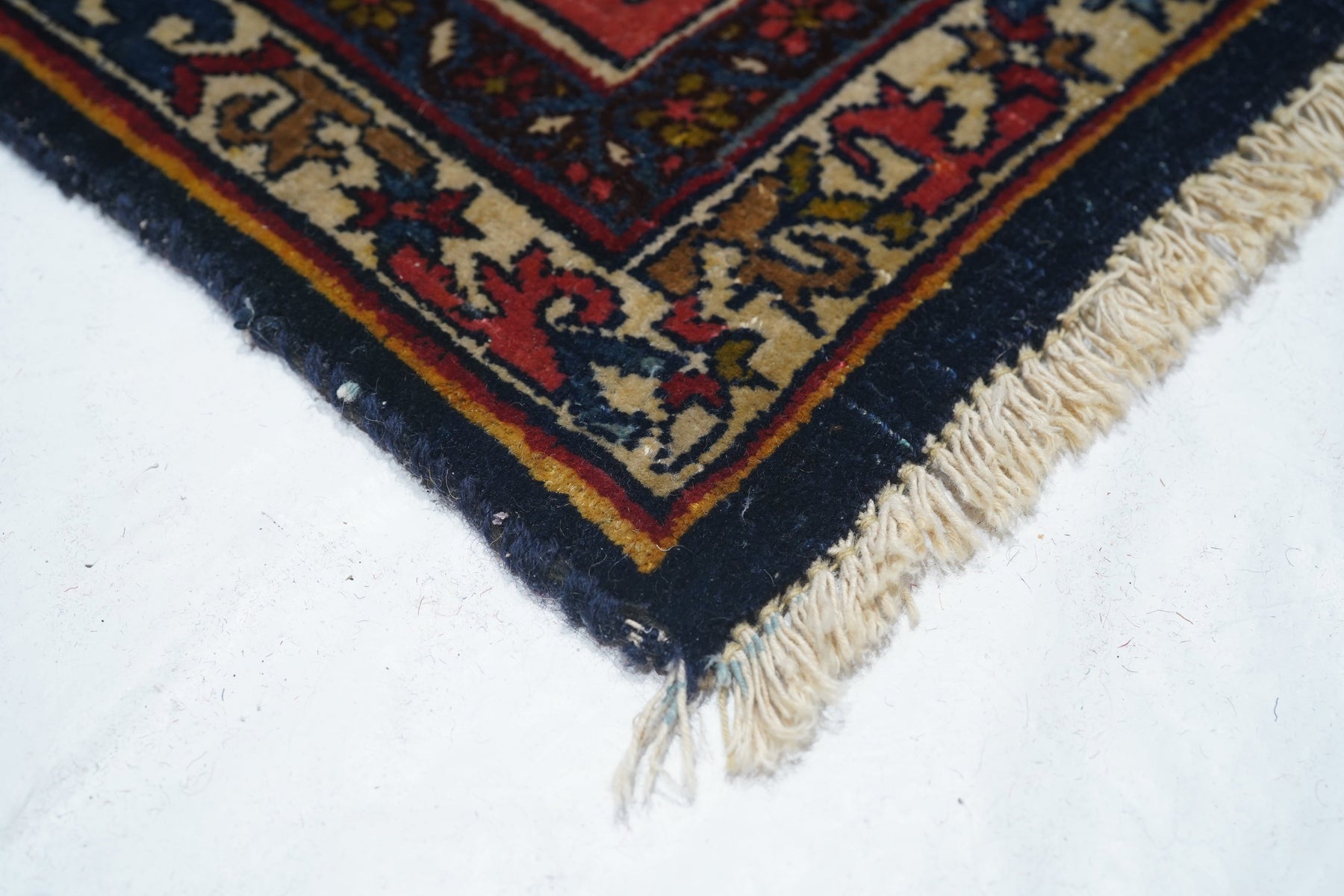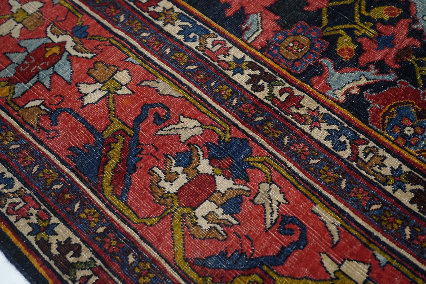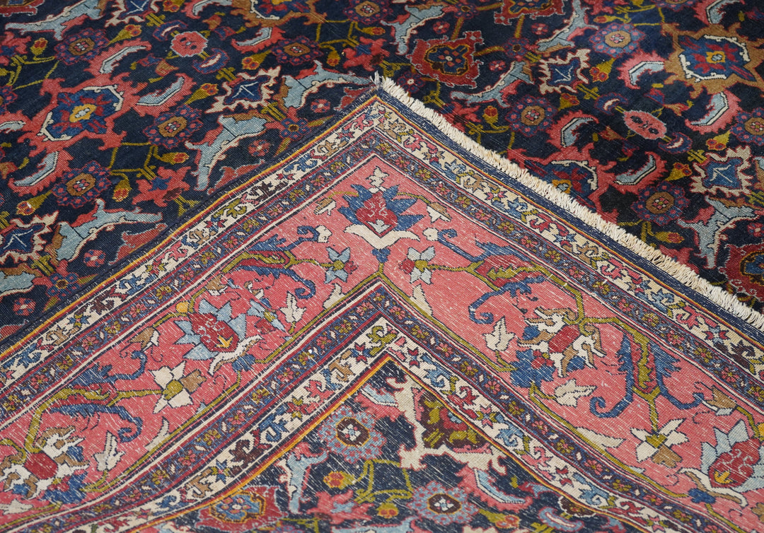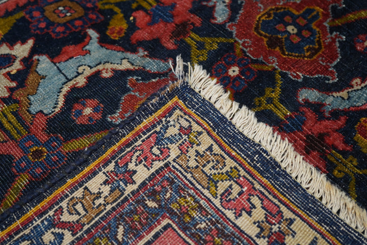 This incredibly compact and solid Kurdish town weaving pairs of rose palmettes, with jagged curled leaves and “turtle” medallions in rows between. Nearly a Herati design, but better. Rose-pink border with petal palmettes and hook-ended blue leaves. Ivory connected S “dragon vine” minors. Excellent wool. Medium-fine weave. Cotton foundation. Good condition. Beautiful carpet.